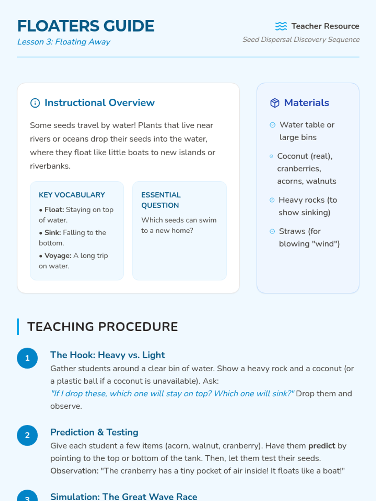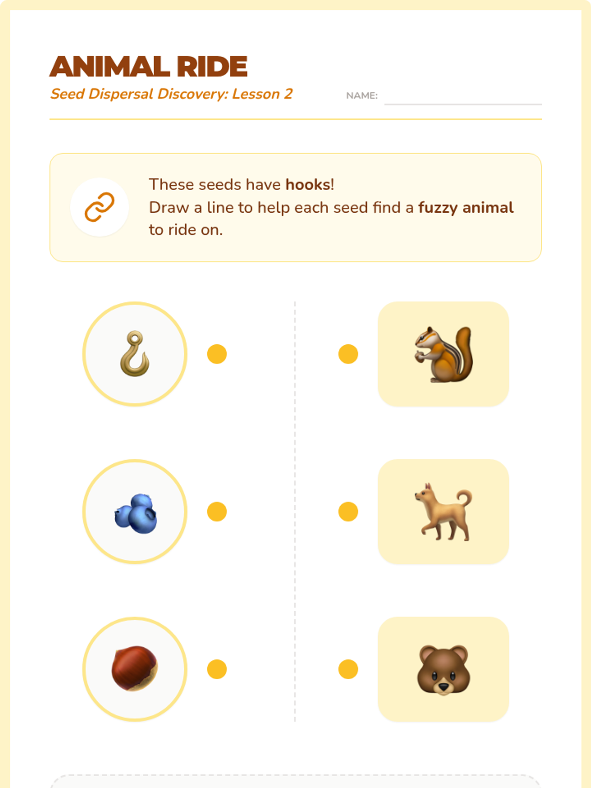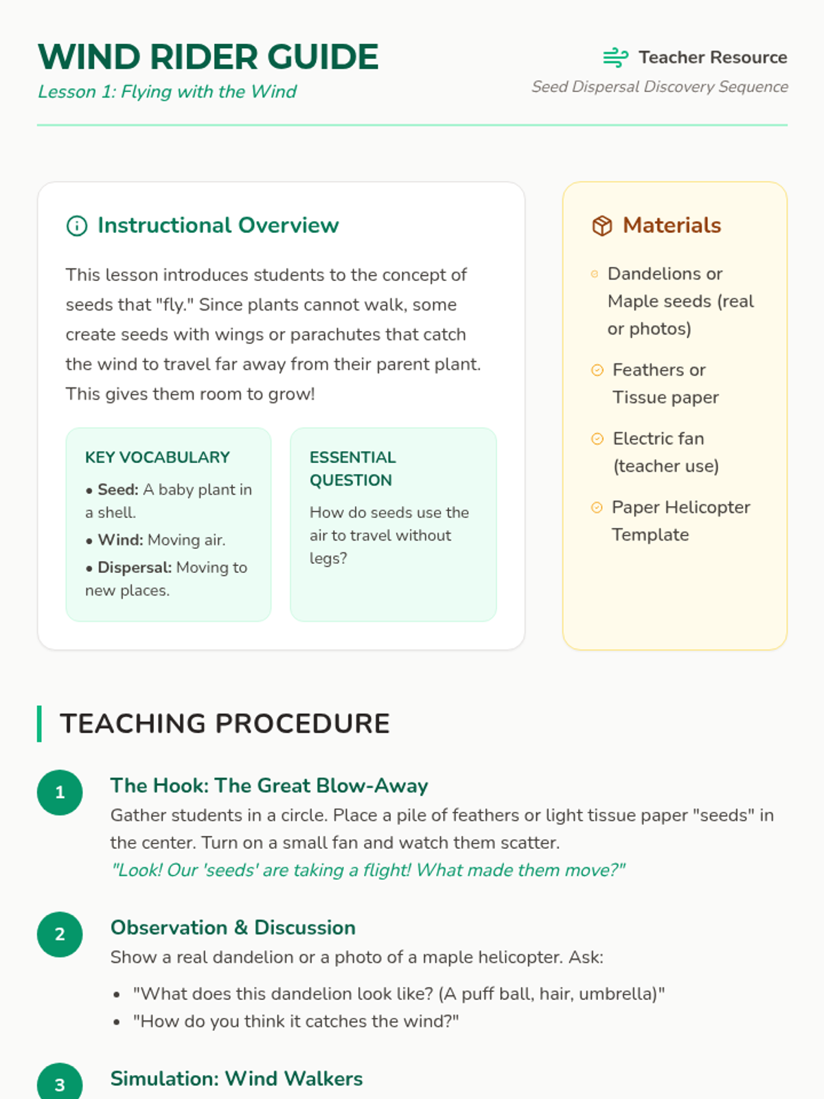 An active, movement-oriented sequence for Pre-K students exploring how plants use wind, water, animals, and 'explosions' to move their seeds. Students engage in gross motor play and nature exploration to understand seed dispersal.