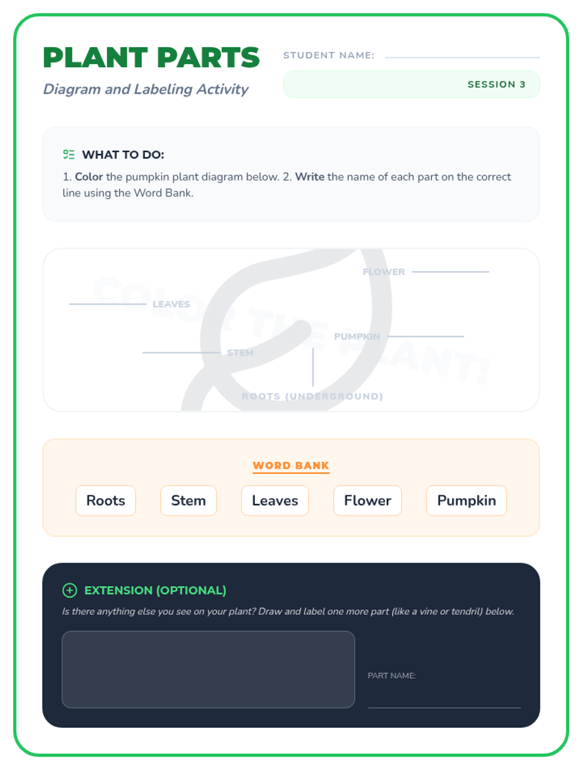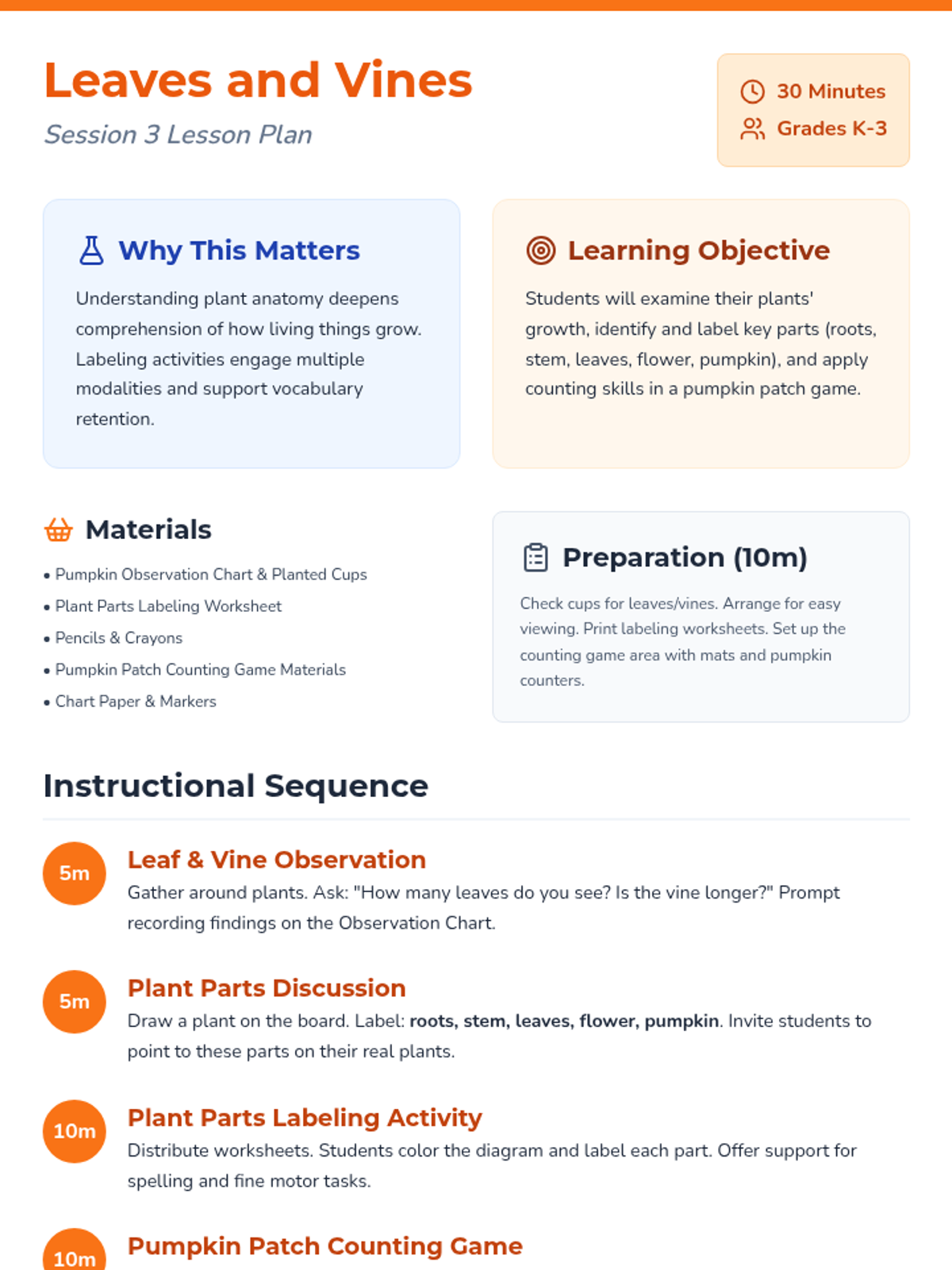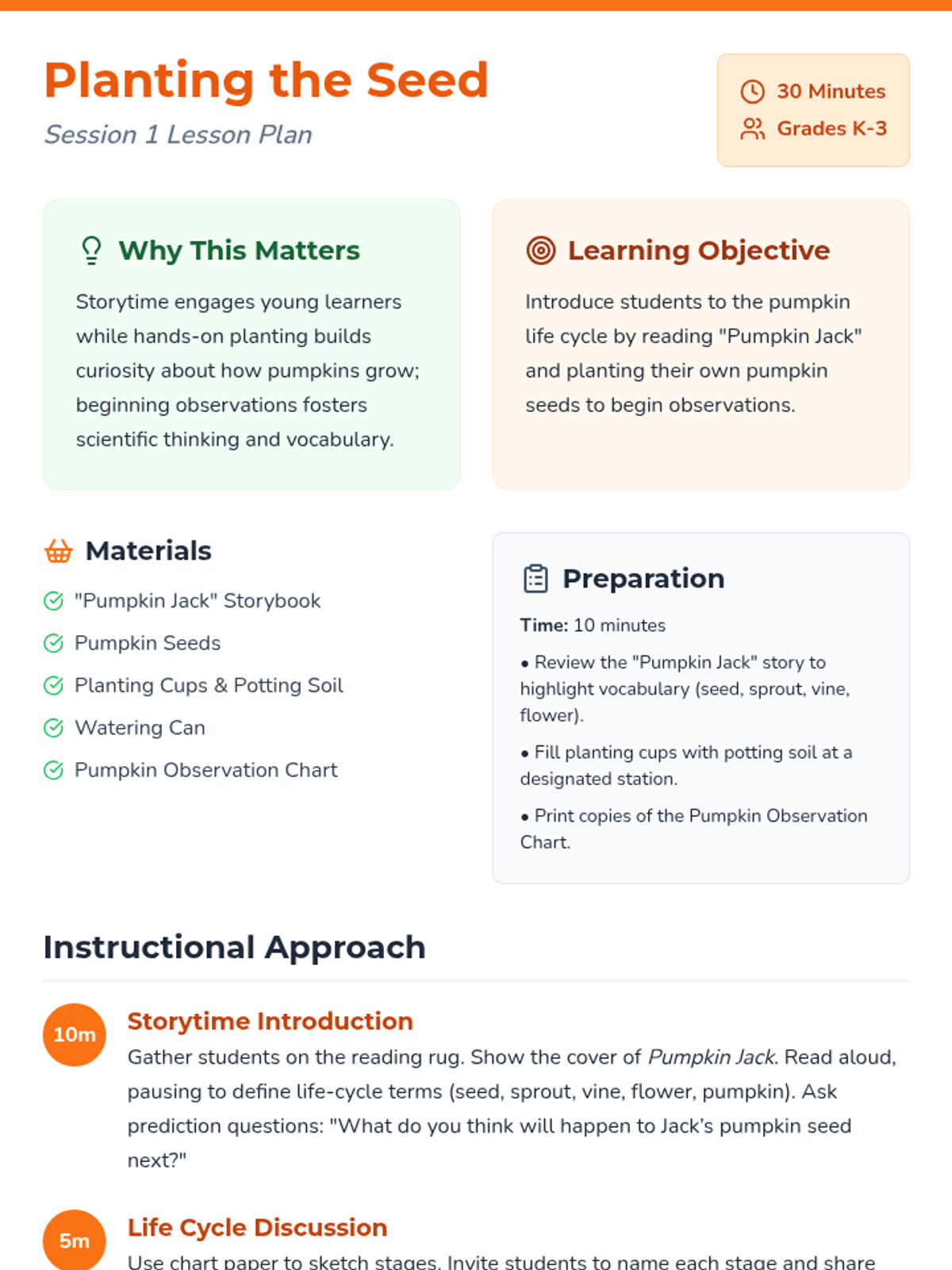 A 3-session sequence for K-3 students to explore the pumpkin life cycle through storytime, planting, art, and games. Students will develop observation skills and scientific vocabulary while watching their own seeds grow into plants.