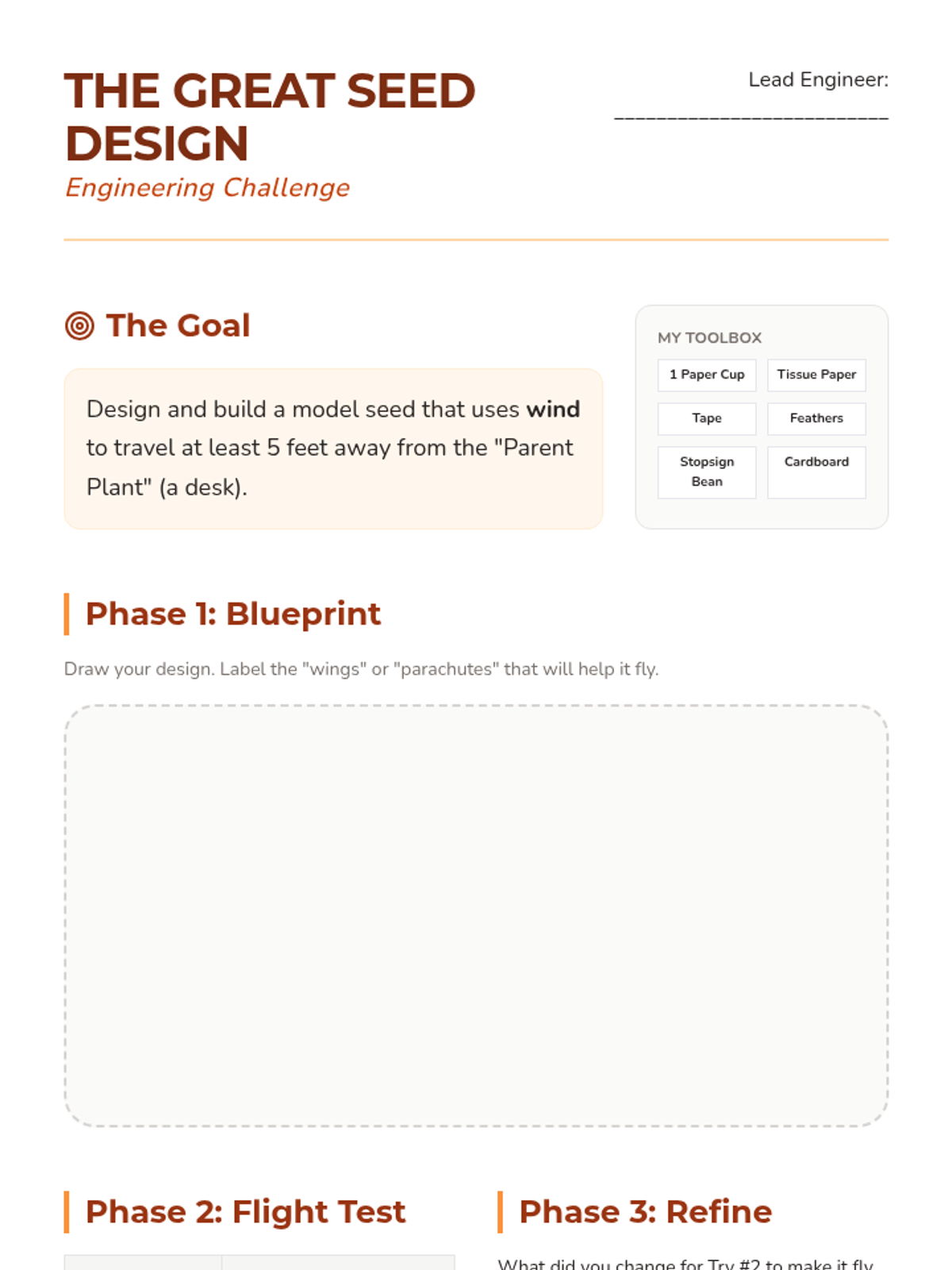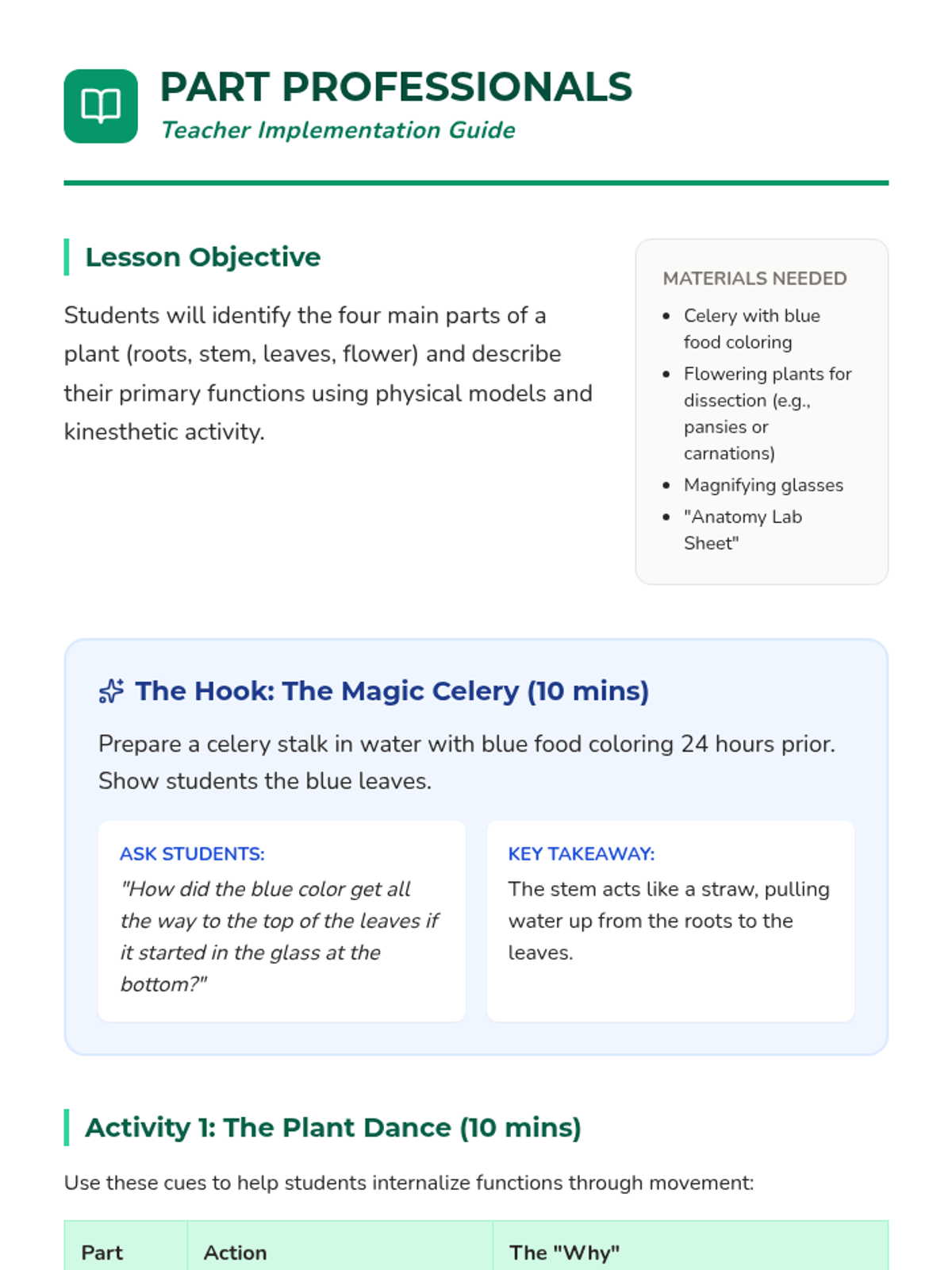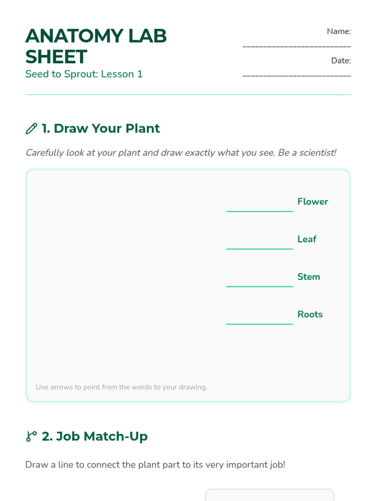 A hands-on exploration of plant biology for 2nd graders, covering anatomy, growth requirements, seed dispersal, and data analysis through a multi-week bean plant experiment.