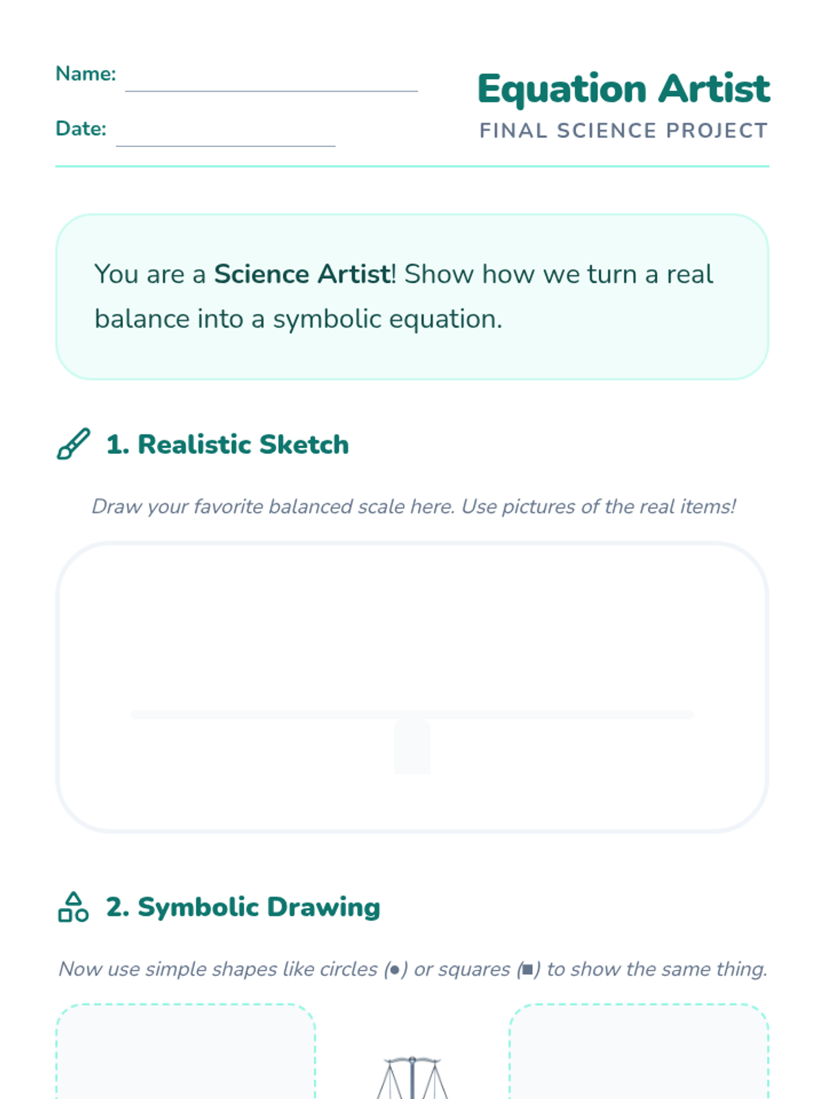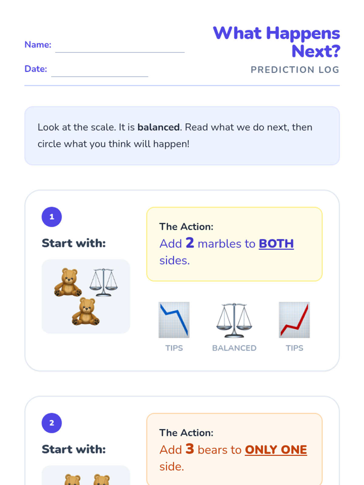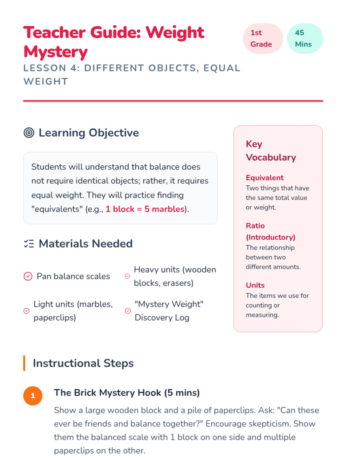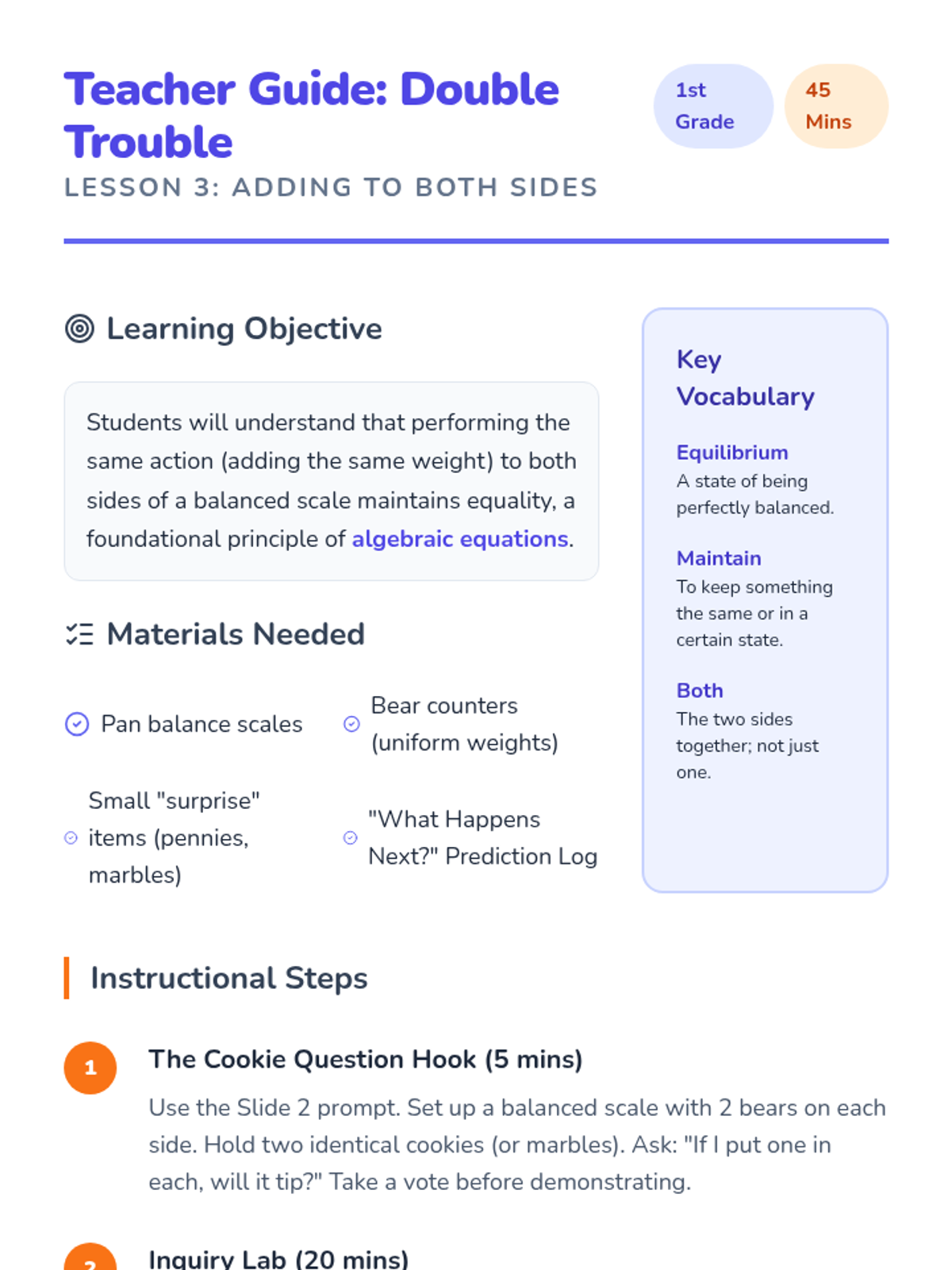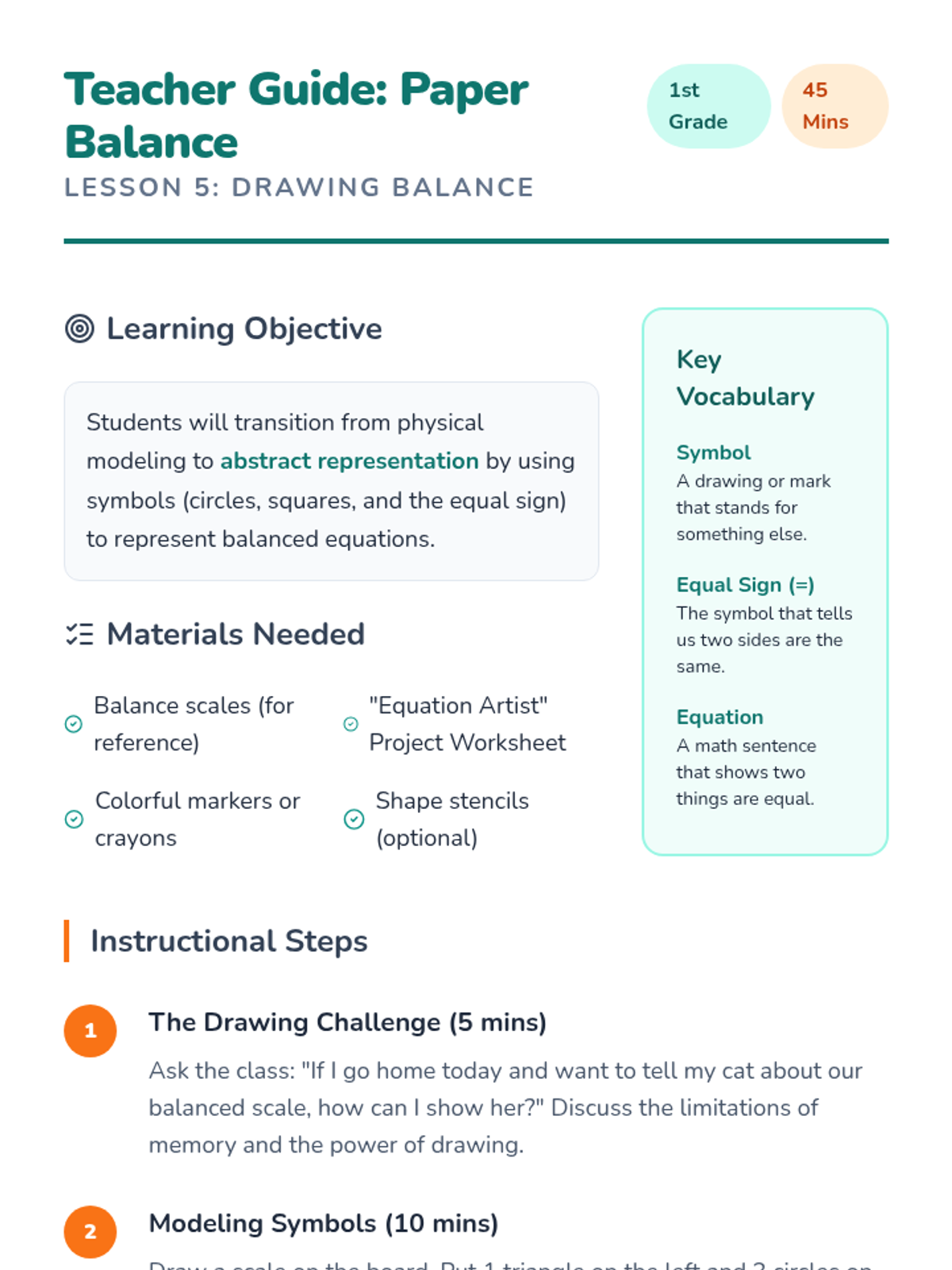 This sequence introduces 1st-grade students to the concept of equality using physical balance scales. Students explore balance, 1:1 correspondence, maintaining equilibrium by adding to both sides, and representing weight relationships symbolically.