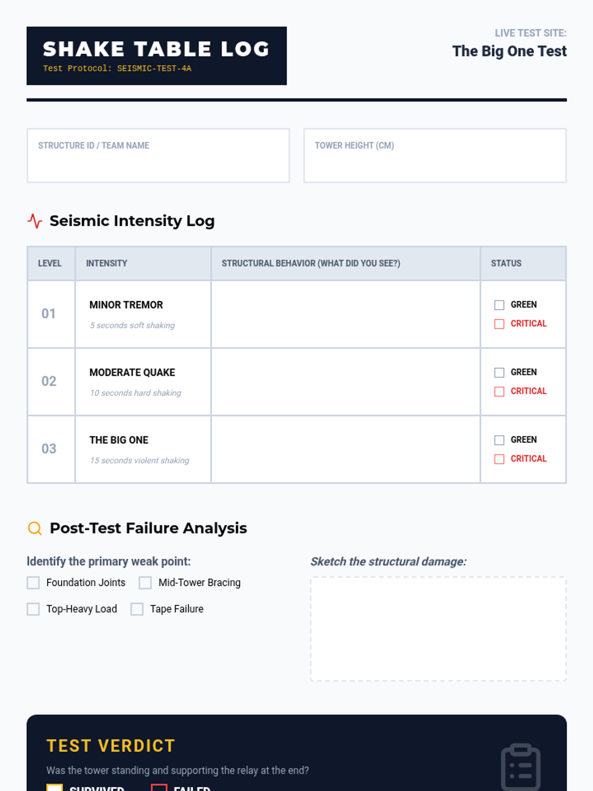 A 5th-grade engineering sequence focused on seismic safety. Students explore earthquake physics, structural engineering principles, and the iterative design process to build and test earthquake-resistant structures.