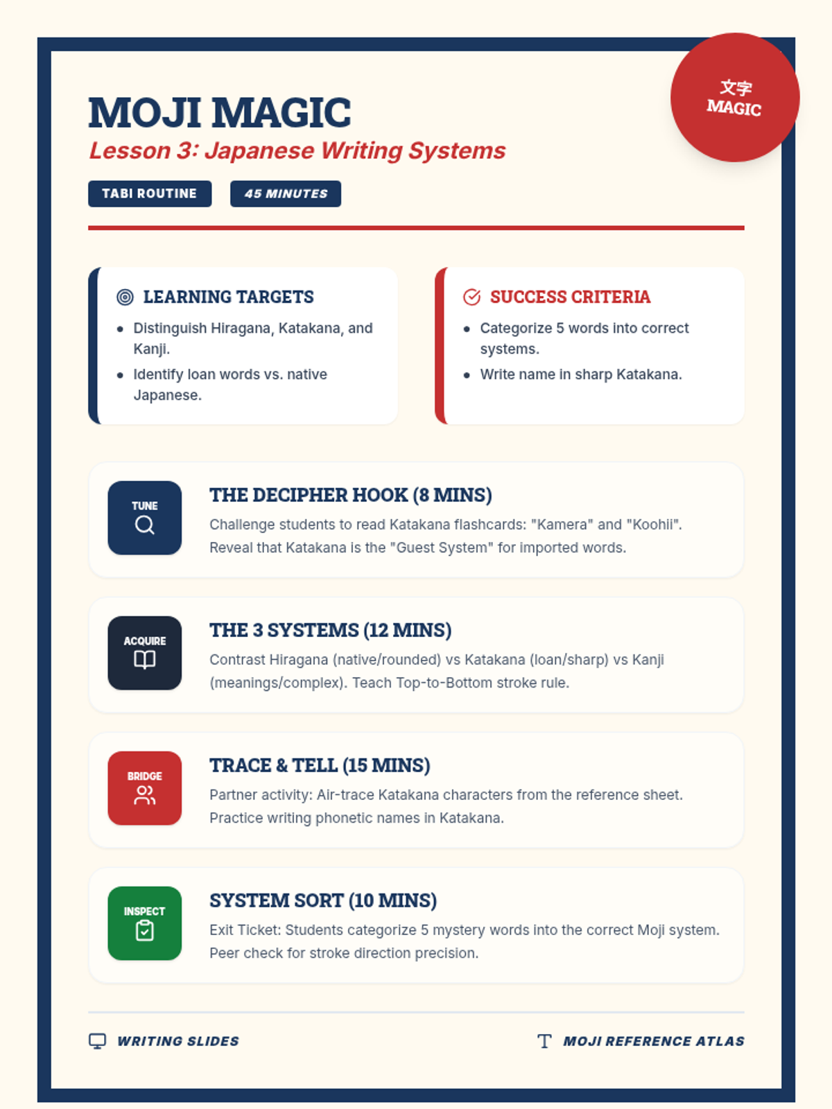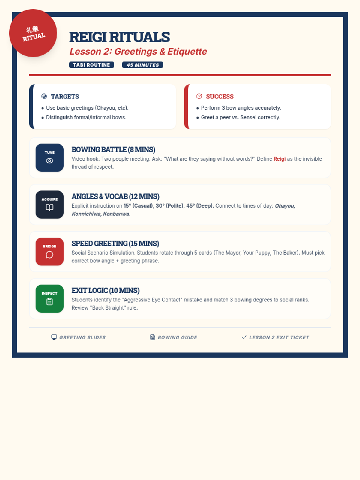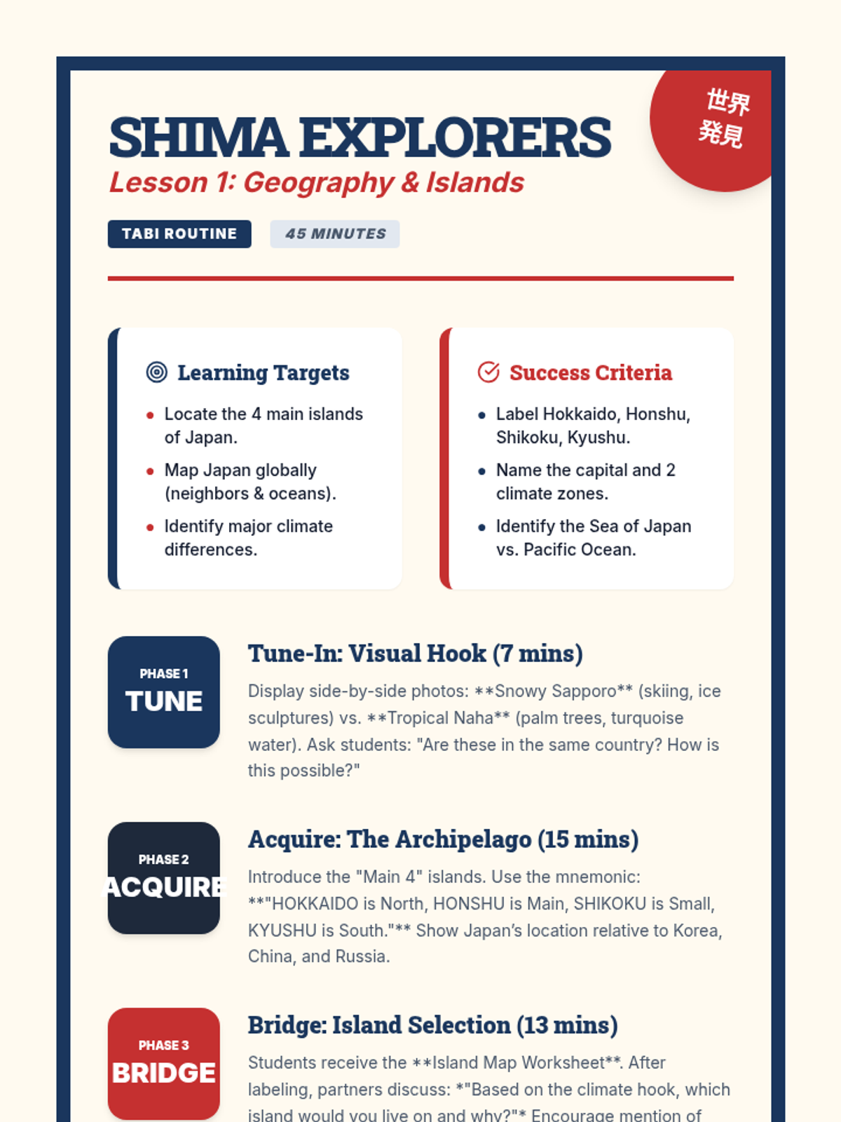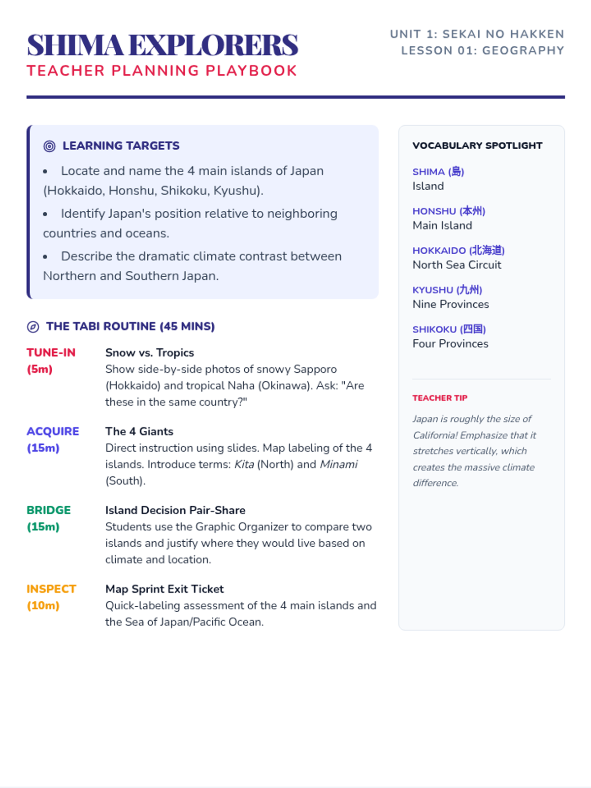 An introductory Japanese language and culture unit for 8th grade that follows the 'TABI' (Journey) framework. Students explore geography, etiquette, writing systems, daily life, and traditional arts through immersive daily 45-minute lessons.
