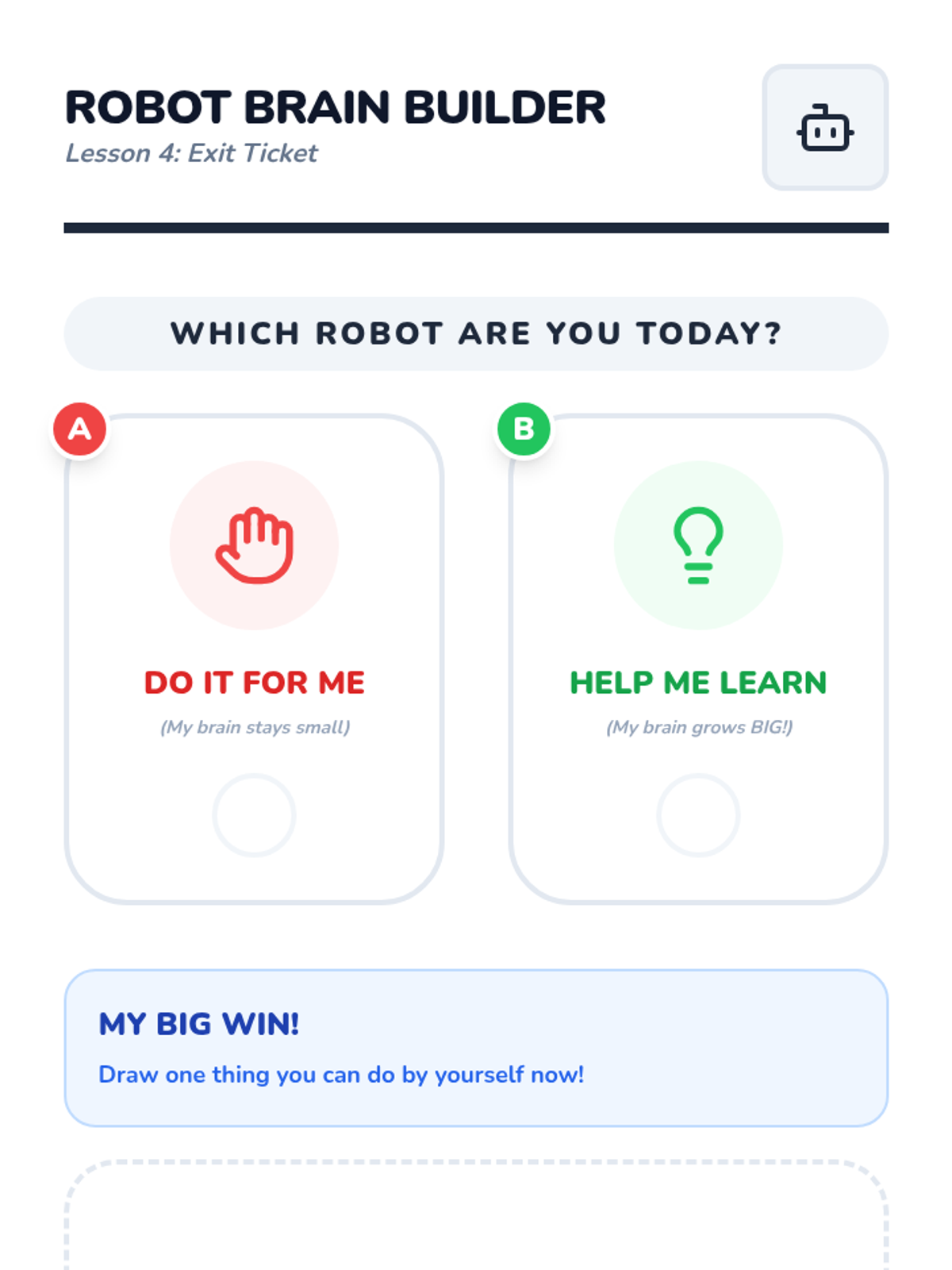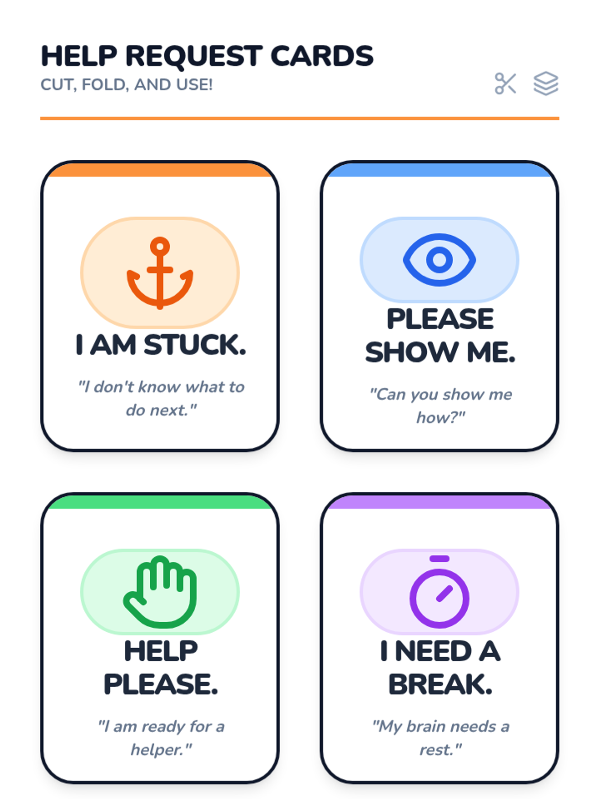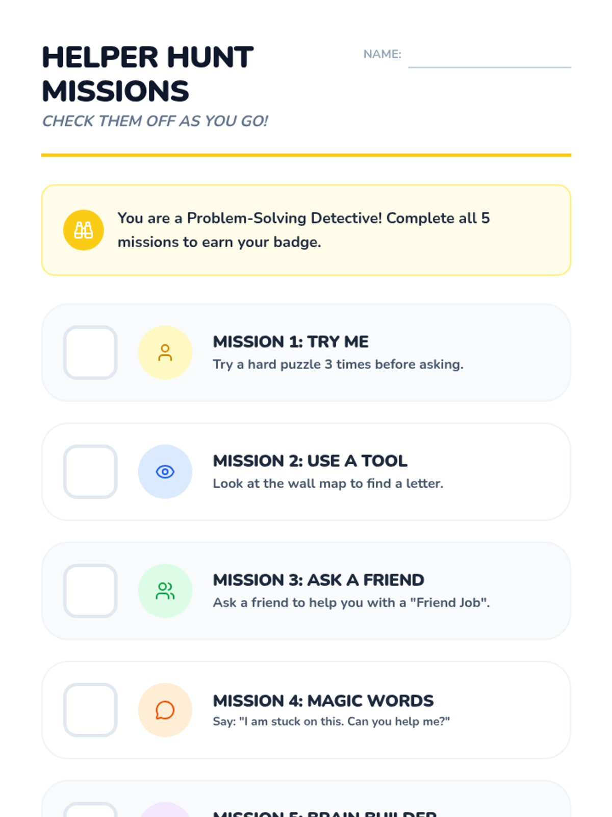 A sequence for Kindergarten students focusing on self-advocacy and problem-solving. Students learn a graduated prompting hierarchy (Try Three Rule), identify appropriate helpers, use specific scripts to ask for help, and distinguish between being helped and being taught.