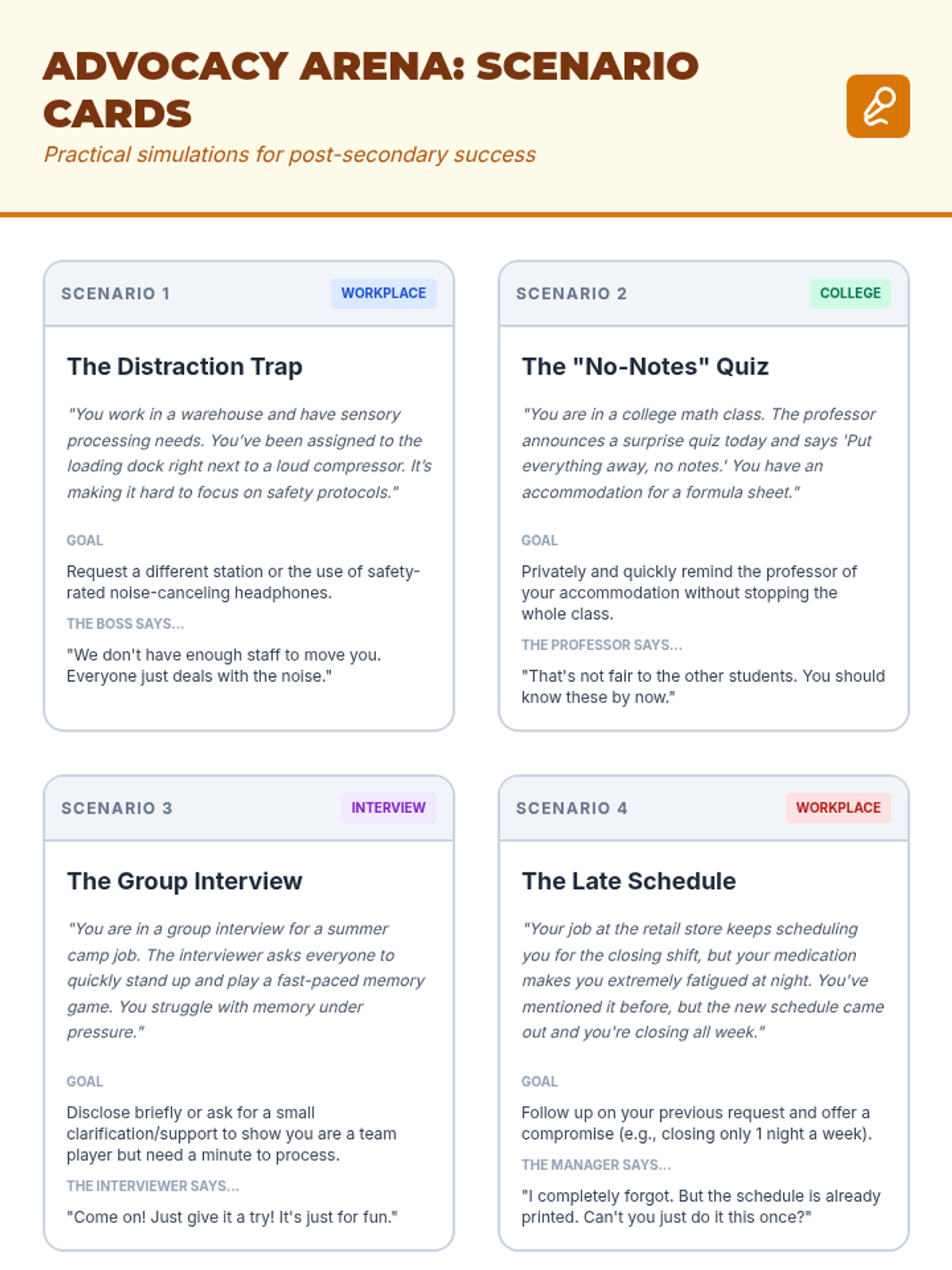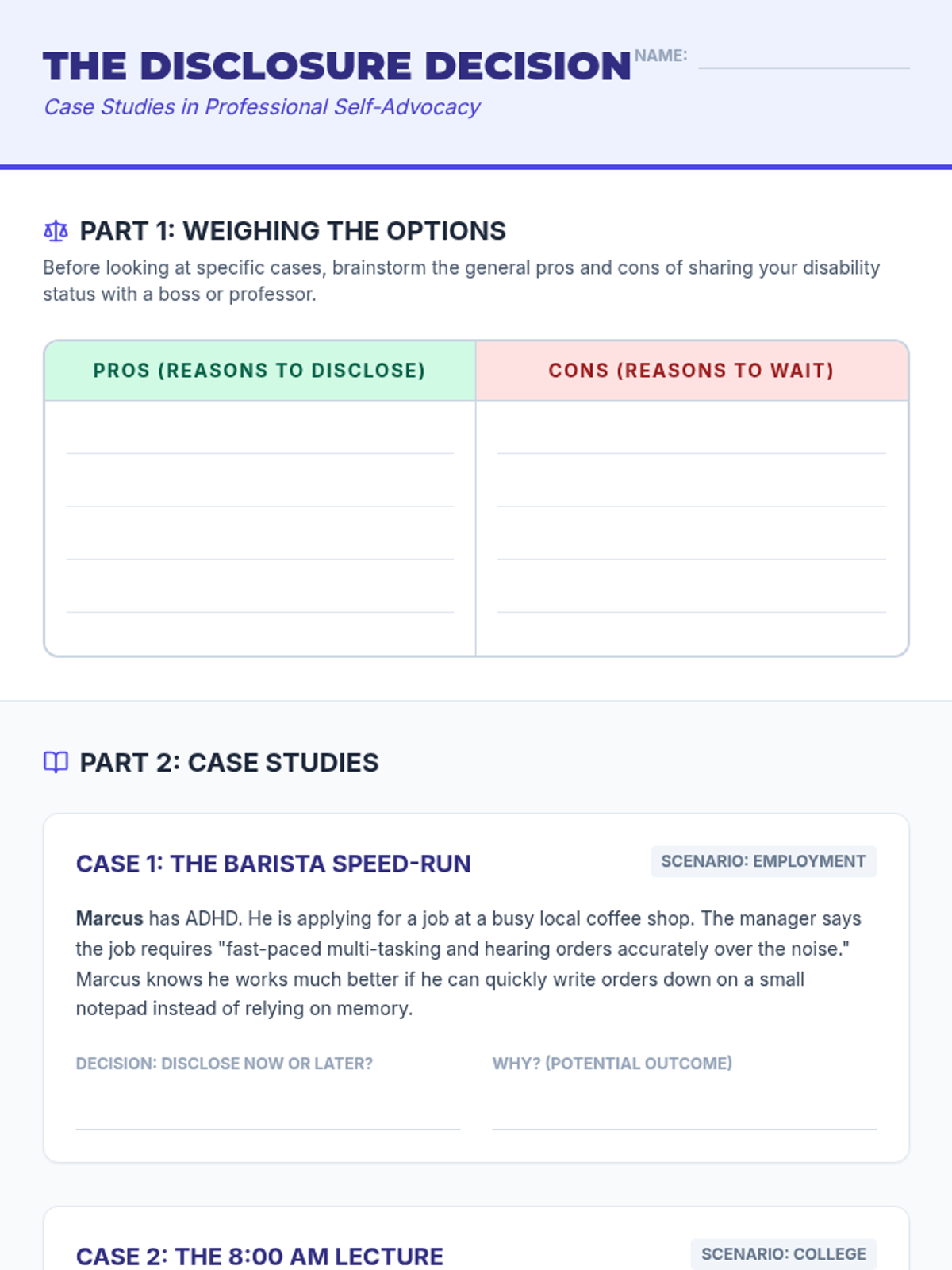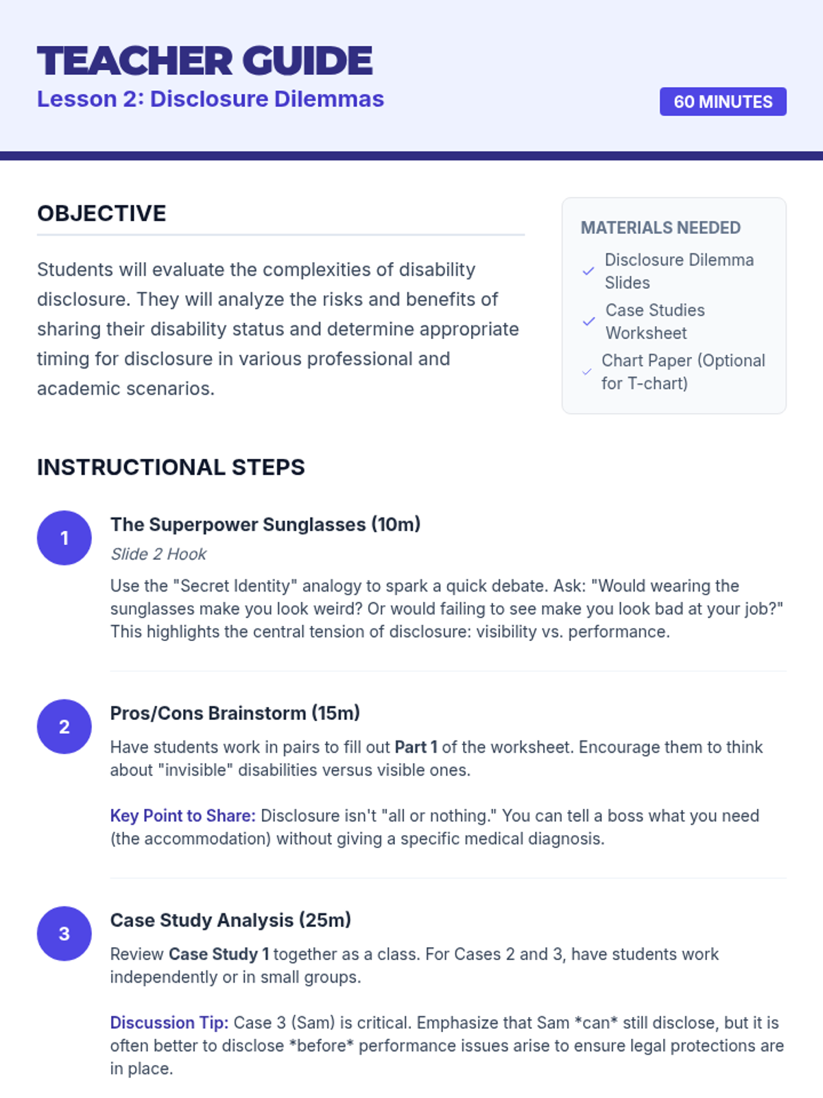 A comprehensive unit for 11th-grade students to master self-advocacy skills, understand their learning profiles, and navigate the complexities of disclosing disabilities and requesting accommodations in post-secondary and professional environments.