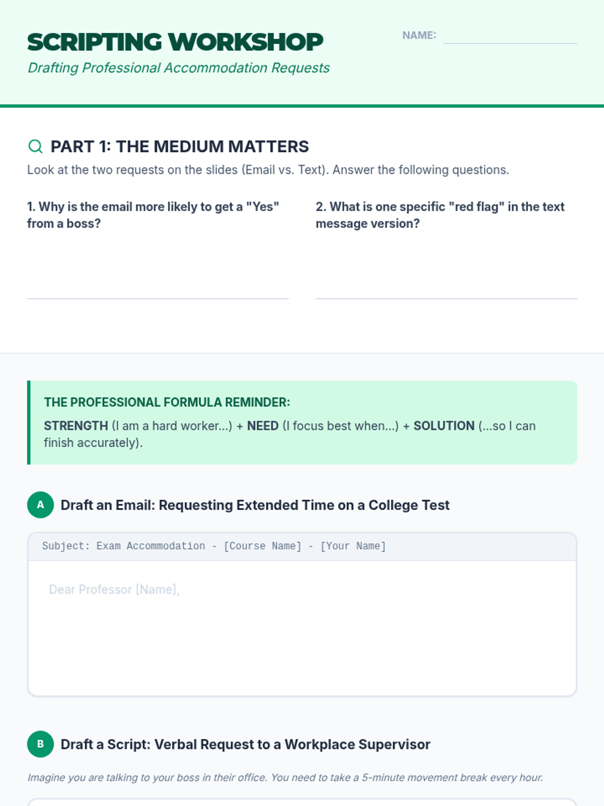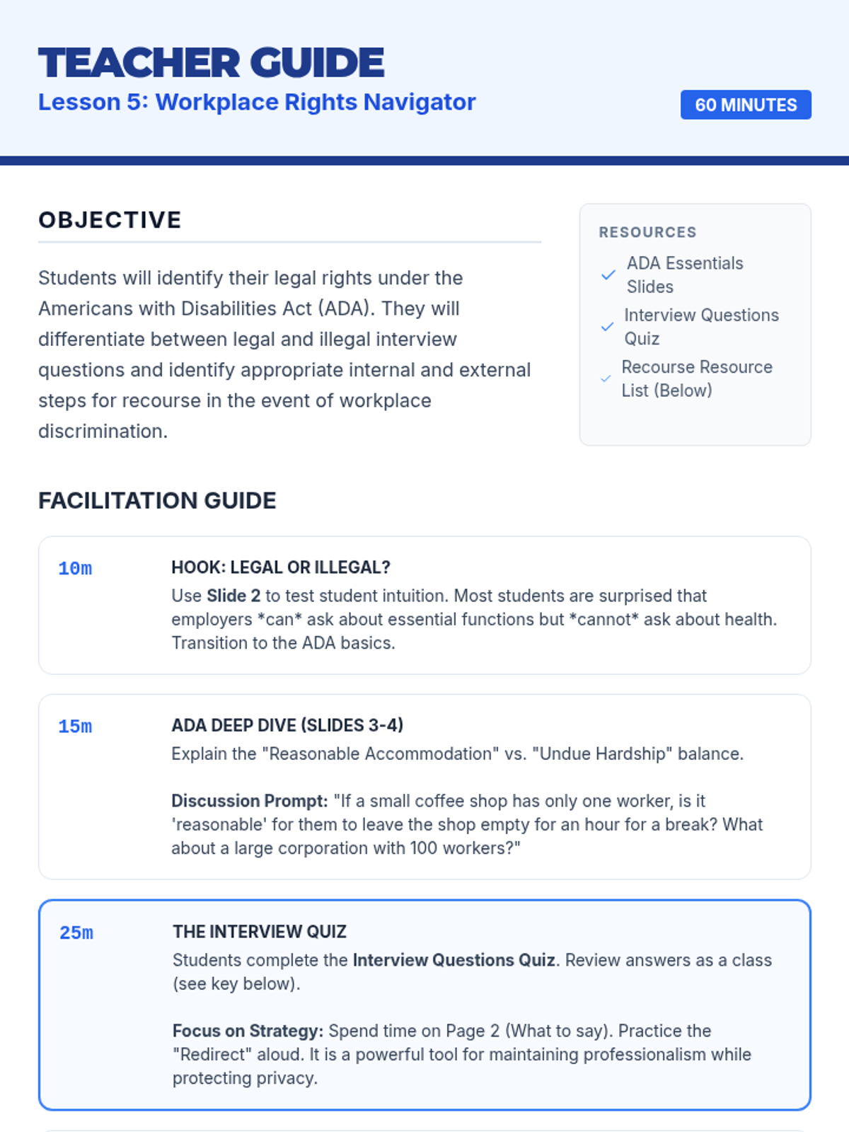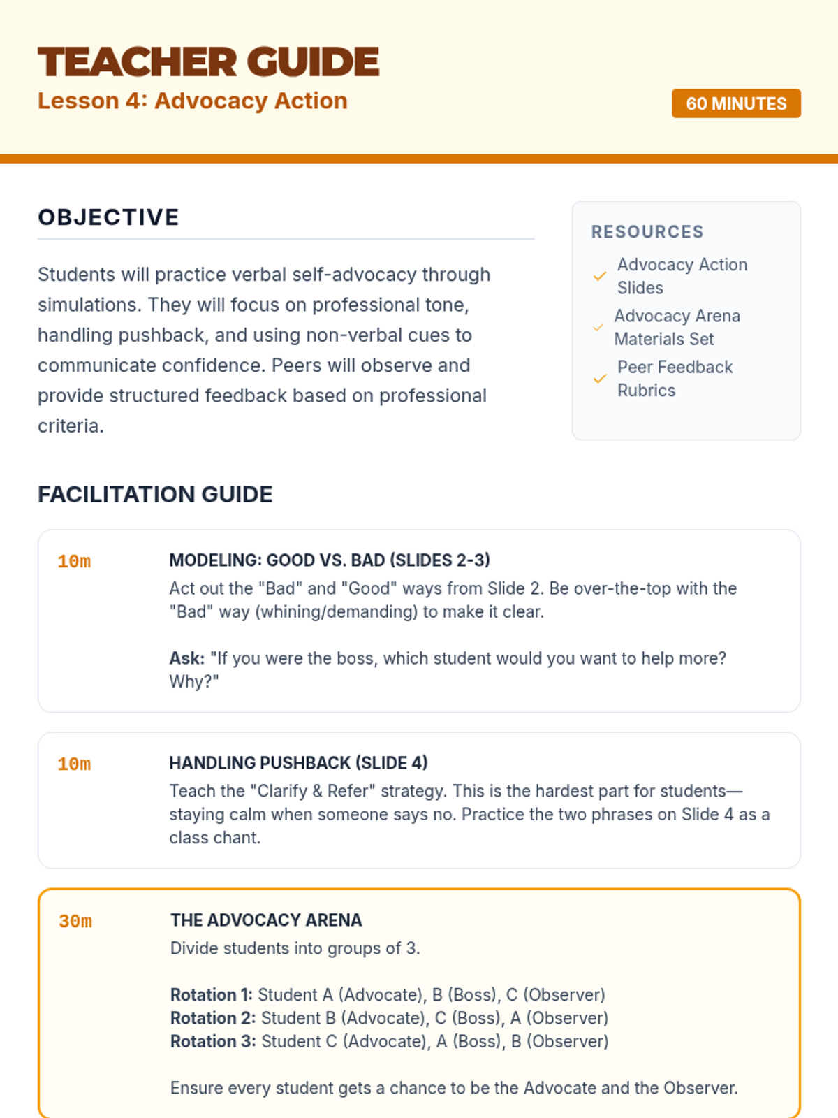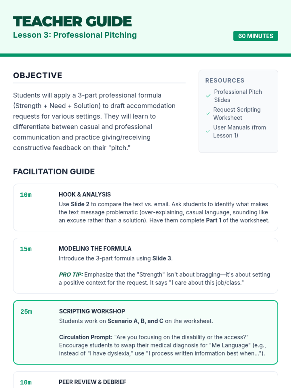 A comprehensive unit for 11th-grade students to master self-advocacy skills, understand their learning profiles, and navigate the complexities of disclosing disabilities and requesting accommodations in post-secondary and professional environments.