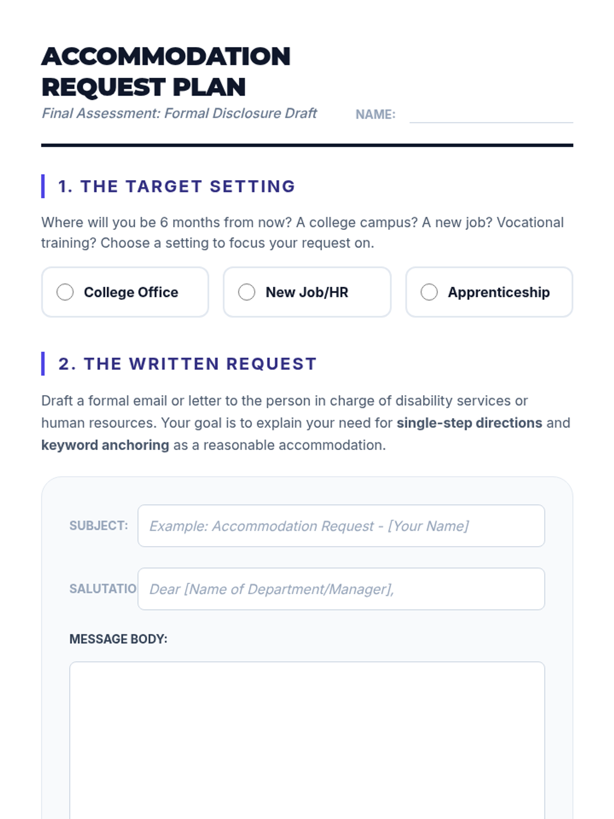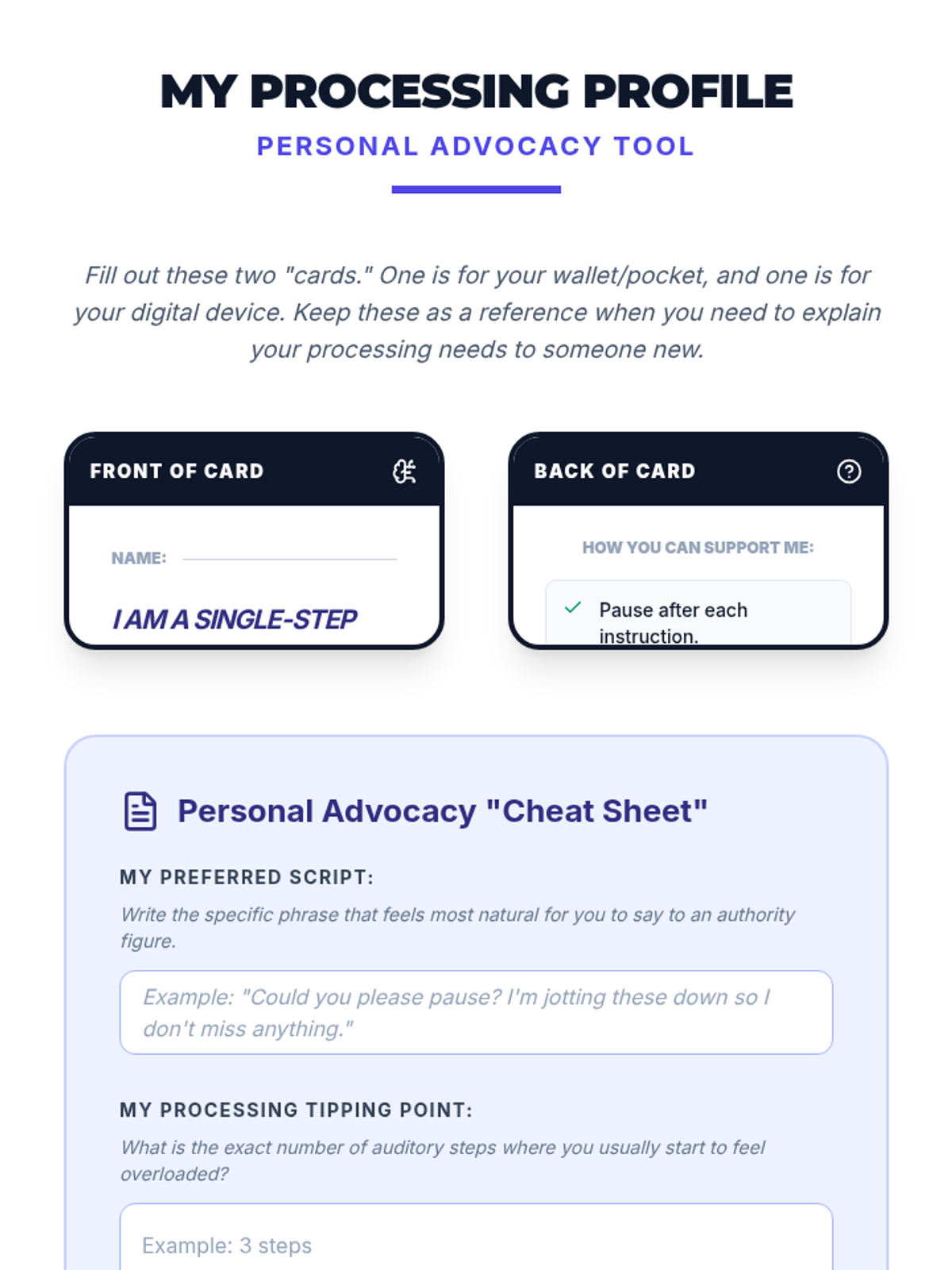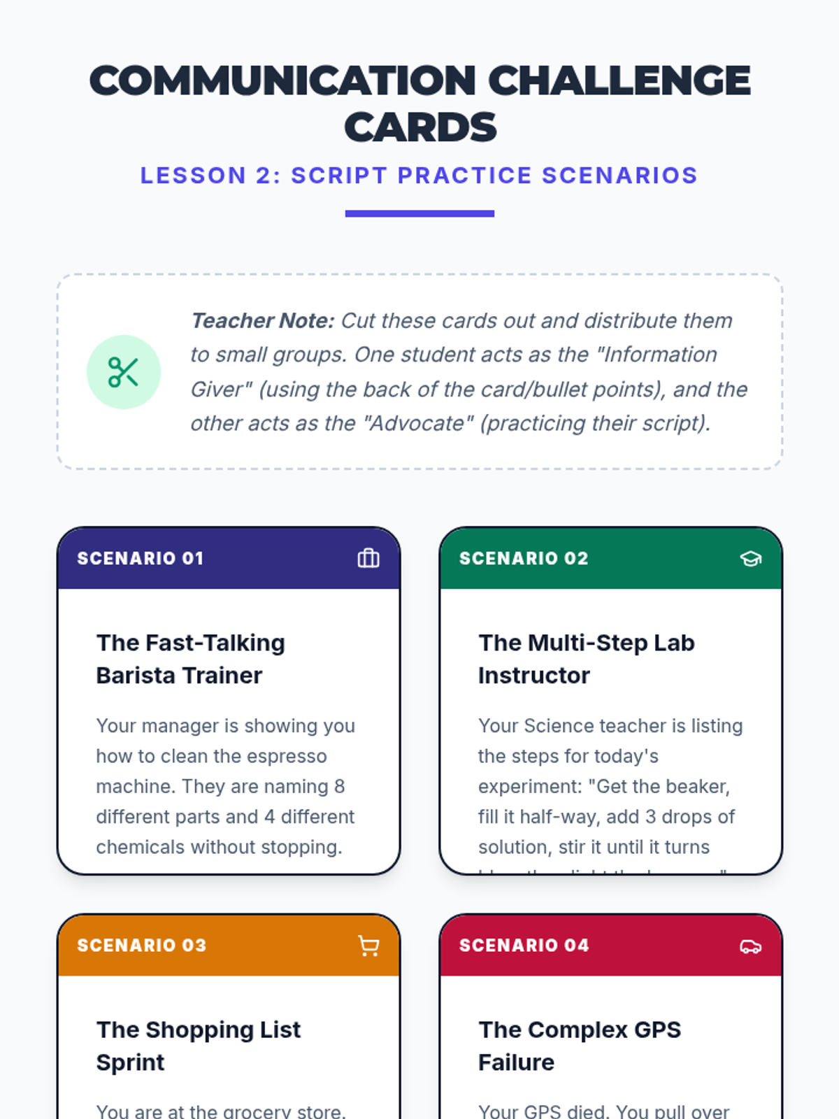 A 12th-grade sequence focused on empowering students with working memory challenges to advocate for single-step directions in professional and academic settings. Students learn to recognize their processing limits, draft professional scripts, and practice high-stakes role-play to ensure they can manage information overload effectively.
