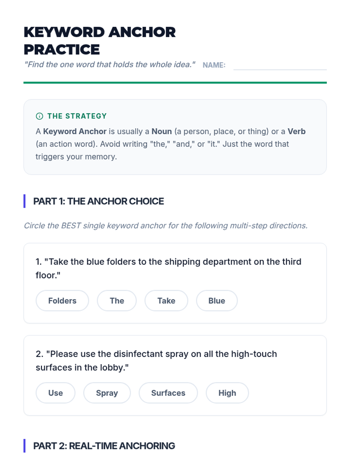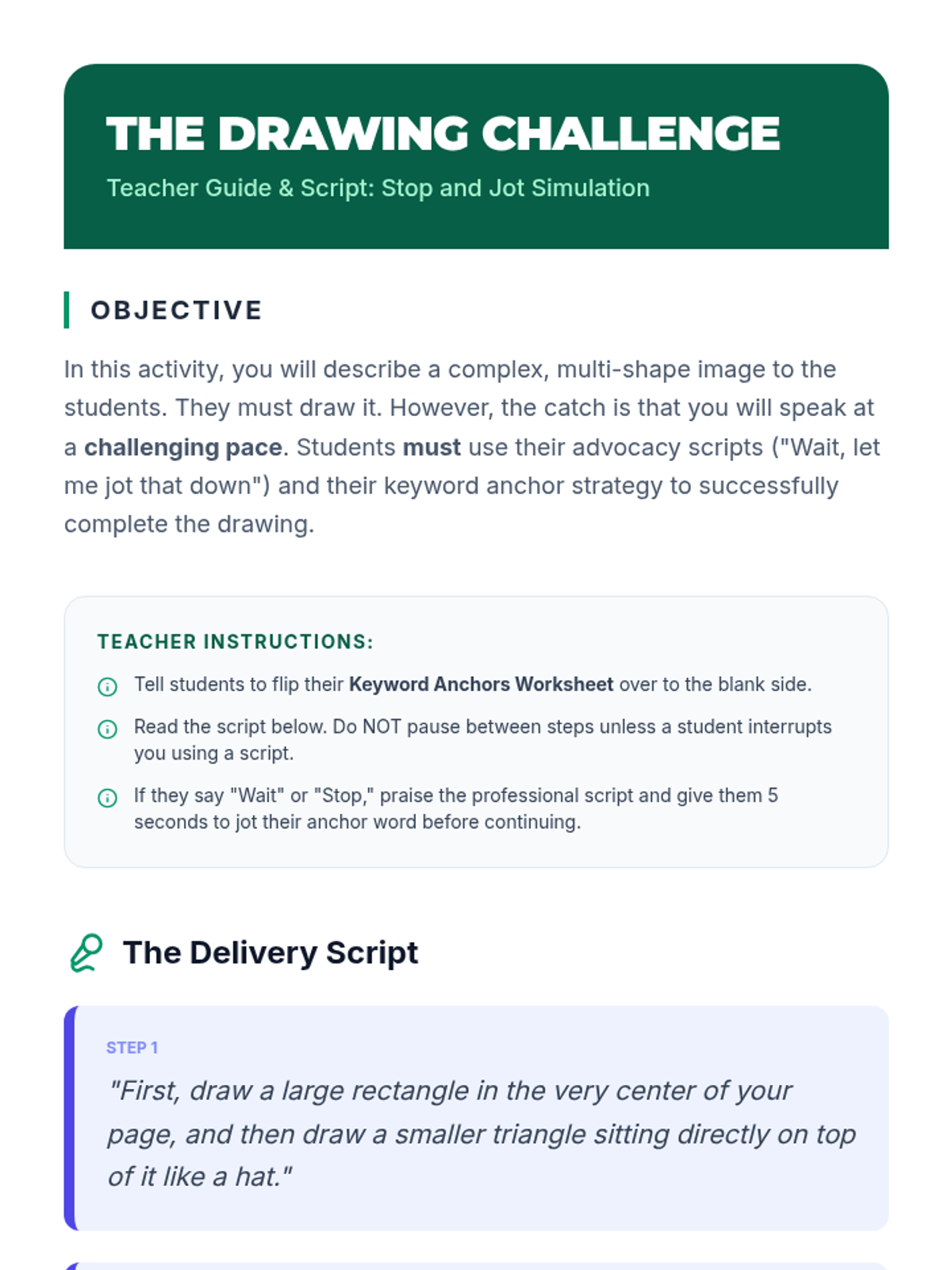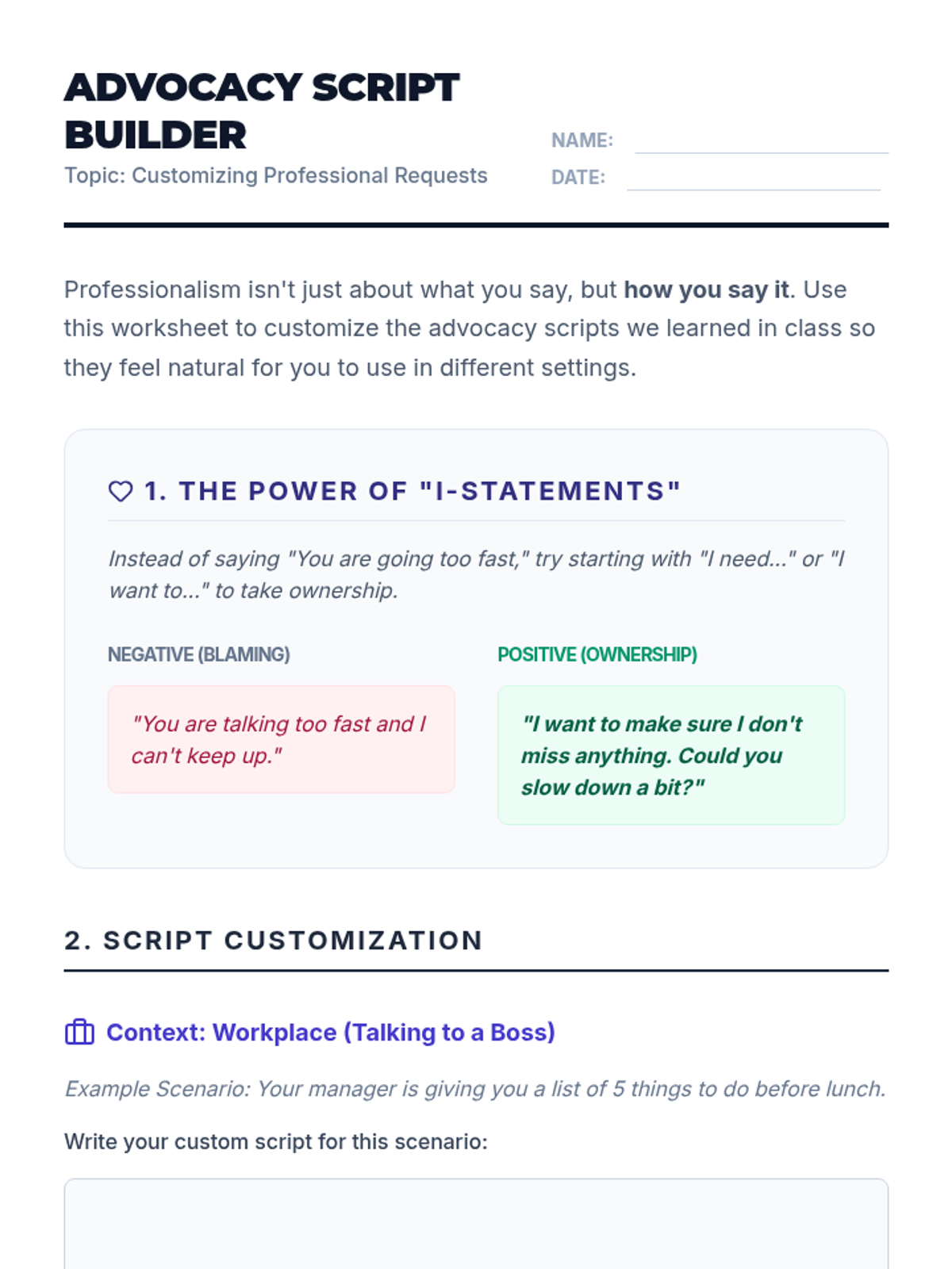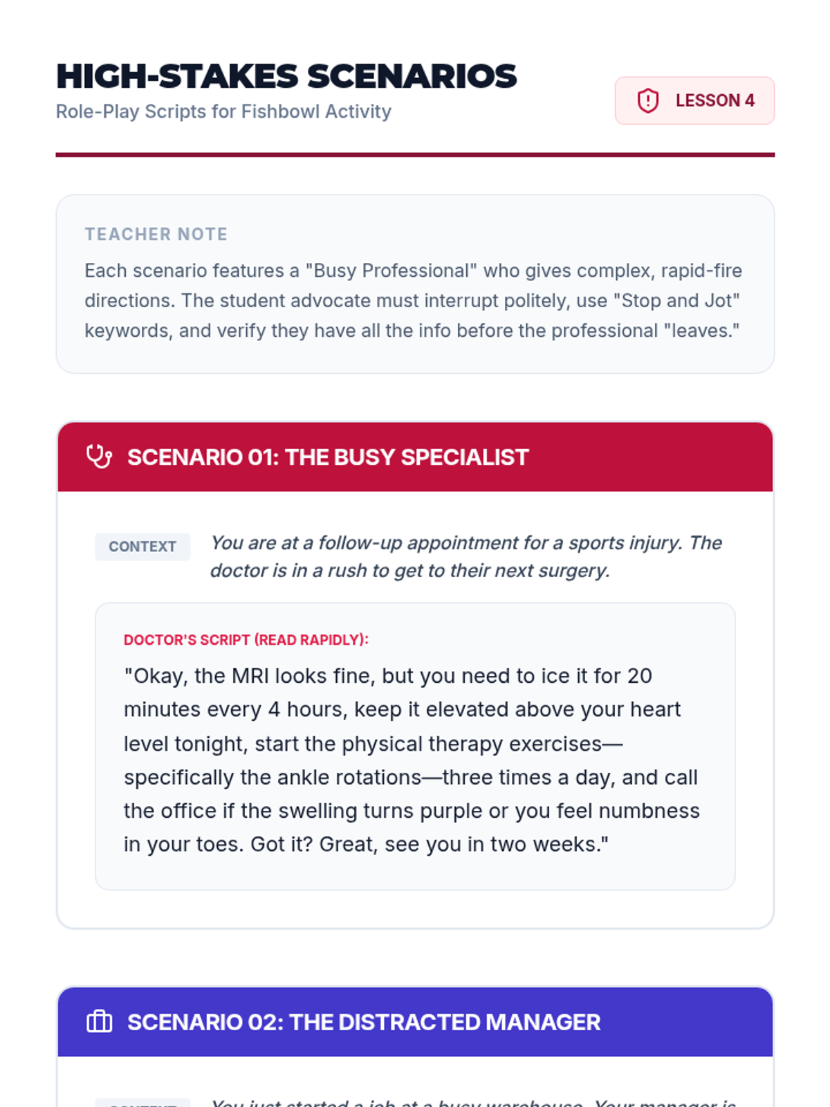 A 12th-grade sequence focused on empowering students with working memory challenges to advocate for single-step directions in professional and academic settings. Students learn to recognize their processing limits, draft professional scripts, and practice high-stakes role-play to ensure they can manage information overload effectively.
