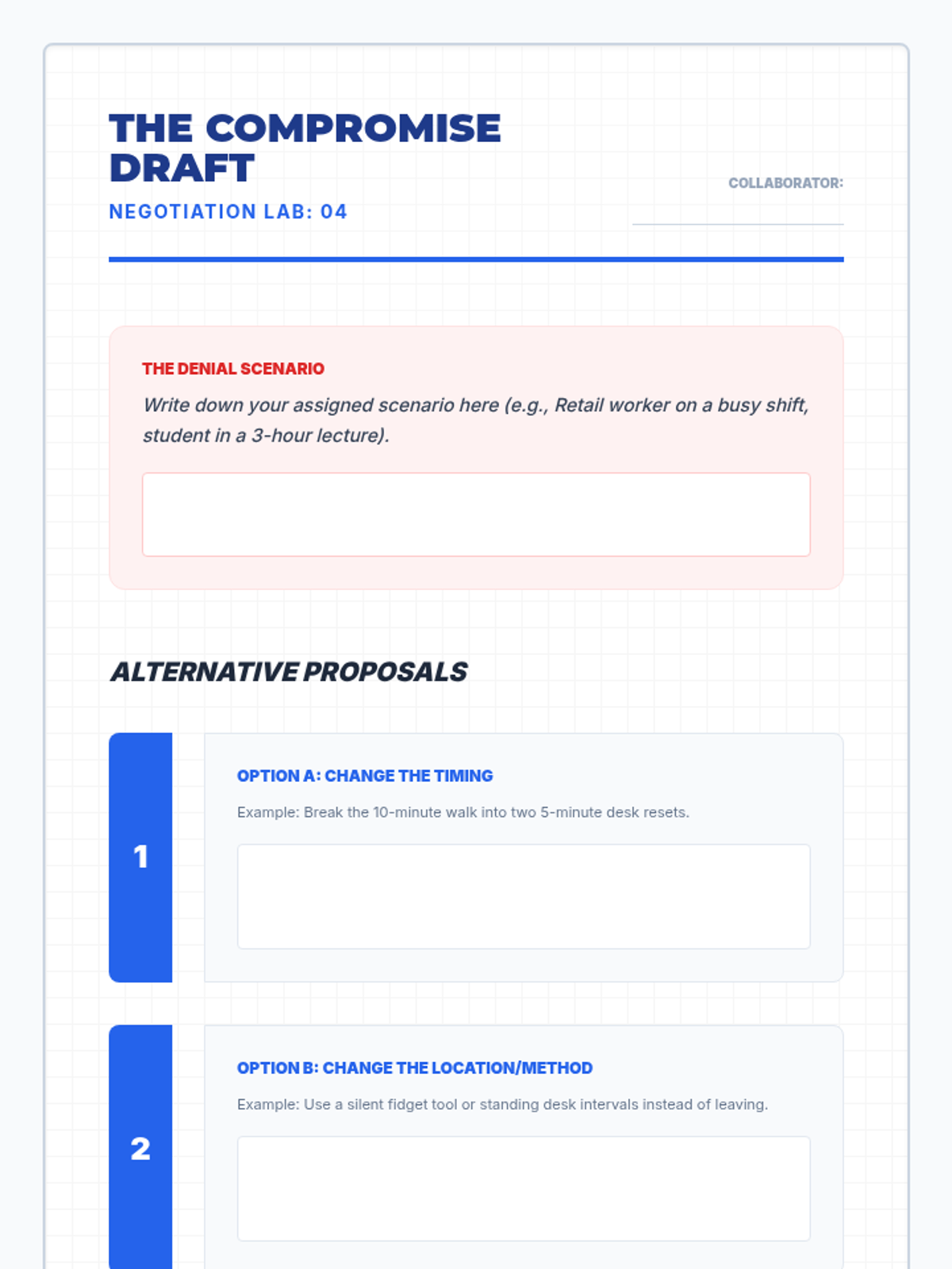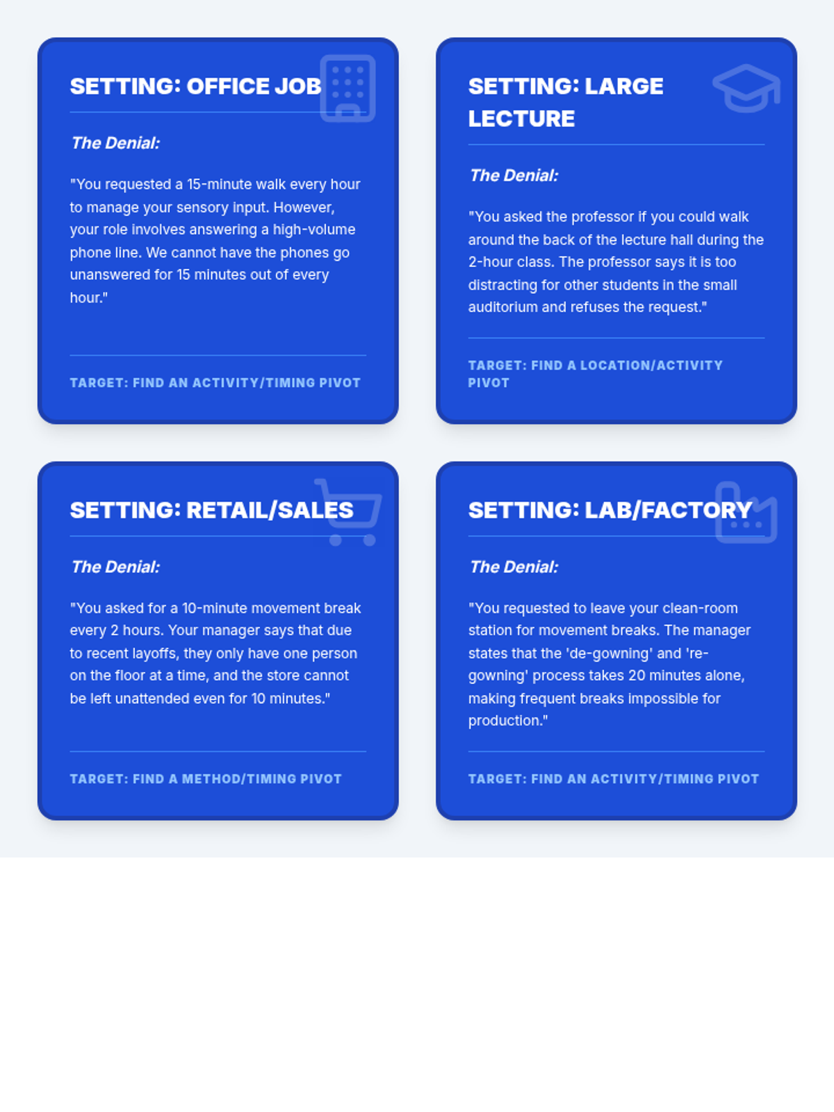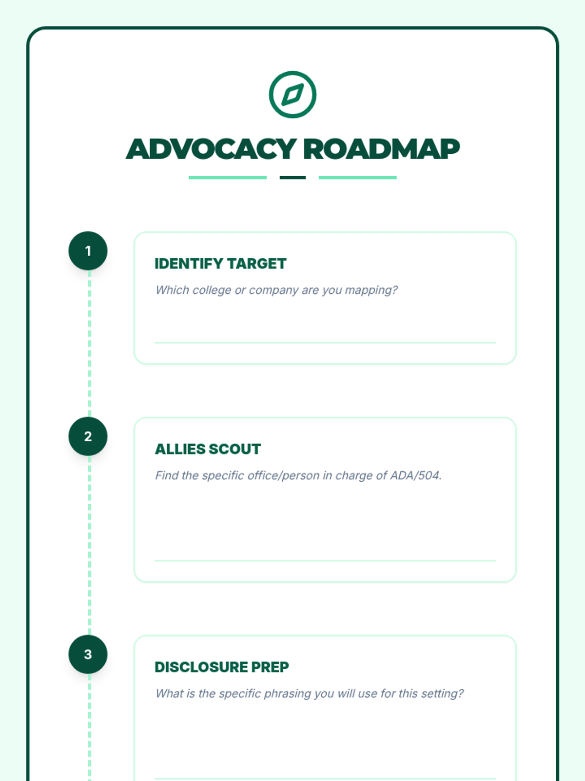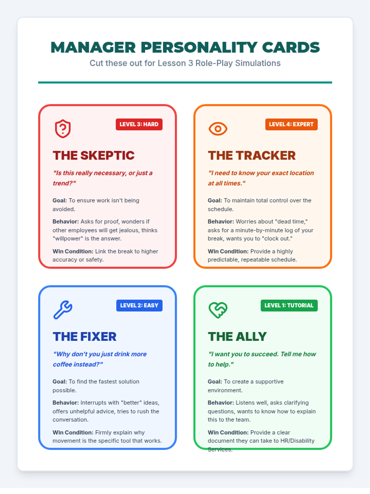 This sequence empowers 12th-grade students with sensory processing needs to transition into adulthood by teaching them the legal rights, communication strategies, and negotiation skills necessary to secure movement-based accommodations in higher education and the workplace. Students will move from understanding the ADA to practicing high-stakes simulations and building a personal support network.