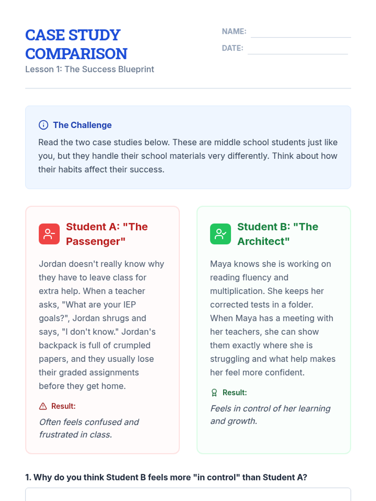 A 5-lesson project-based sequence for 7th-grade students to build a physical Self-Advocacy Portfolio. Students learn to organize IEP documents, track their own goal progress, and use their organized data to advocate for their needs in meetings.