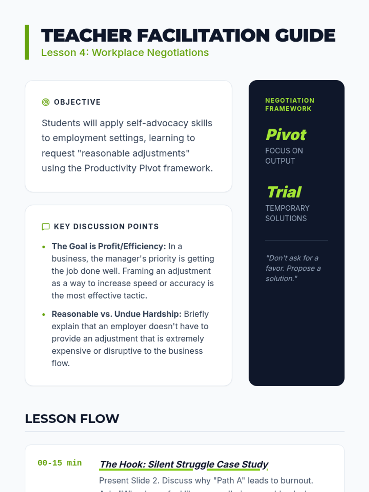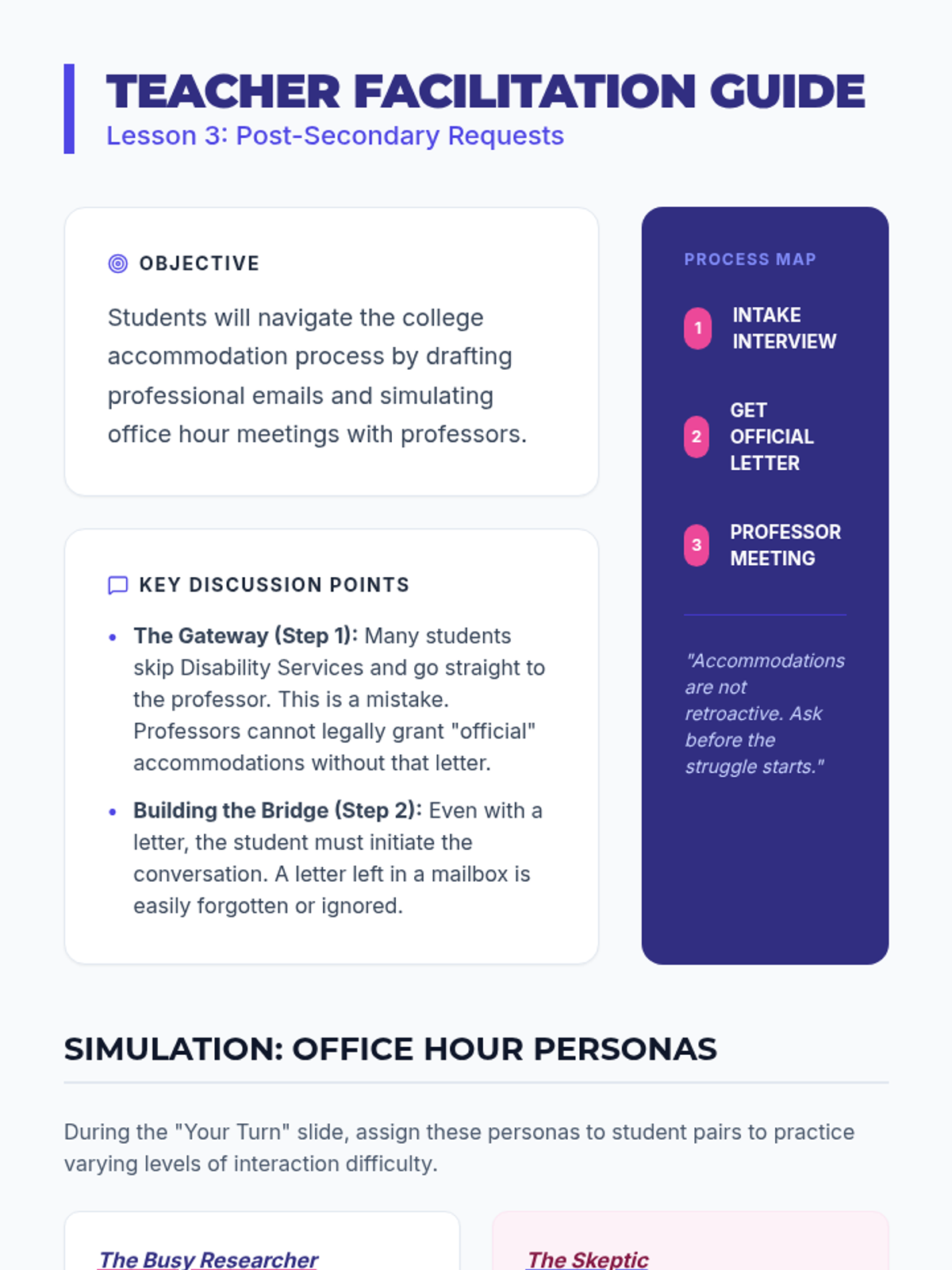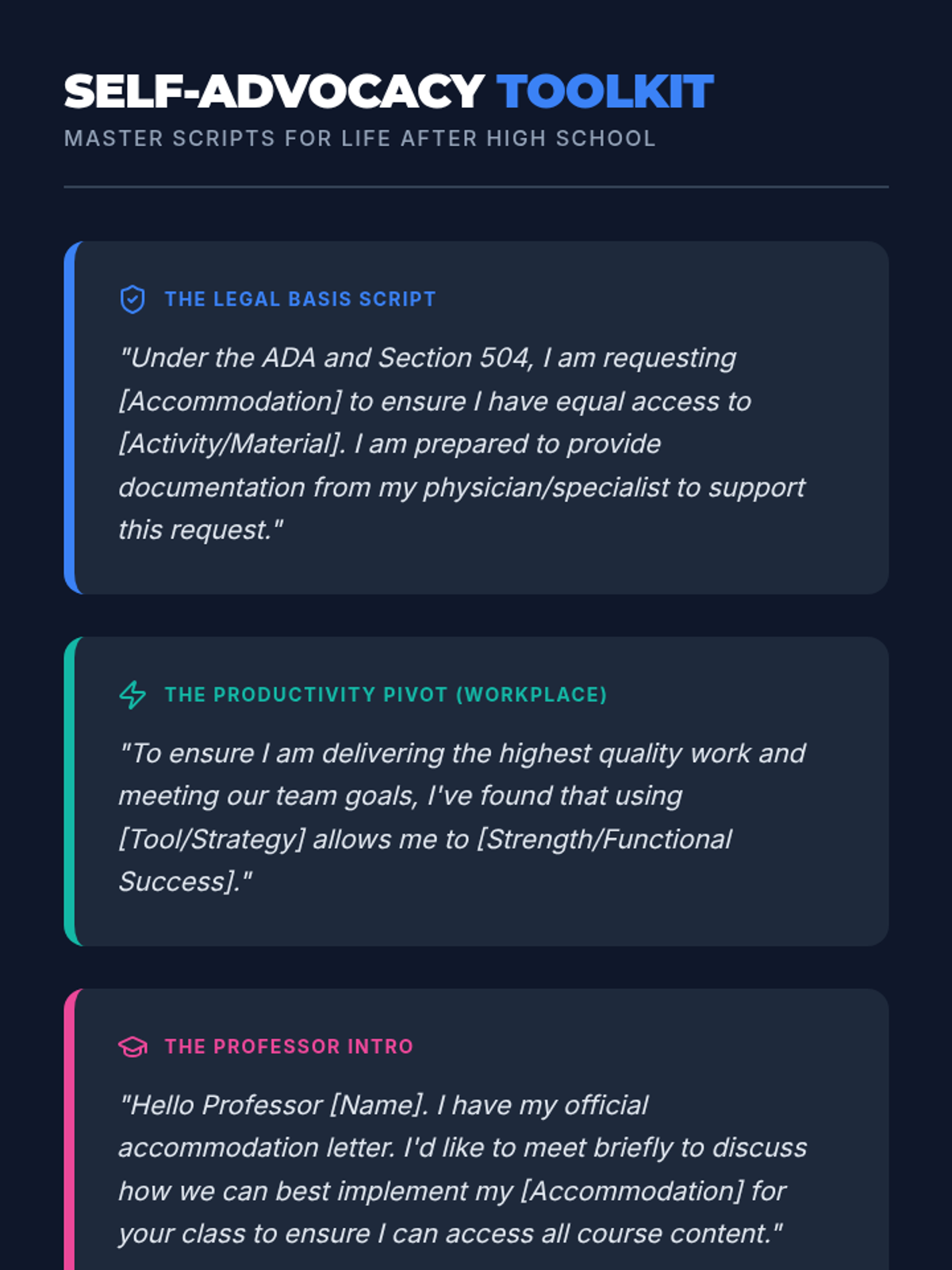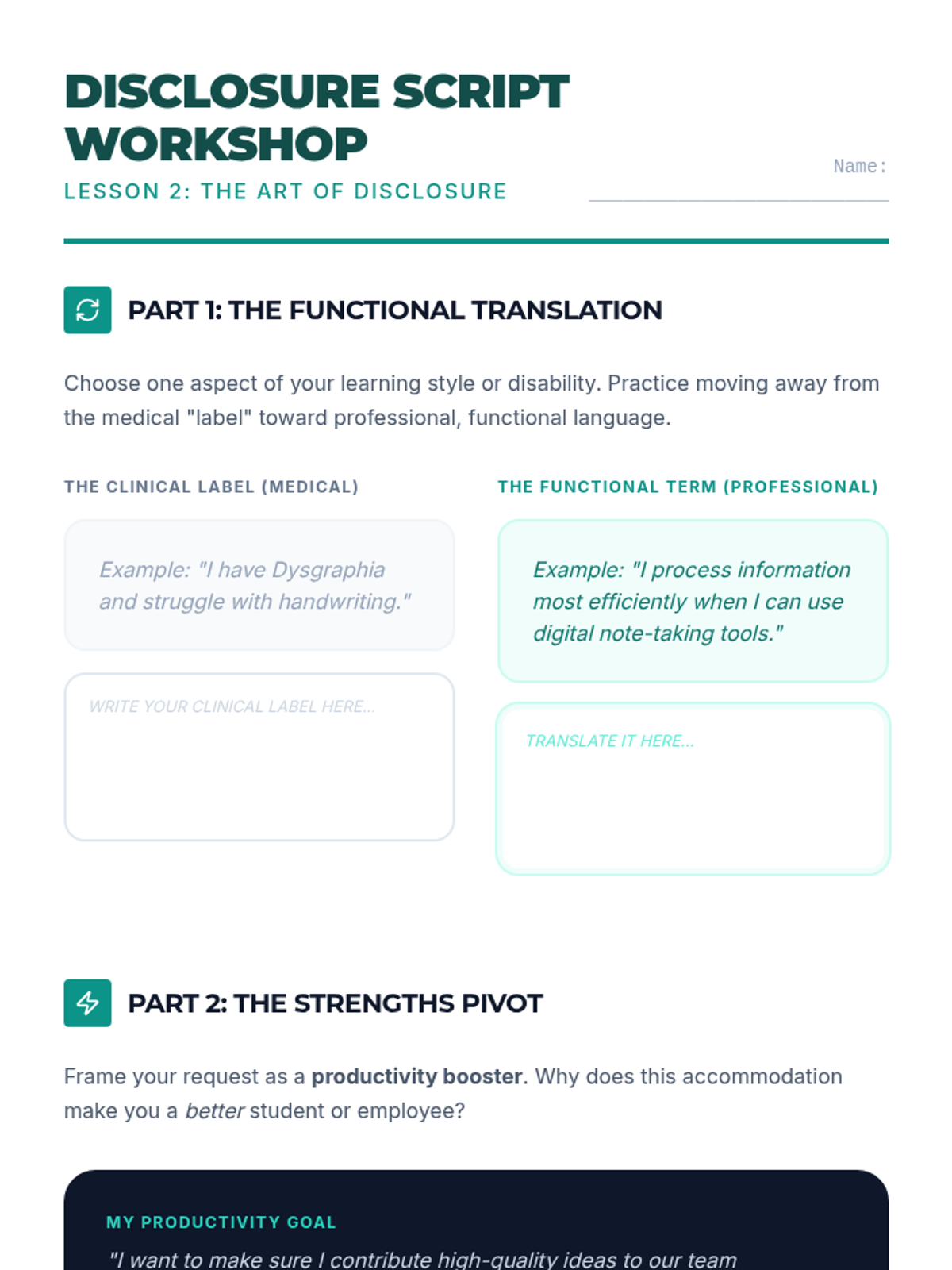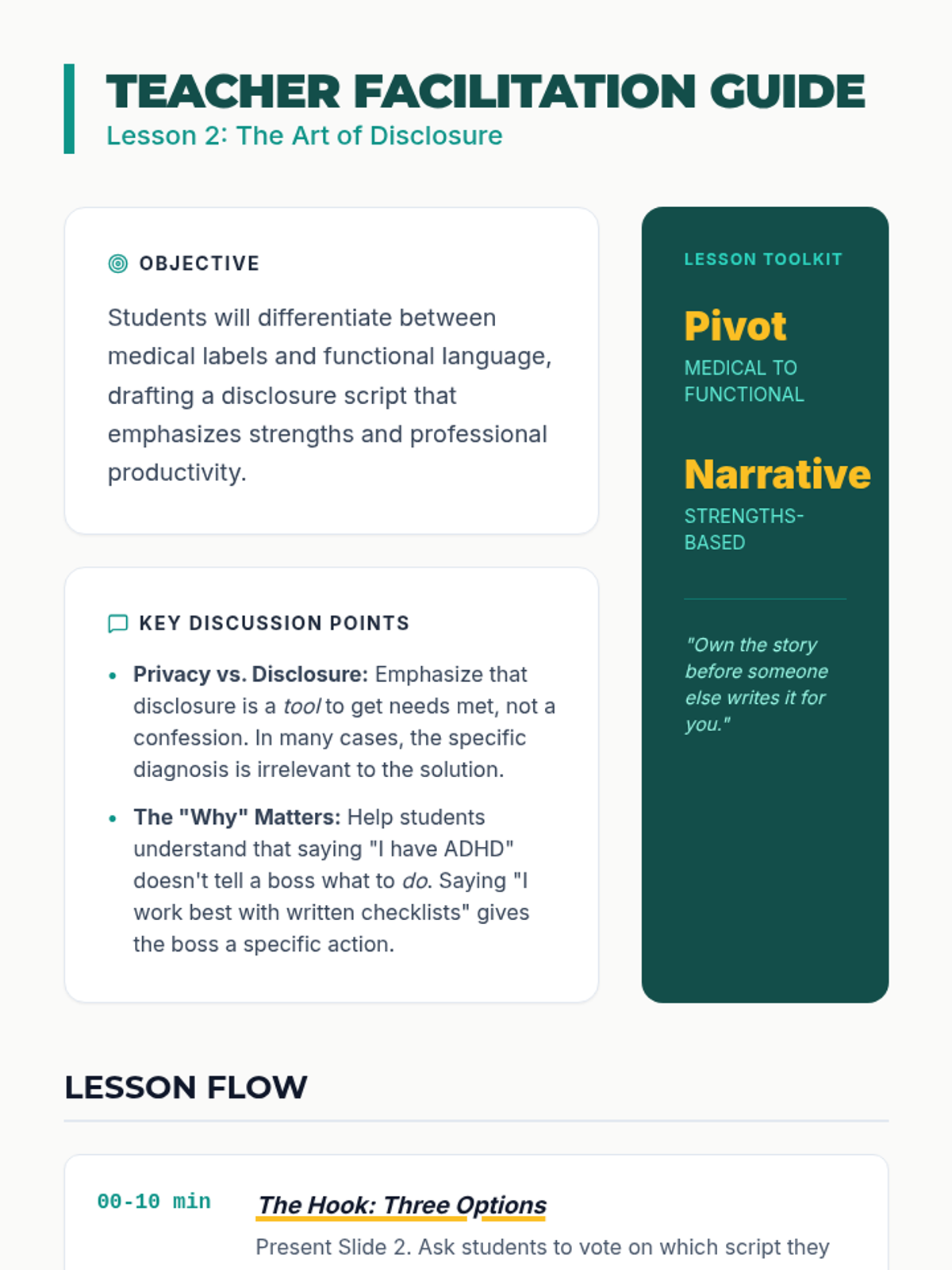 A comprehensive transition sequence for 12th-grade students focused on disability rights, the nuances of disclosure, and the practical application of self-advocacy scripts in post-secondary and workplace settings.