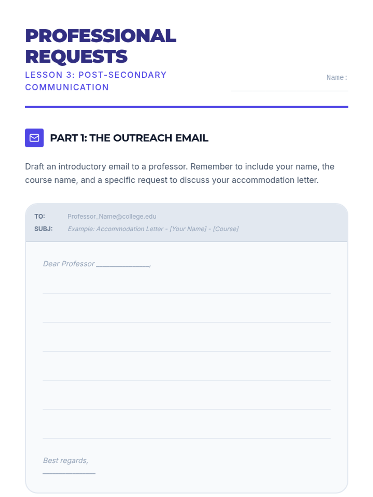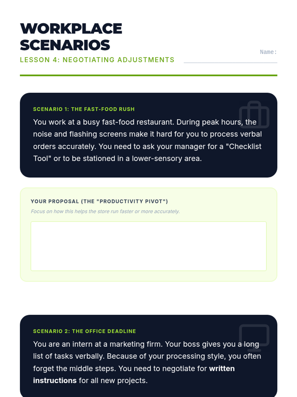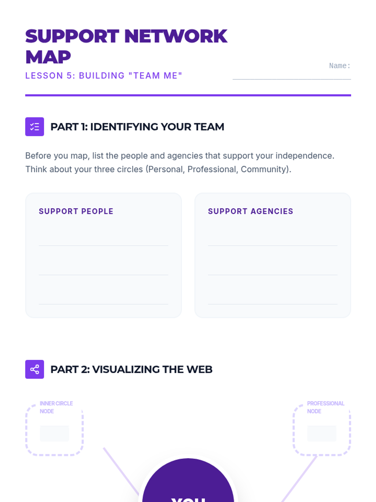 A comprehensive 3-hour one-on-one employment readiness curriculum designed for adults with disabilities. The sequence focuses on self-discovery, workplace etiquette, and practical application skills through engaging, accessible worksheets.