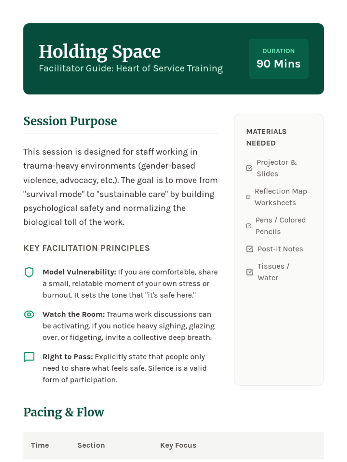 A two-day intensive training for staff working in gender and trauma sectors, focusing on organizational sustainability, psychological safety, and emotional resilience.