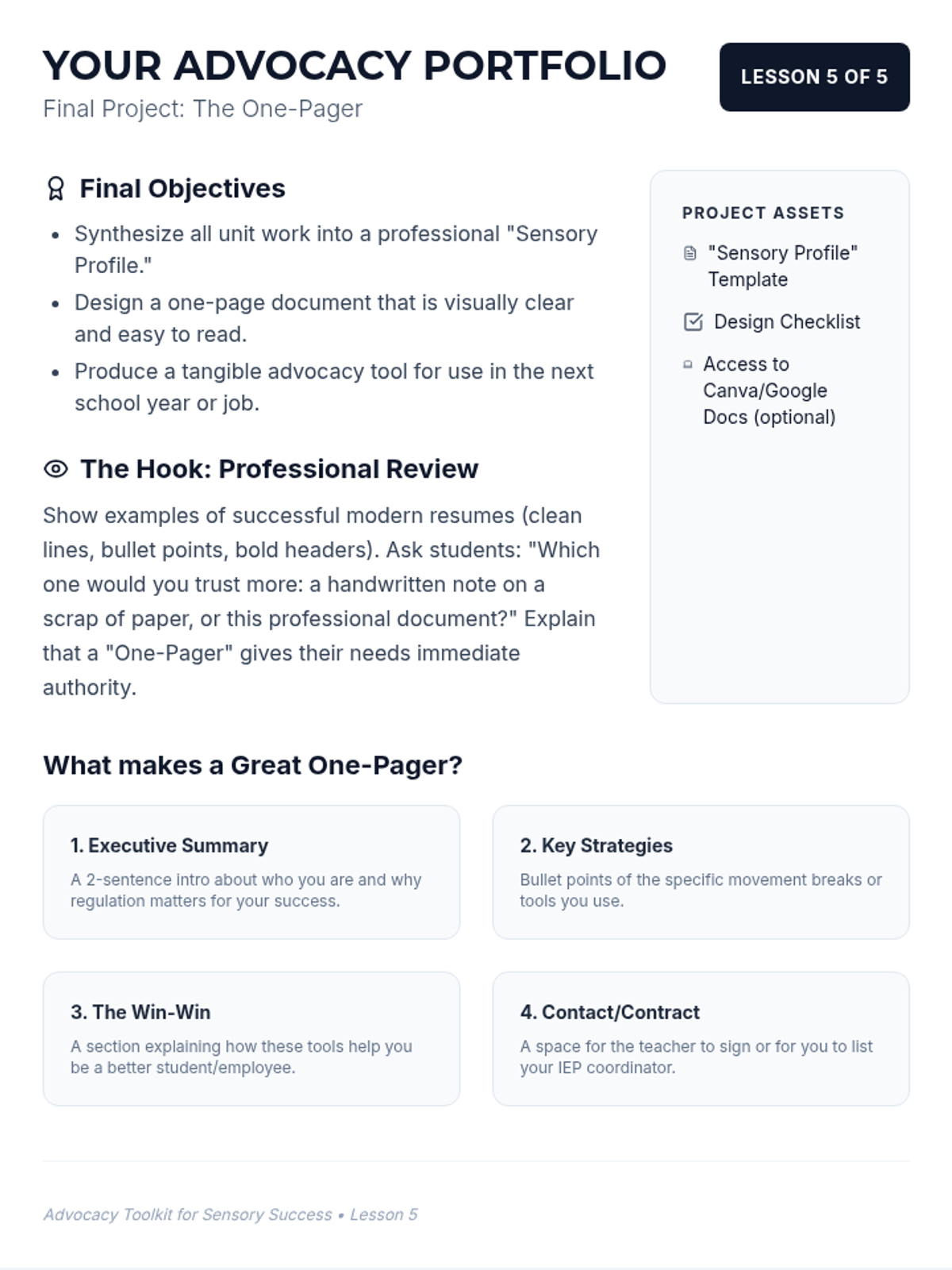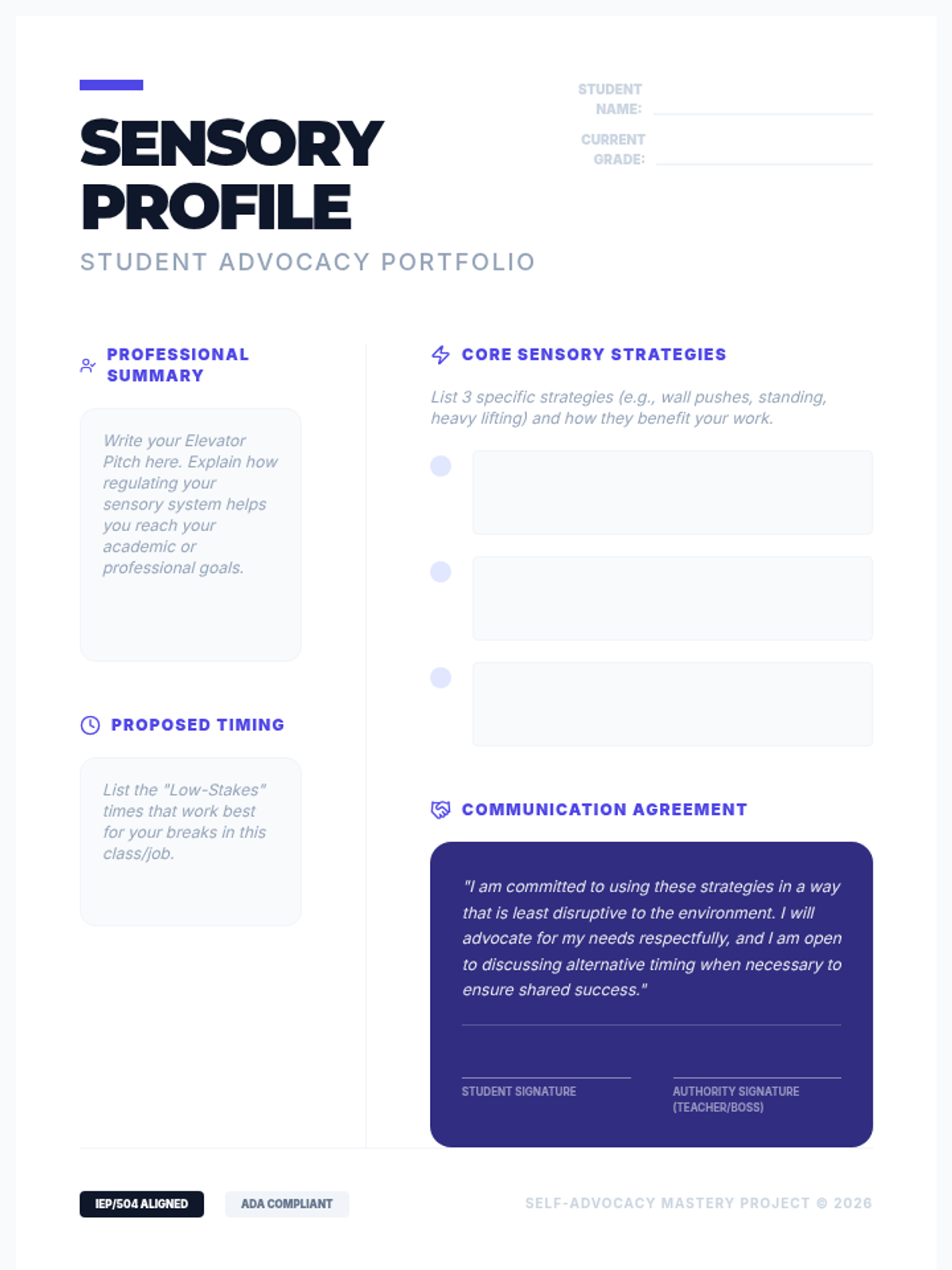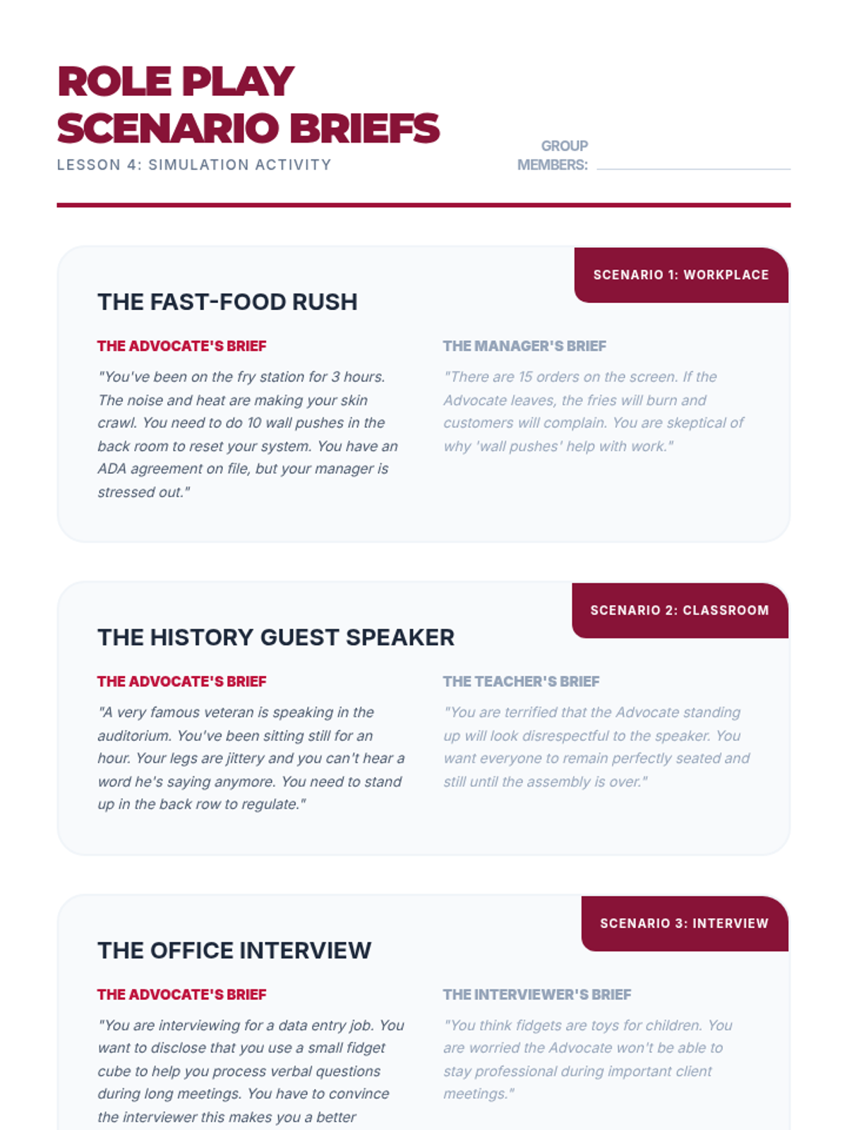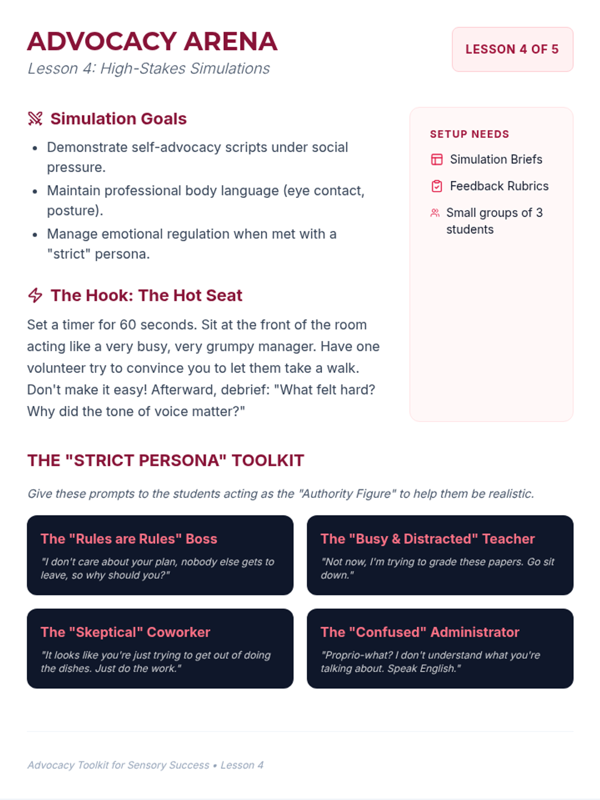 A 10th-grade special education unit focused on empowering students to advocate for sensory regulation needs and movement breaks in academic and professional settings. Students progress from understanding legal rights to drafting scripts and participating in realistic advocacy simulations.