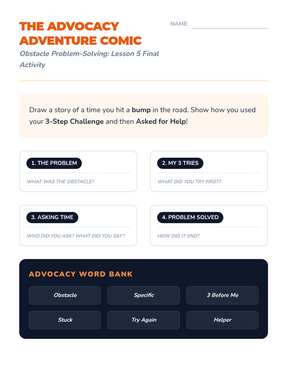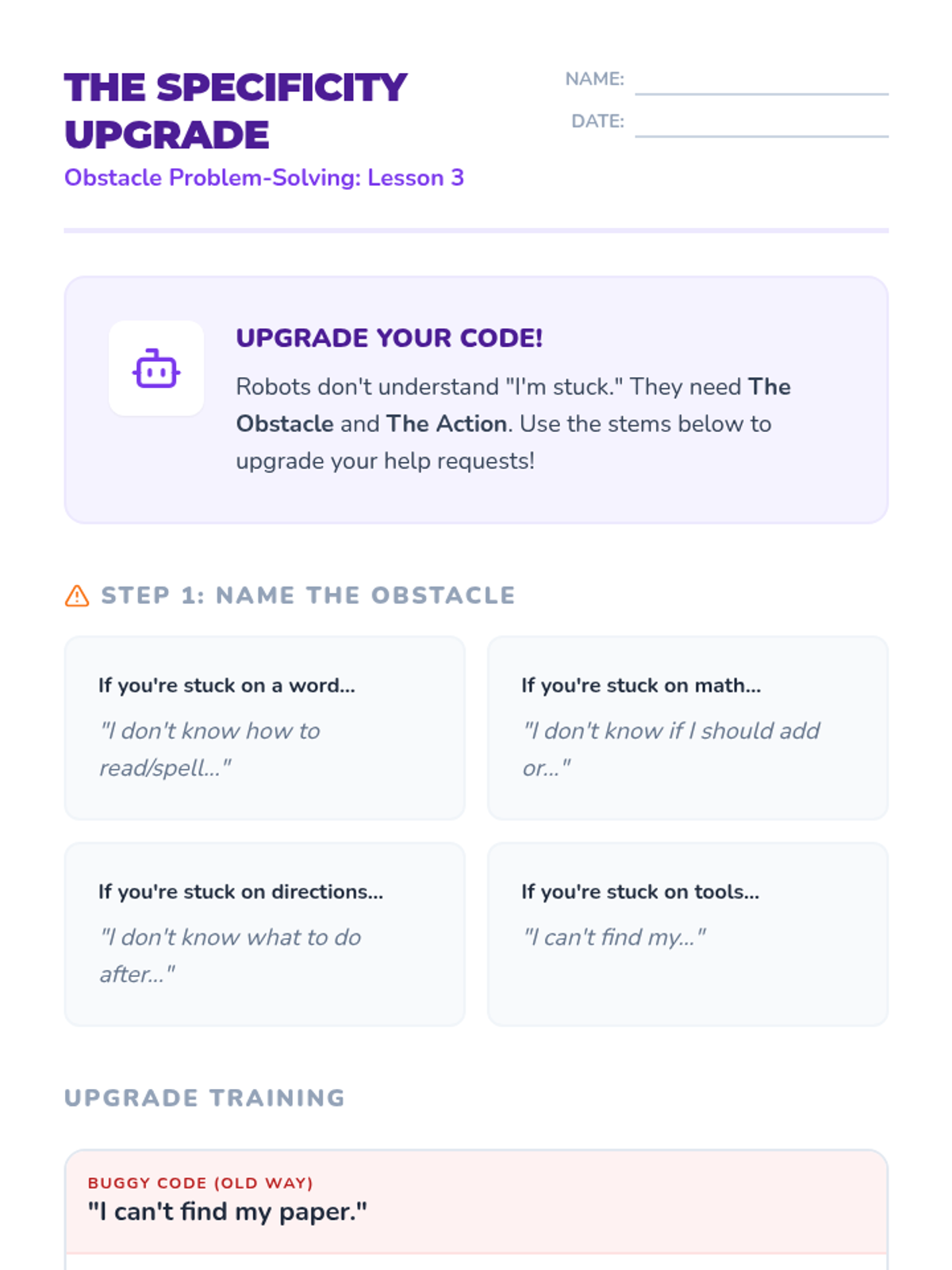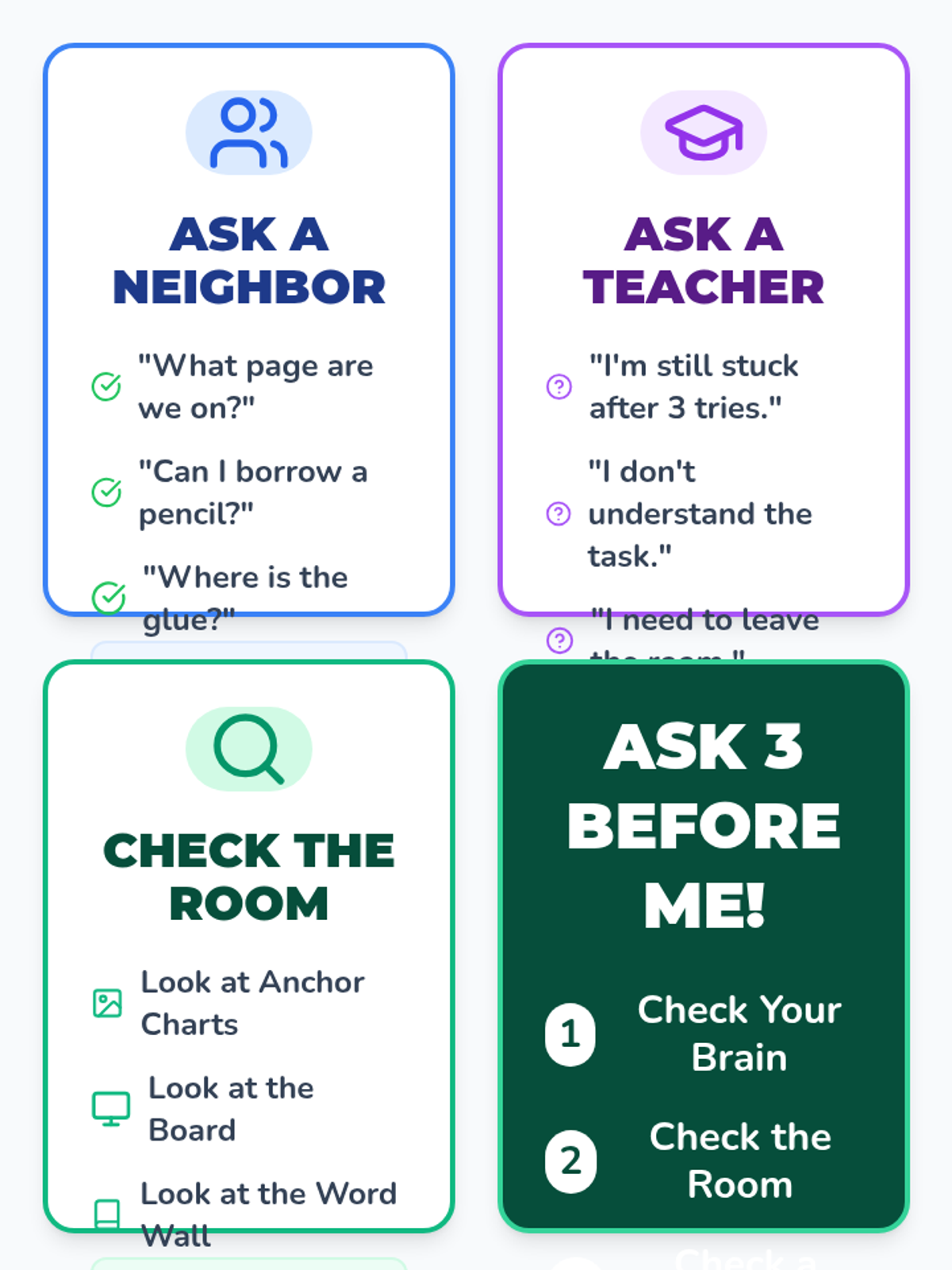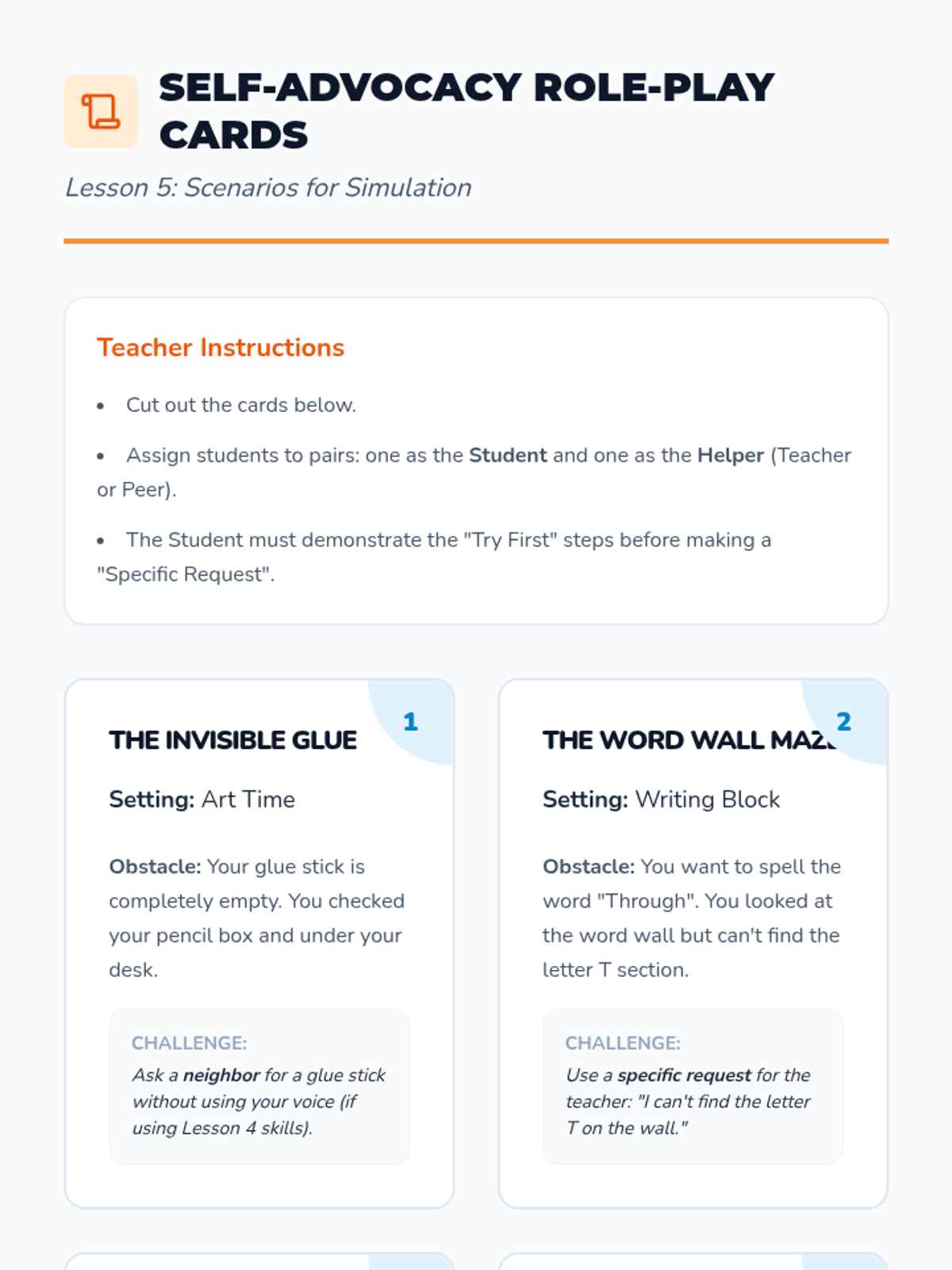 This sequence empowers 2nd-grade students with self-advocacy skills to navigate obstacles. It moves from recognizing when help is needed to choosing the right helper and using specific, actionable language or non-verbal signals.