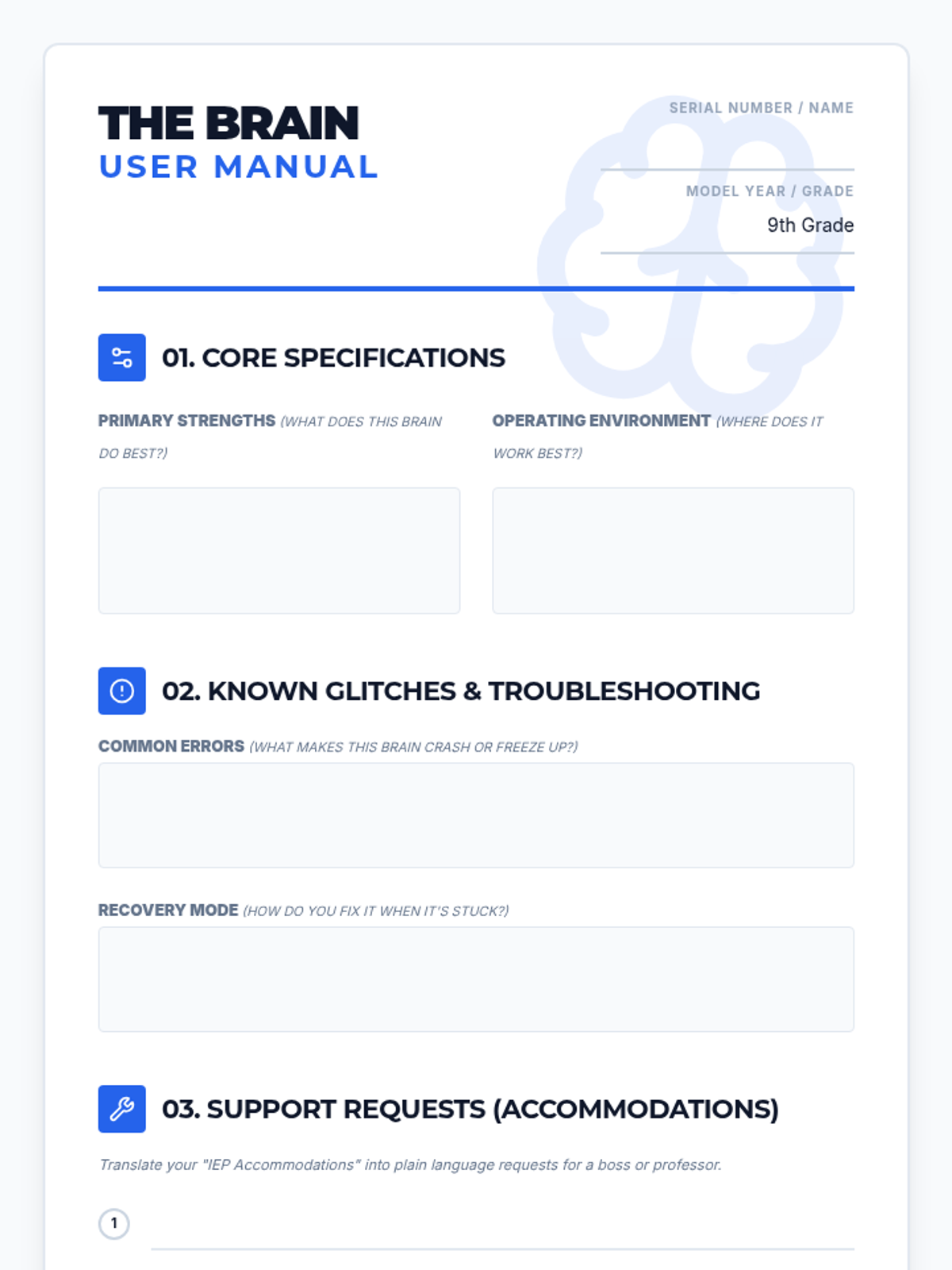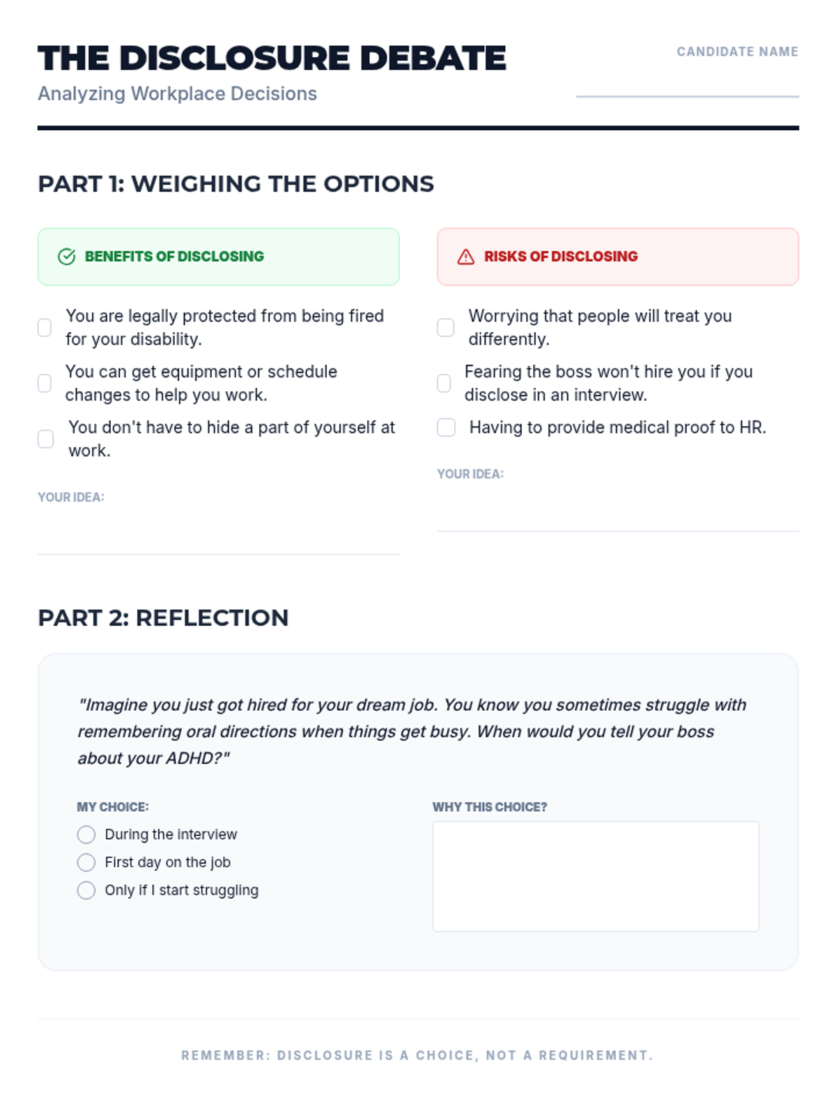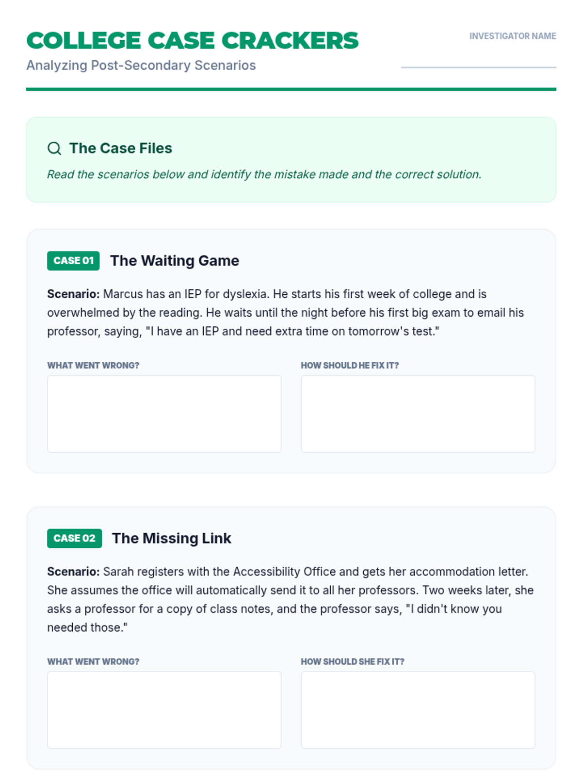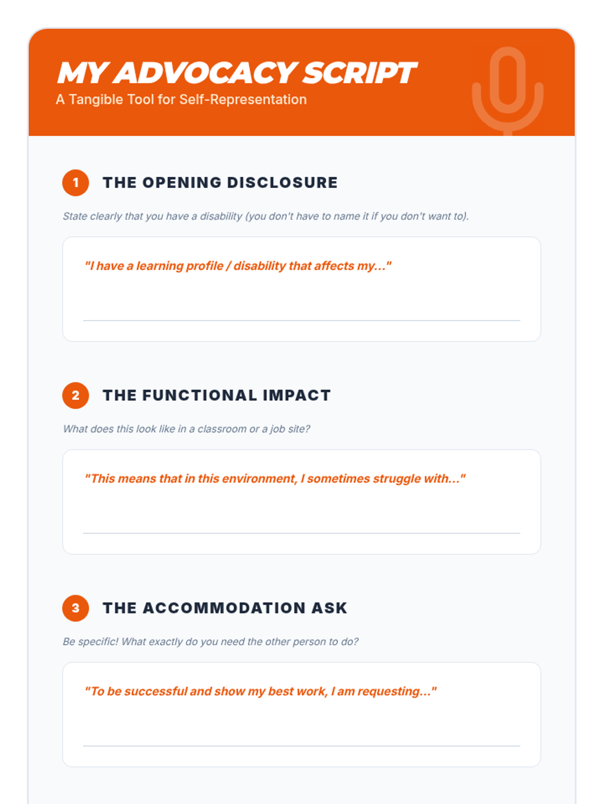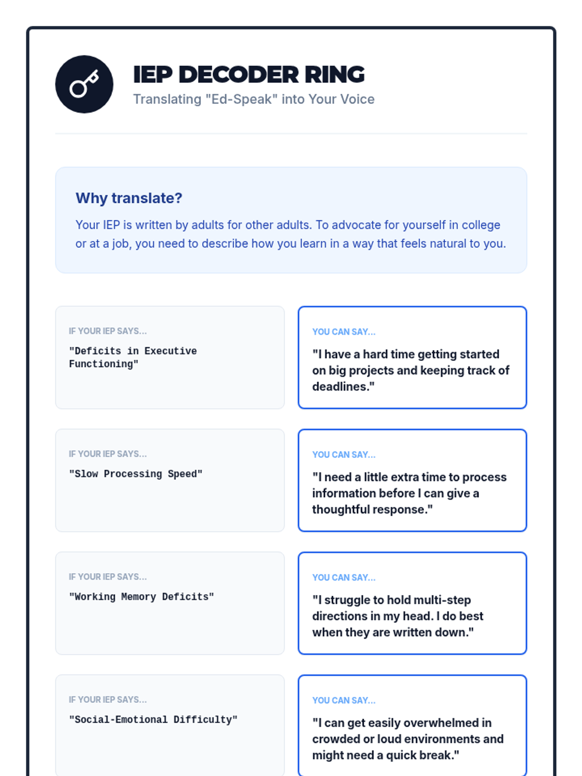 A comprehensive 9th-grade transition sequence focused on the legal shift from IDEA to ADA, helping students develop self-advocacy skills, understand their learning profiles, and practice requesting accommodations in post-secondary environments.