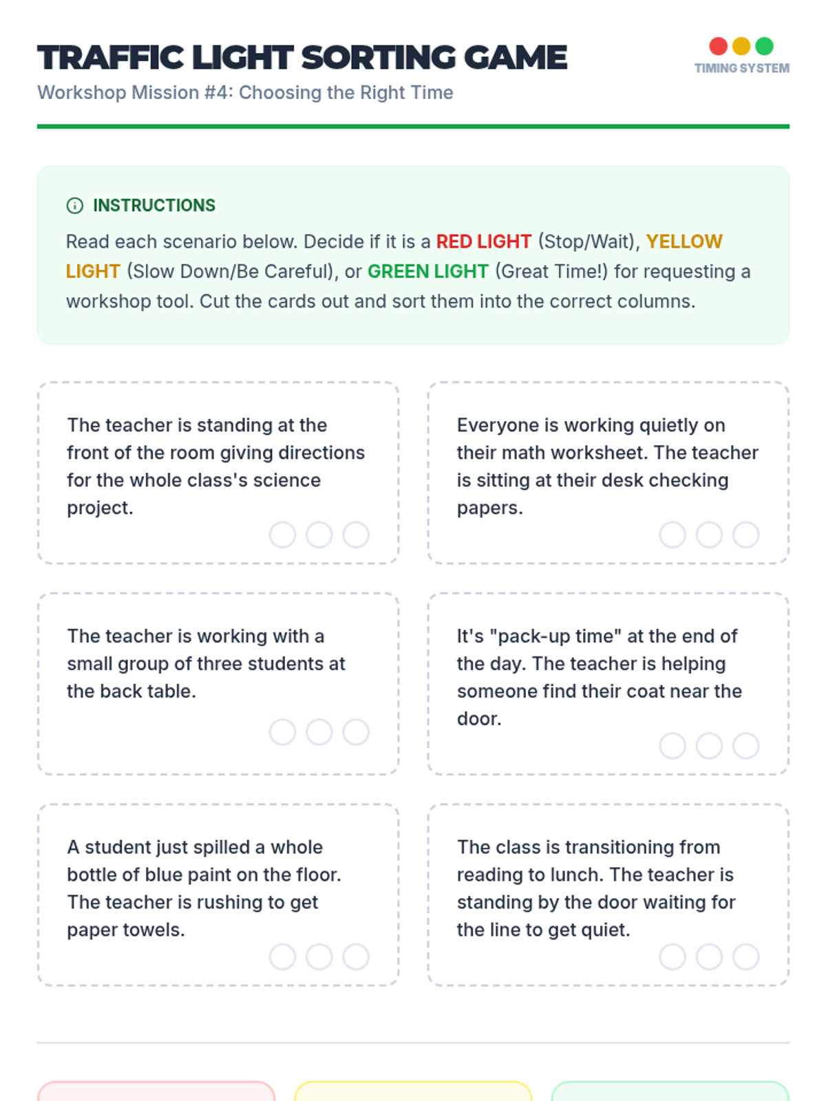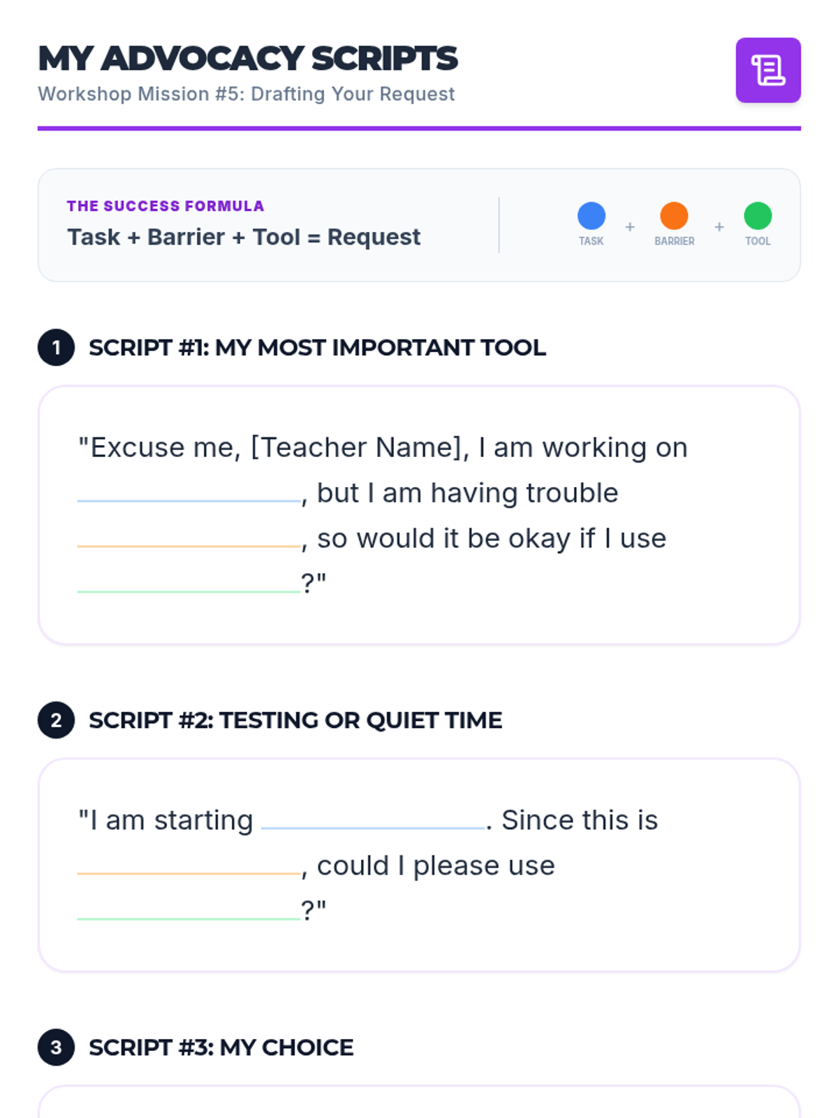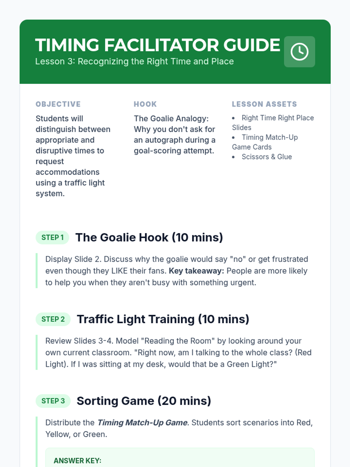 A 5-lesson sequence designed for 3rd-grade students to transition from general problem-solving to self-advocacy. Students learn to distinguish between complaining and advocating, identify appropriate sources of help, draft personal advocacy scripts, and create a physical 'Help Menu' tool for daily use.