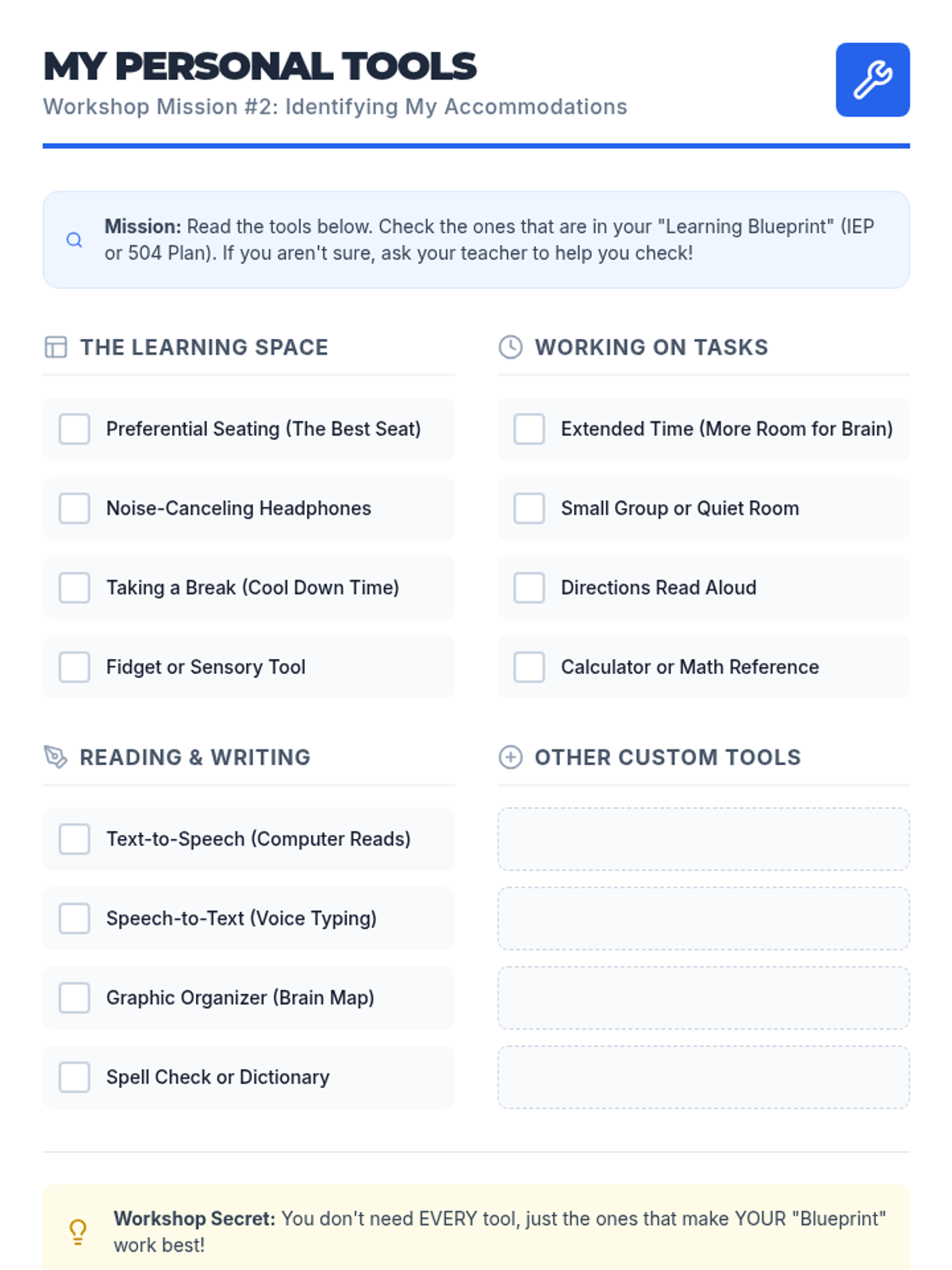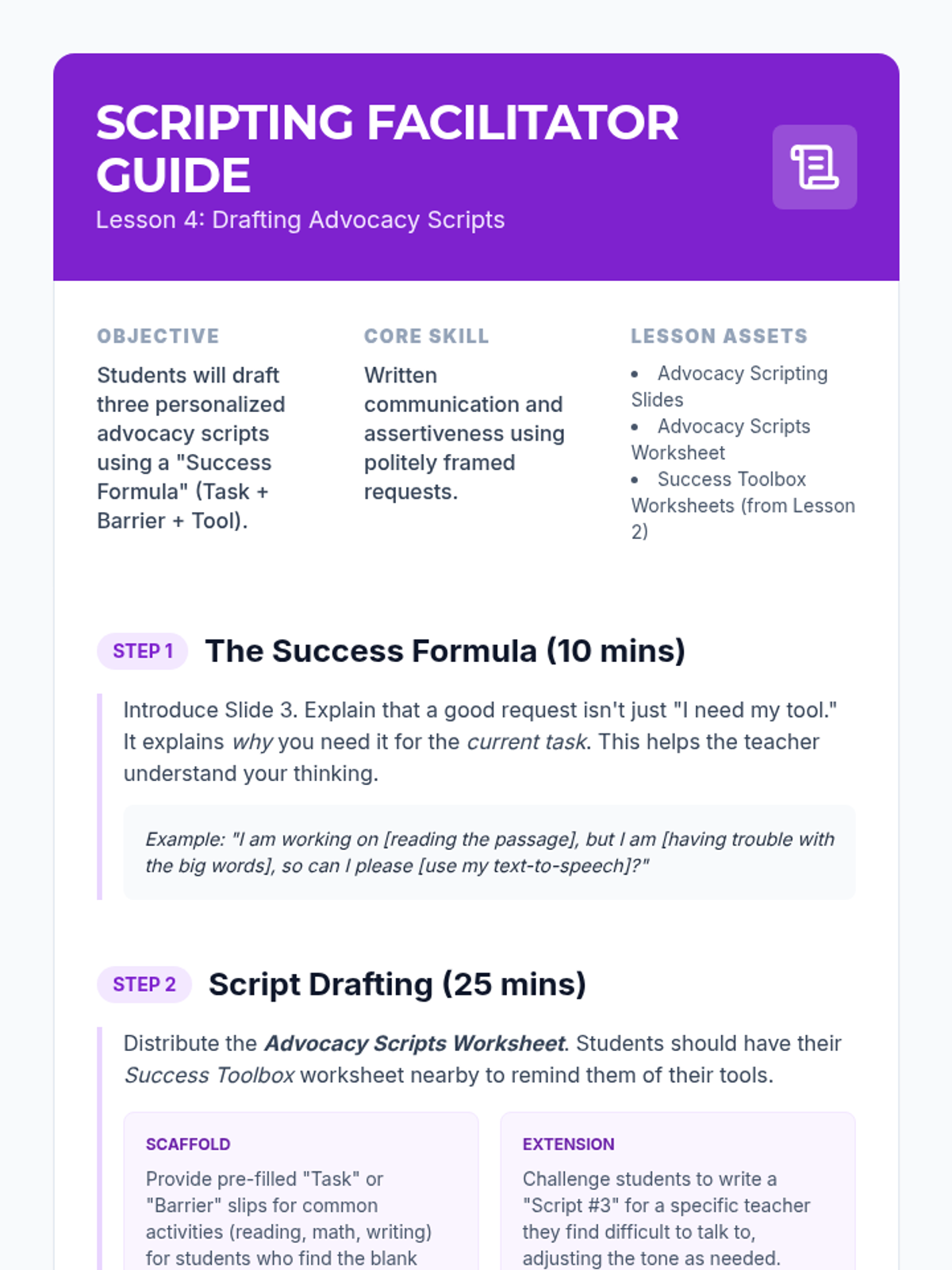 A 5-lesson sequence for 4th-grade students to build self-advocacy skills, focusing on understanding accommodations, identifying personal needs, and practicing effective communication with teachers.