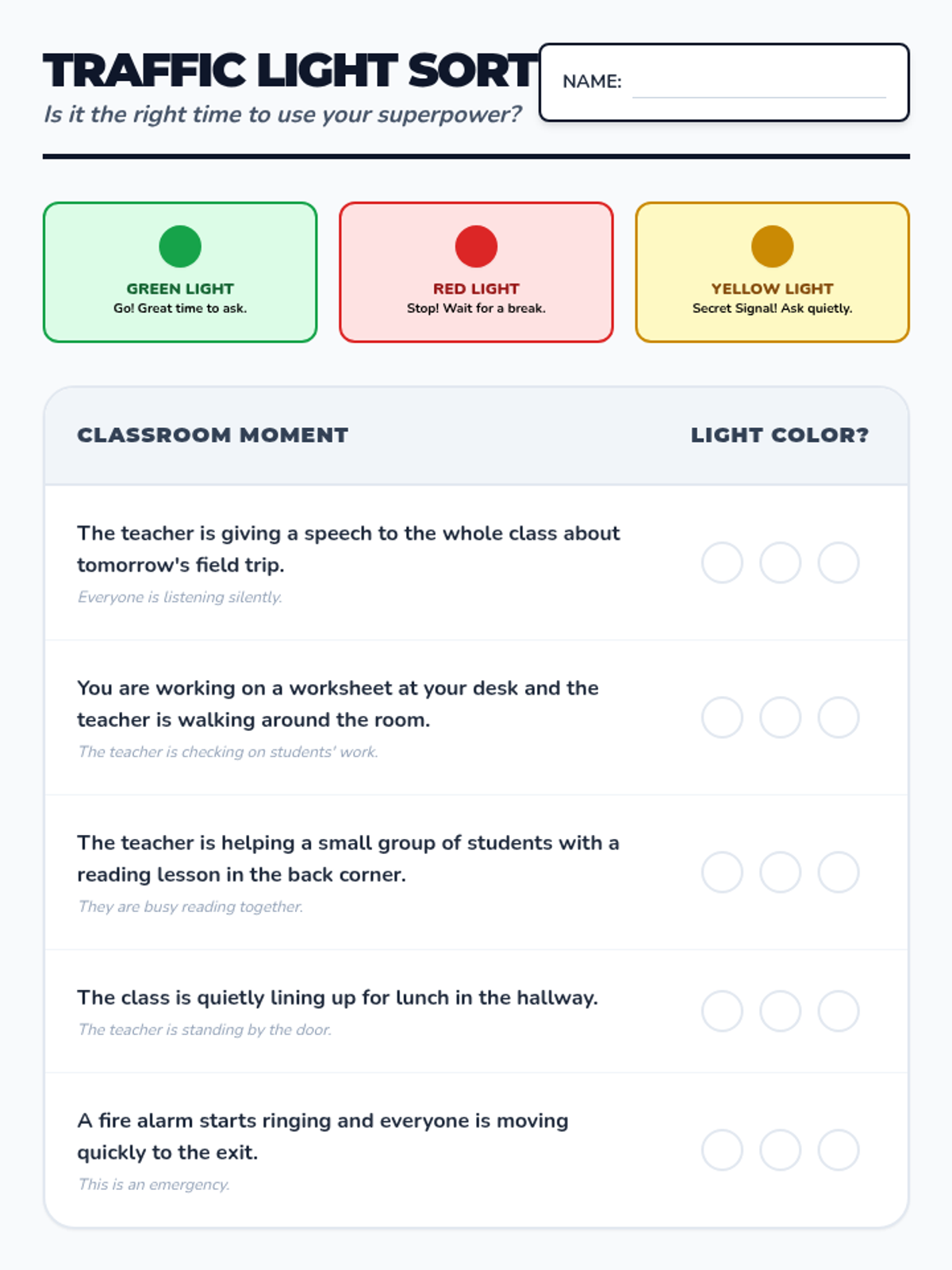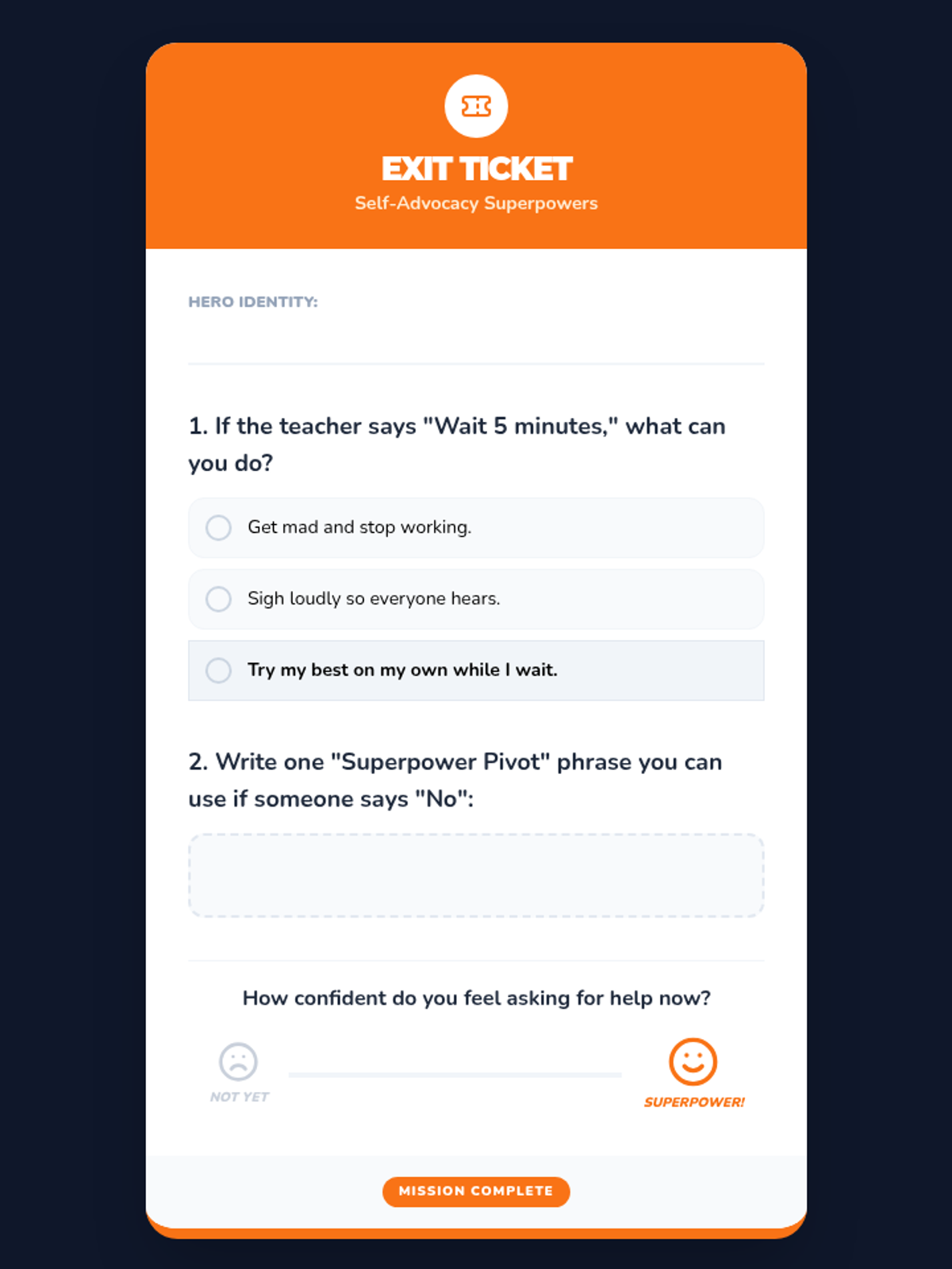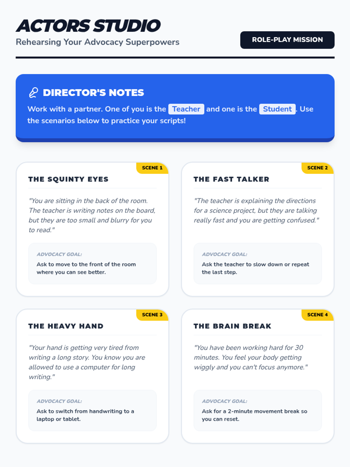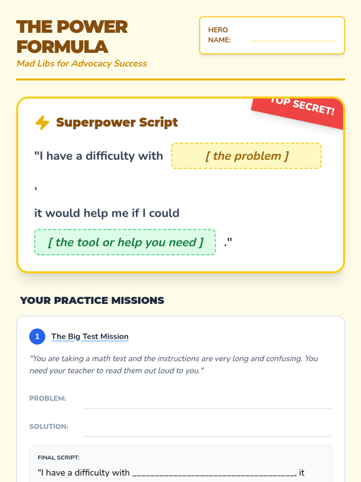 A sequence designed to empower 3rd-grade students with the verbal and social skills needed to advocate for their IEP or 504 supports respectfully and effectively. Students will learn to distinguish between communication styles, construct effective request scripts, and handle various responses from adults.
