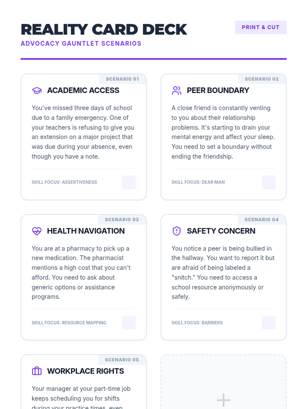 This comprehensive sequence empowers 10th-grade students to overcome barriers to help-seeking and master assertive communication. Through resource mapping, skill-building workshops, and healthcare simulations, students develop a practical toolkit for navigating complex health and social challenges independently and effectively.