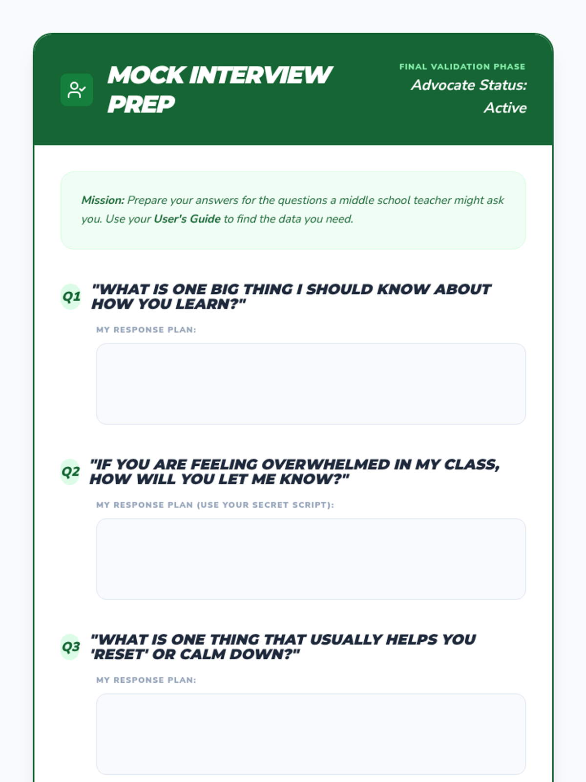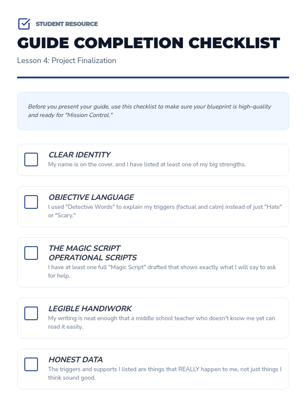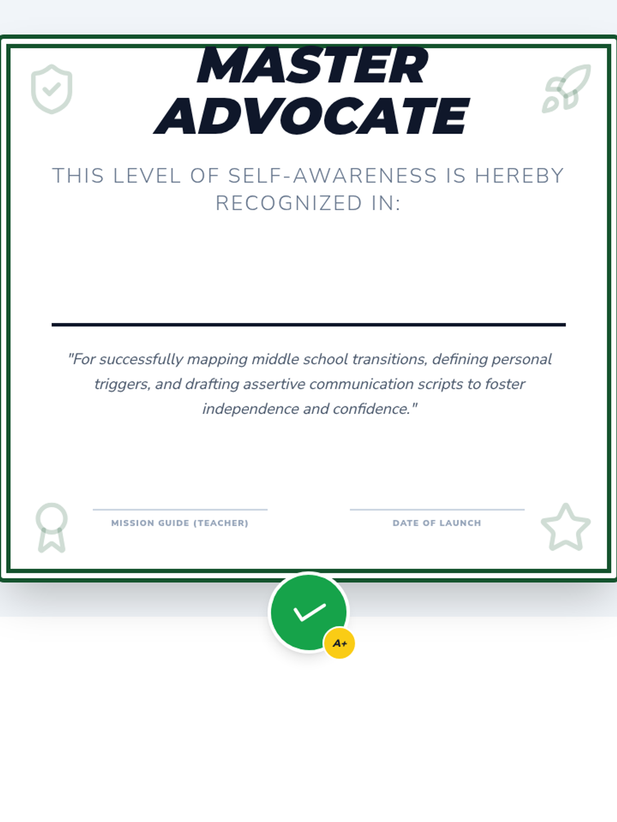 A 5-lesson sequence designed to help 5th-grade students prepare for middle school through self-advocacy and the creation of a 'User's Guide to Me.' Students identify stressors, define triggers, and draft assertive communication scripts to build confidence for their transition.