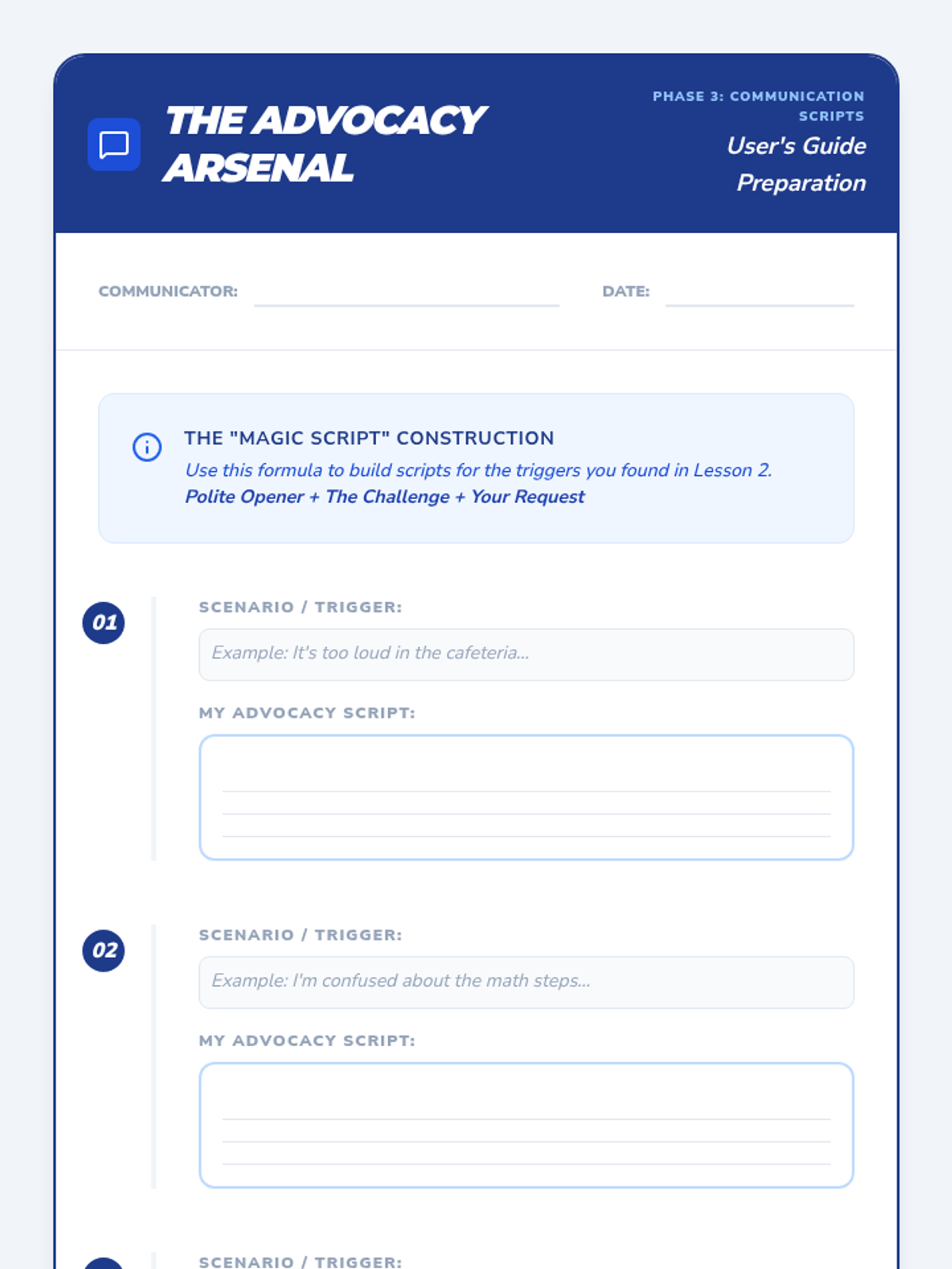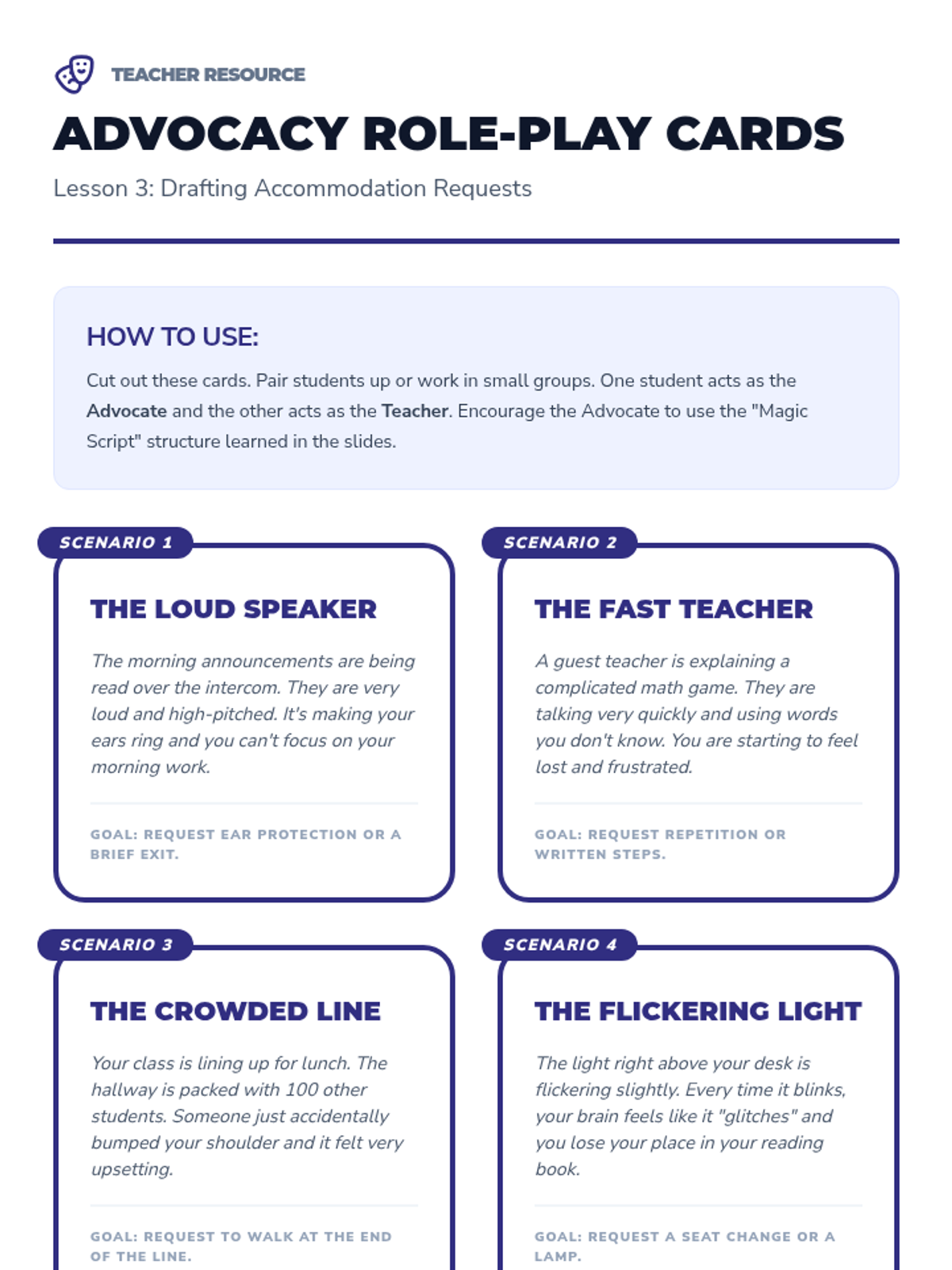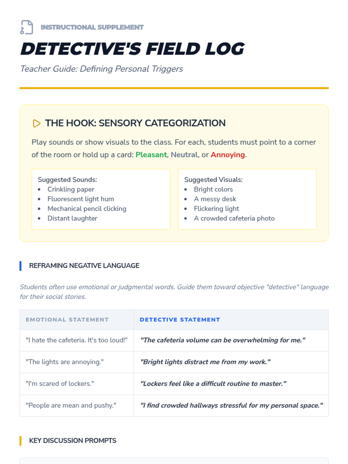 A 5-lesson sequence designed to help 5th-grade students prepare for middle school through self-advocacy and the creation of a 'User's Guide to Me.' Students identify stressors, define triggers, and draft assertive communication scripts to build confidence for their transition.