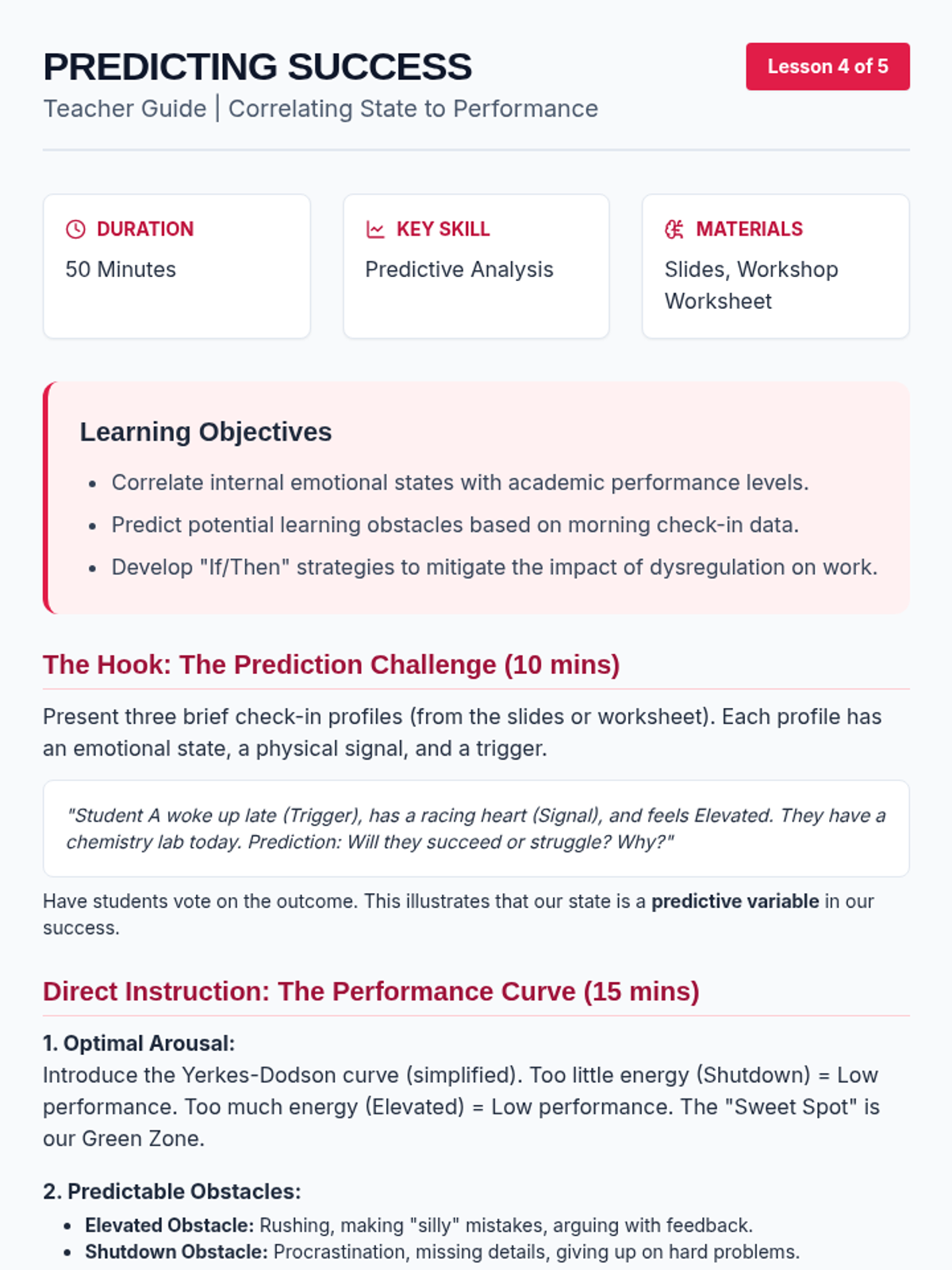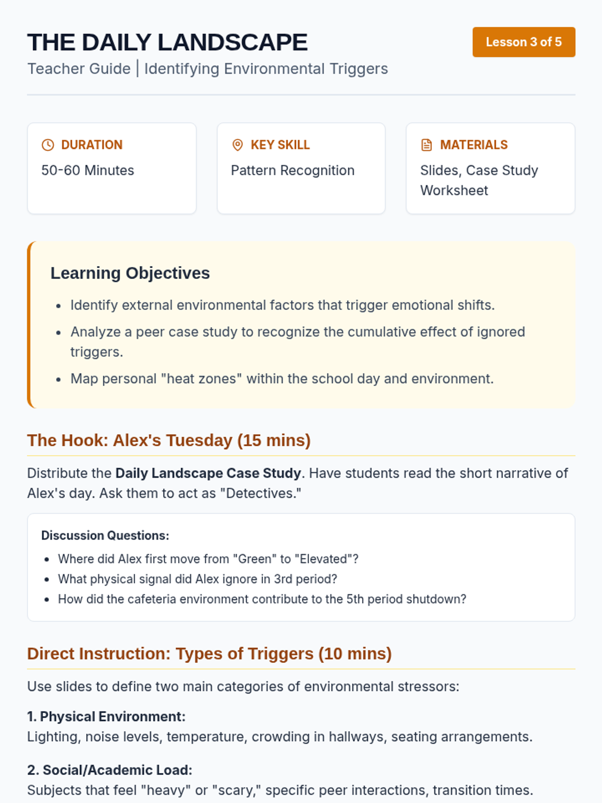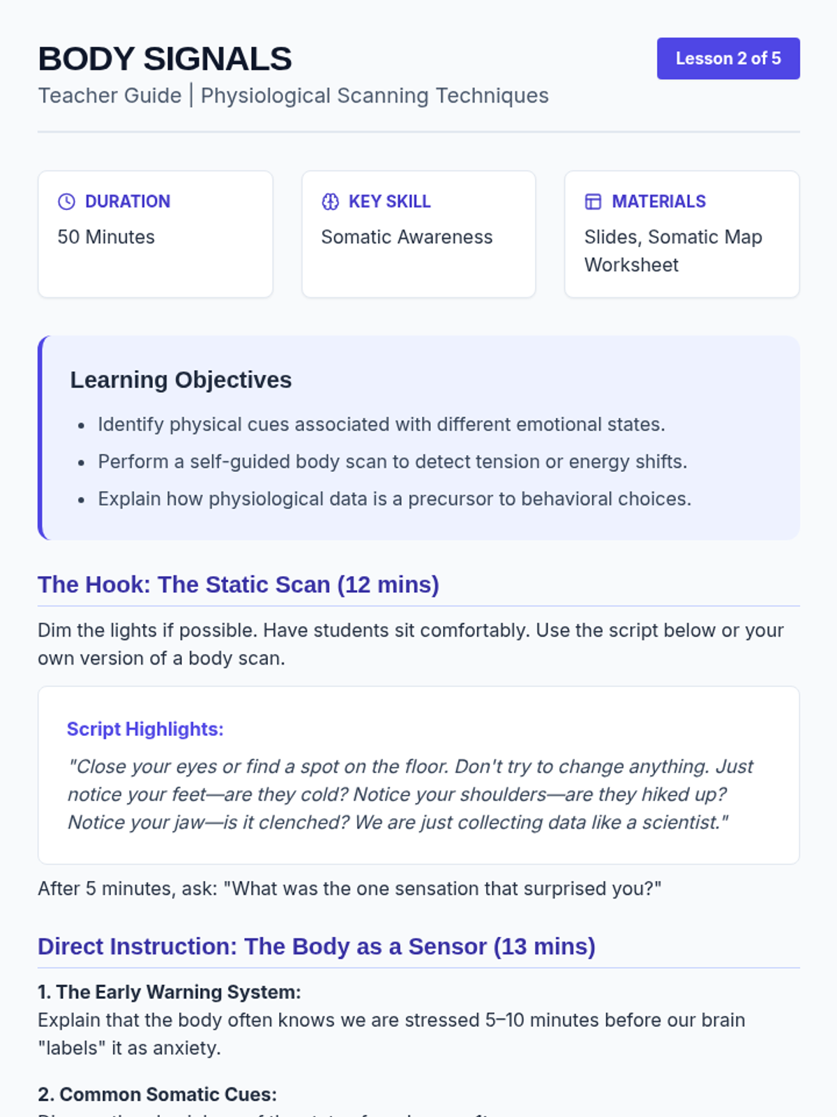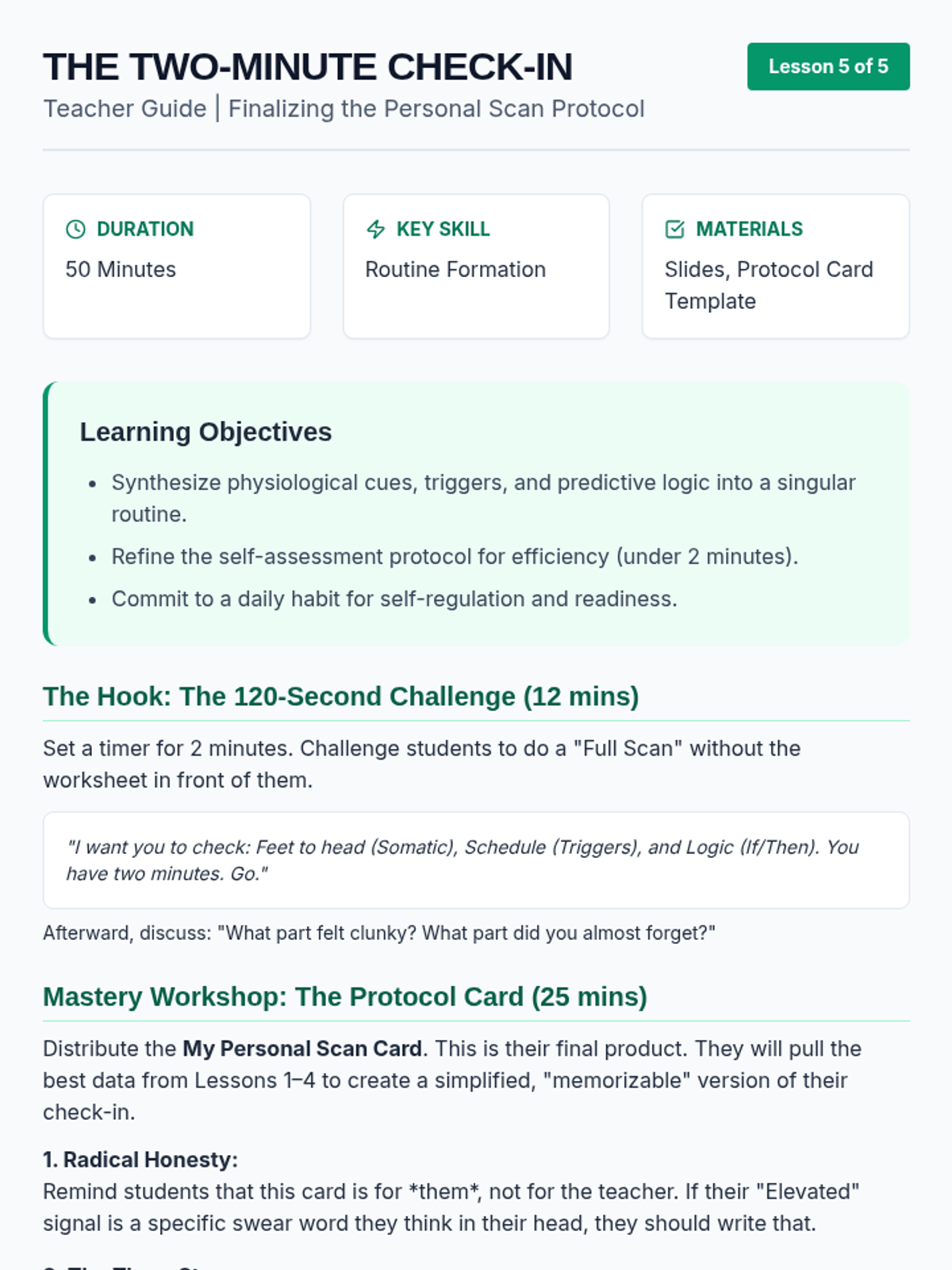 This sequence guides students through the internal process of self-assessment required for effective daily check-ins. Students learn to recognize physiological cues and environmental triggers that impact their readiness to learn, eventually developing a personalized 2-minute mental scan protocol.
