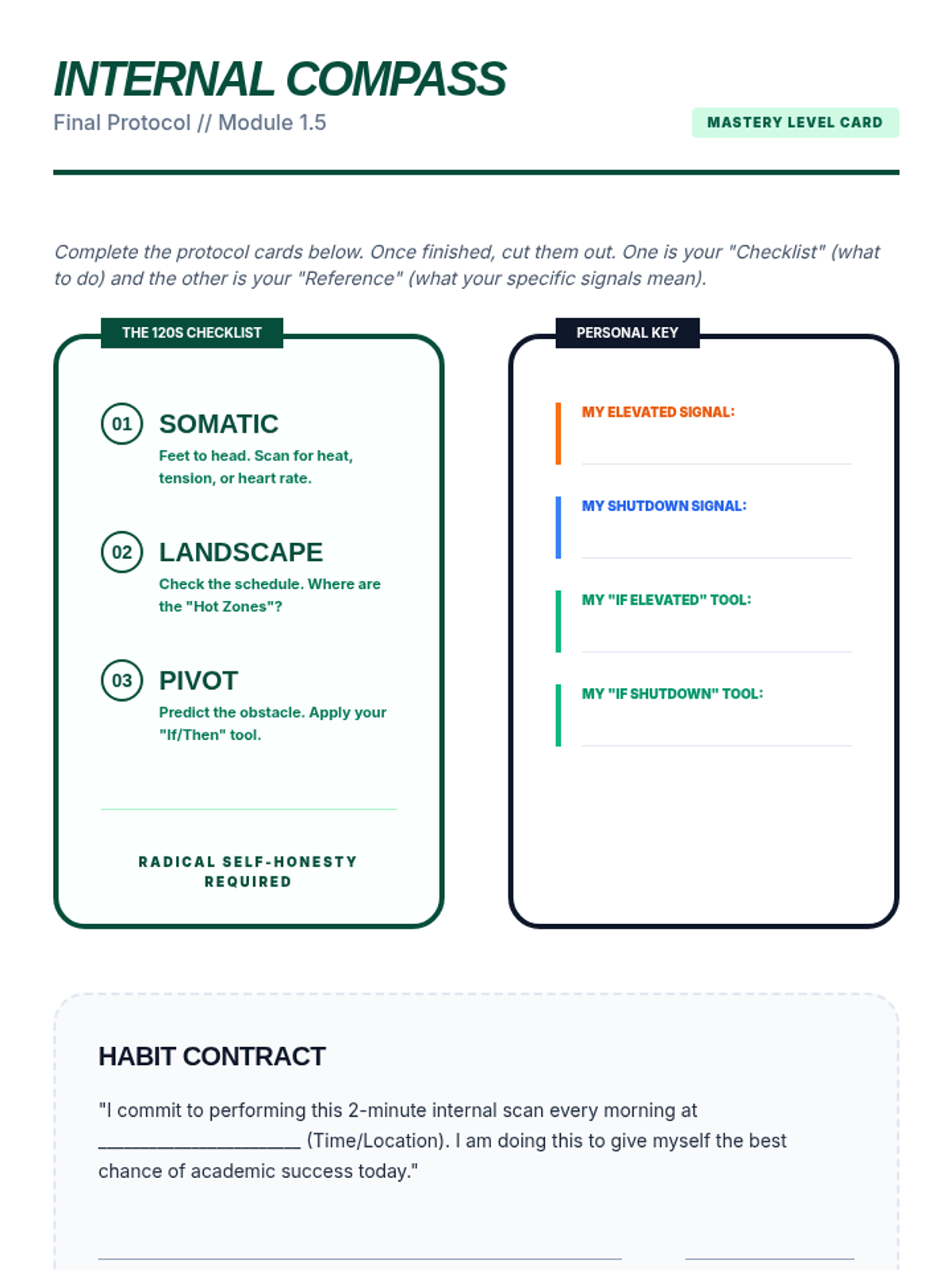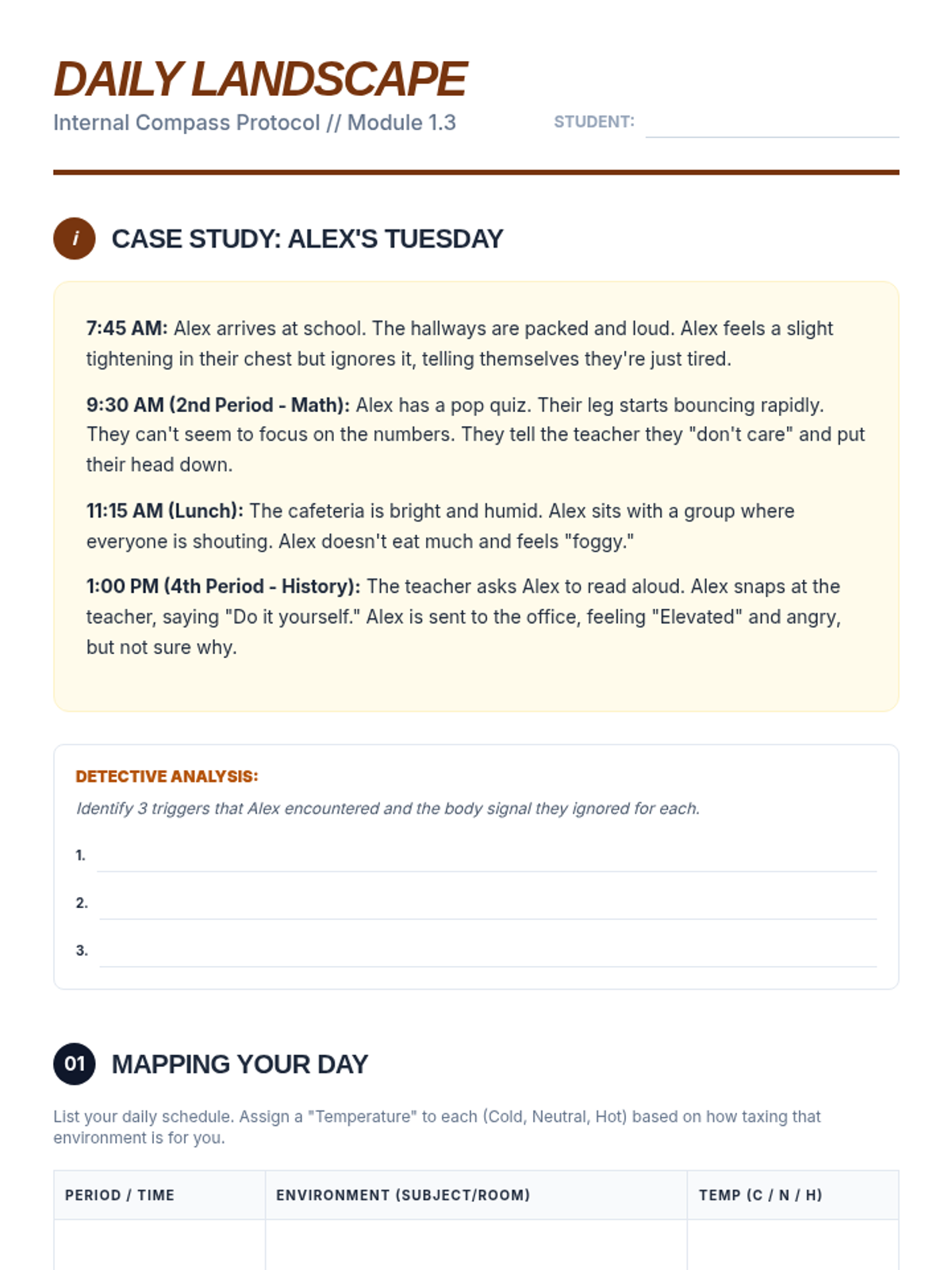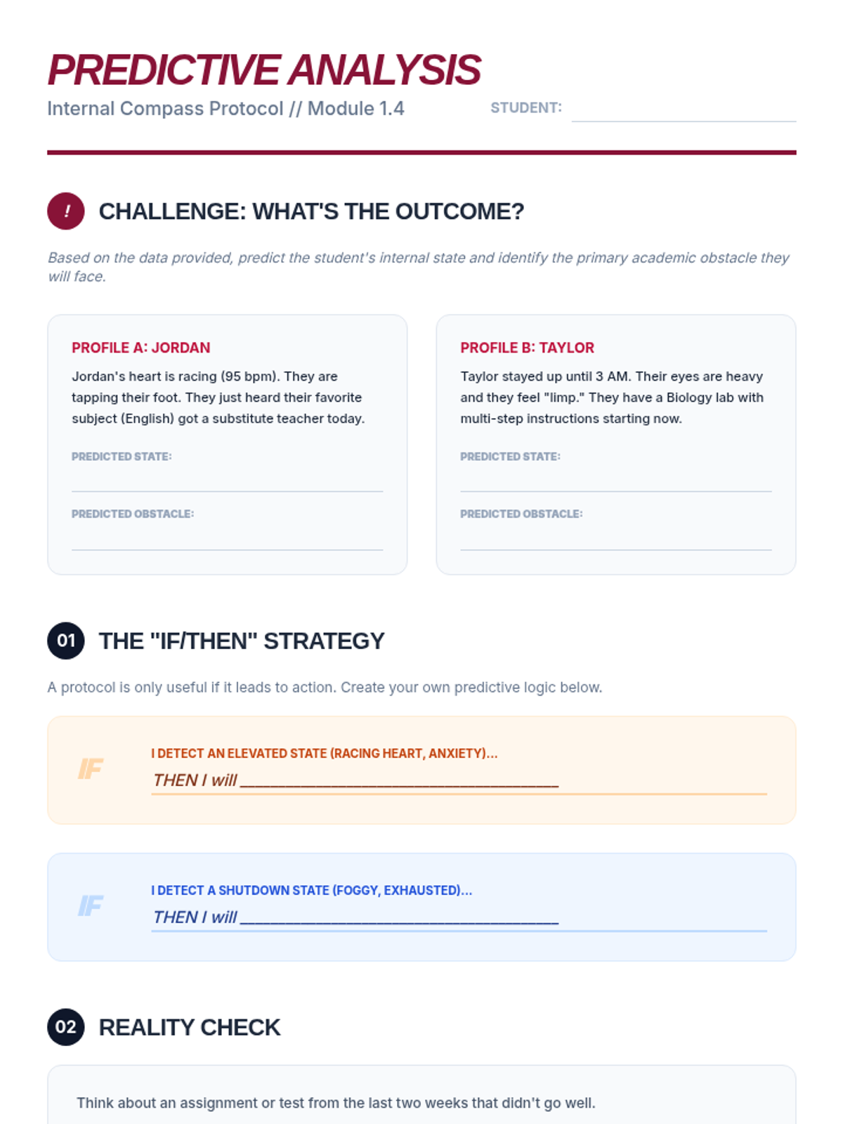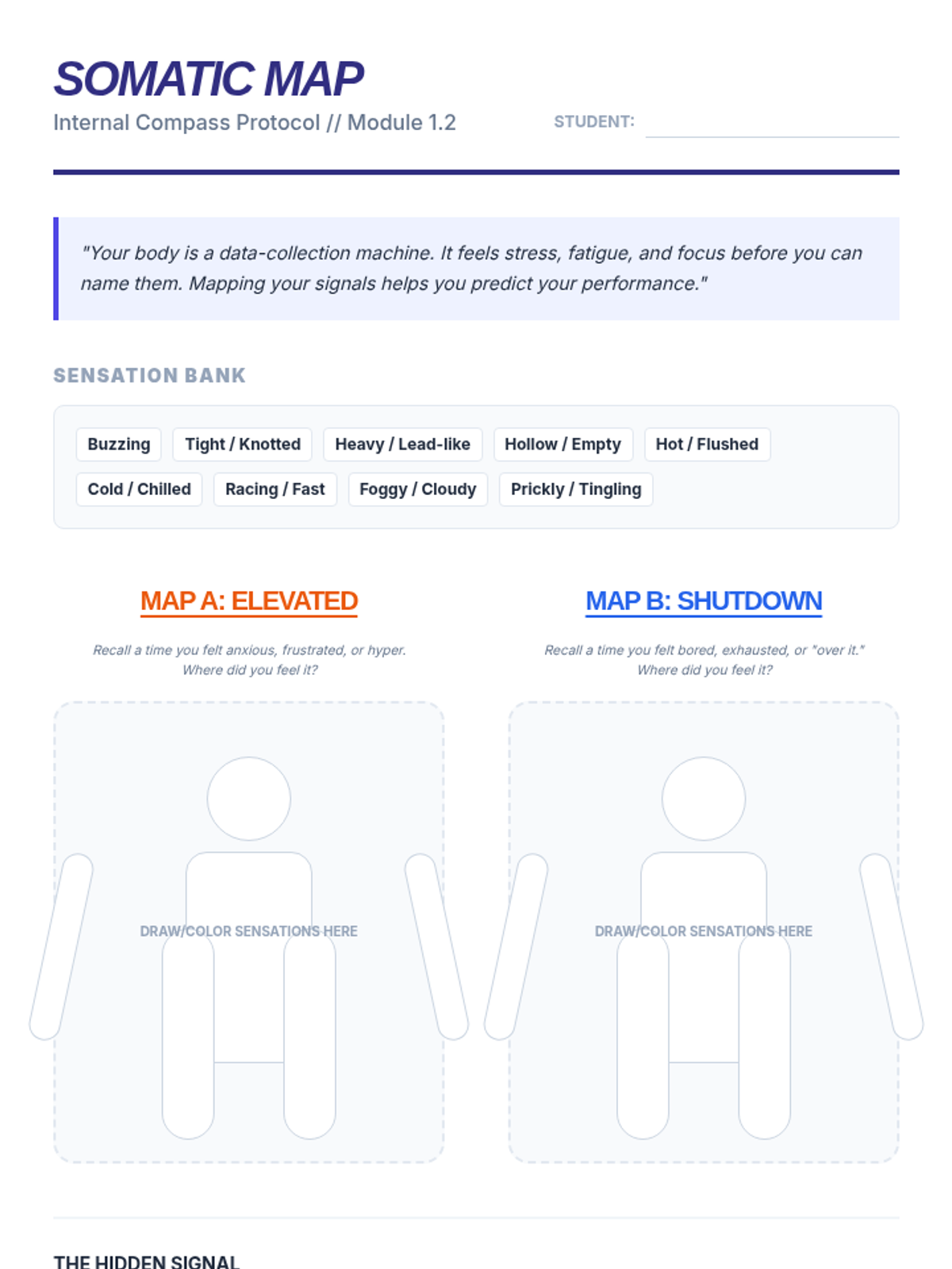 This sequence guides students through the internal process of self-assessment required for effective daily check-ins. Students learn to recognize physiological cues and environmental triggers that impact their readiness to learn, eventually developing a personalized 2-minute mental scan protocol.