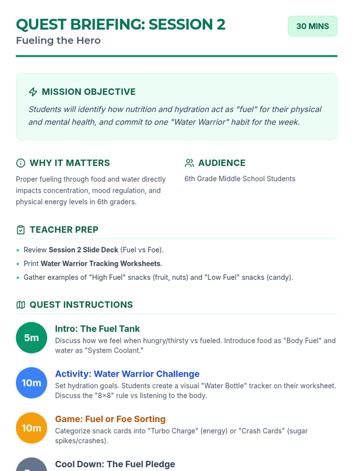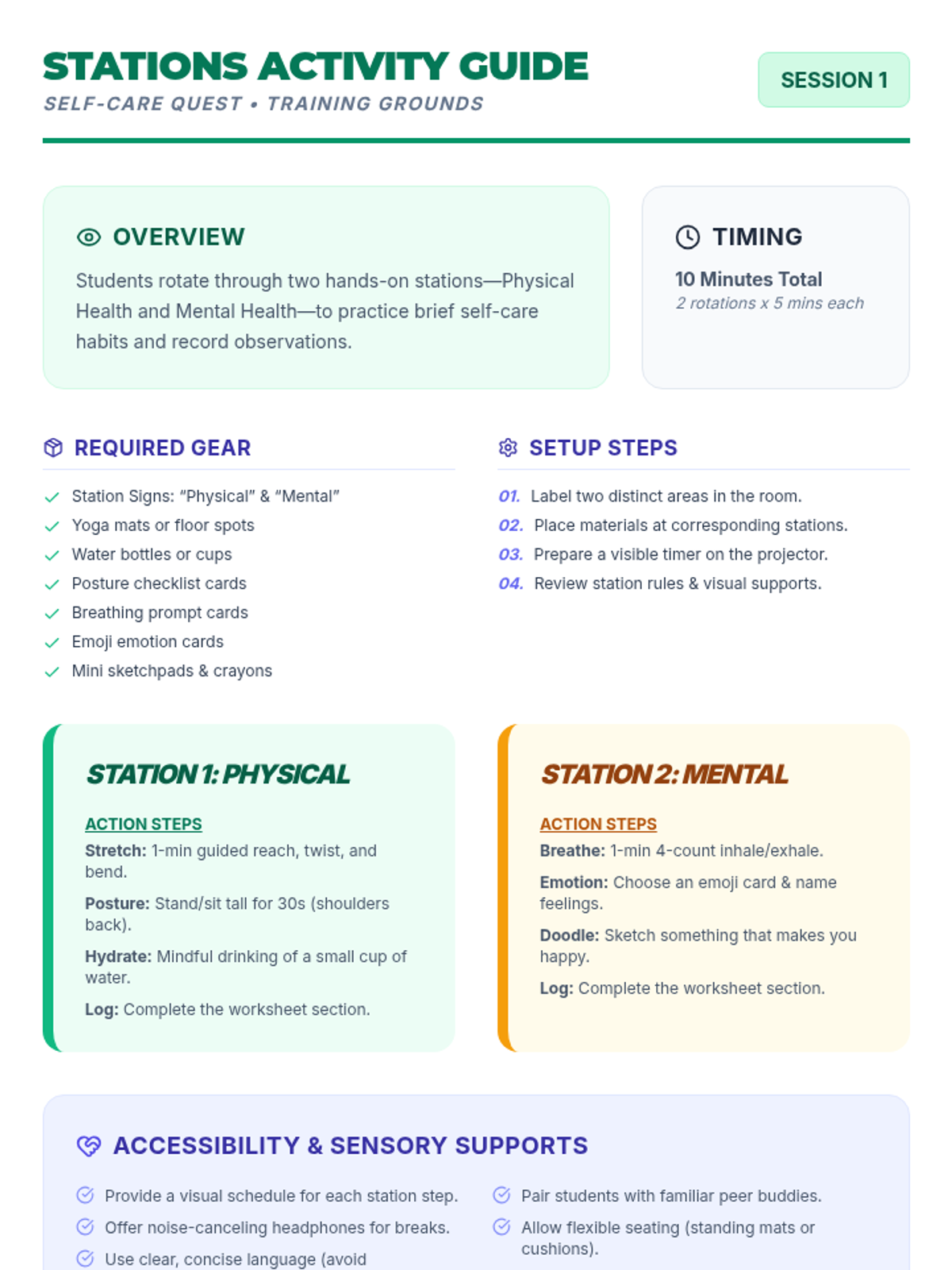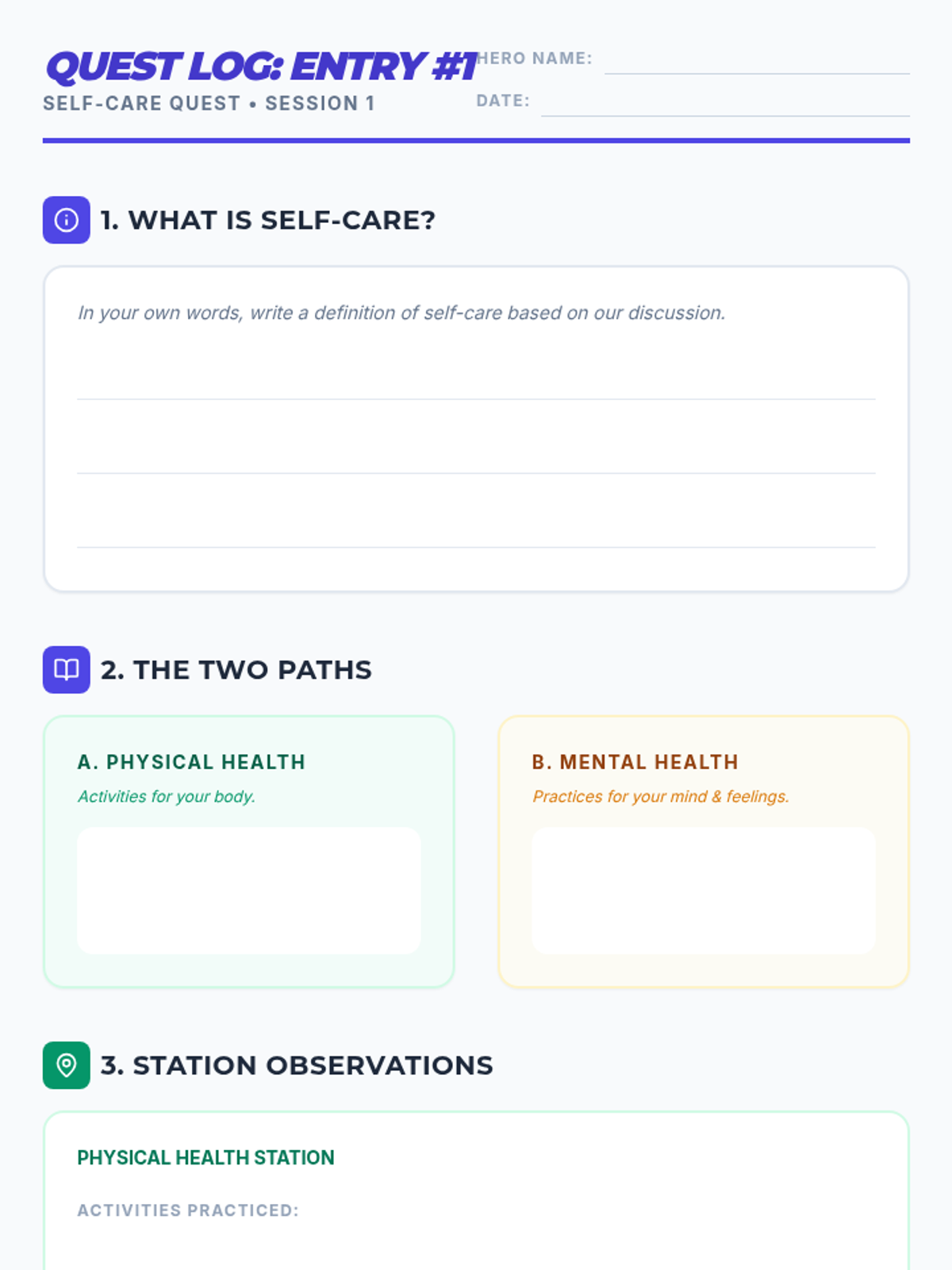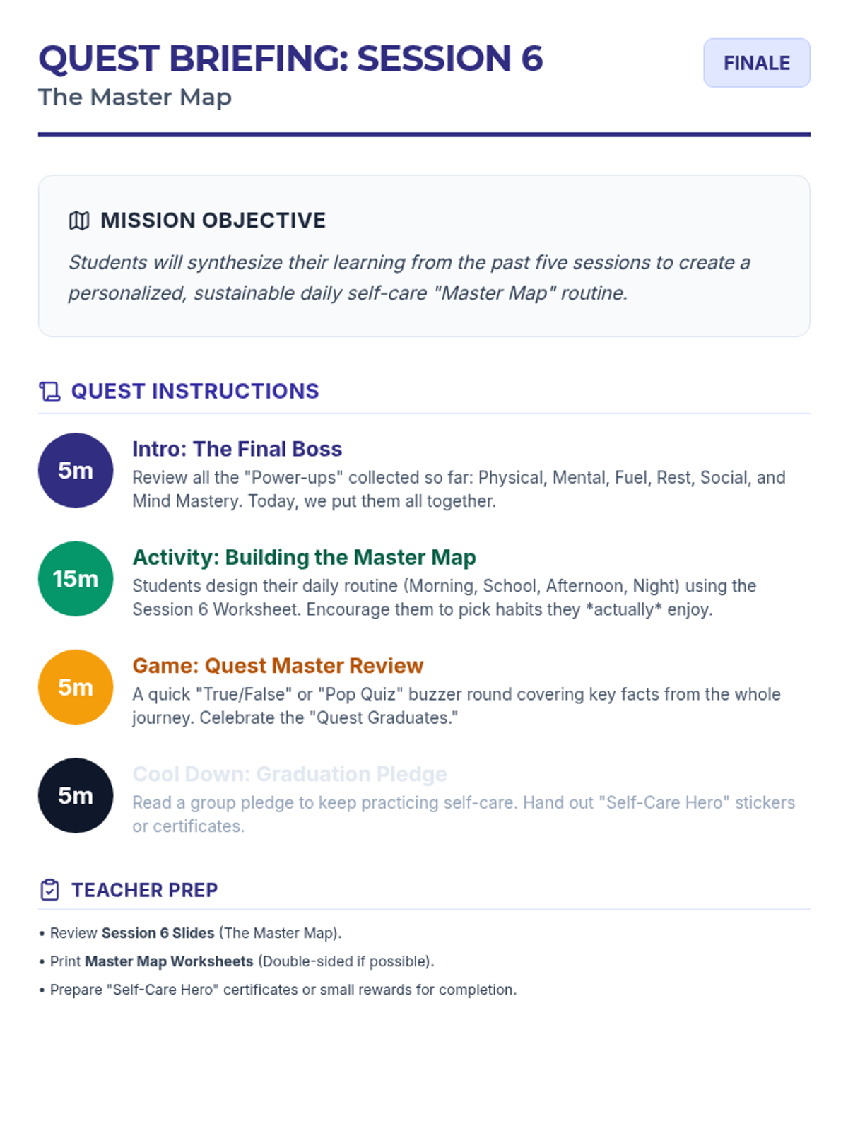 A 6-session comprehensive wellness journey for 6th graders to master physical and mental self-care through an interactive "quest" theme. Students build a personalized routine while engaging in hands-on activities, games, and reflections.