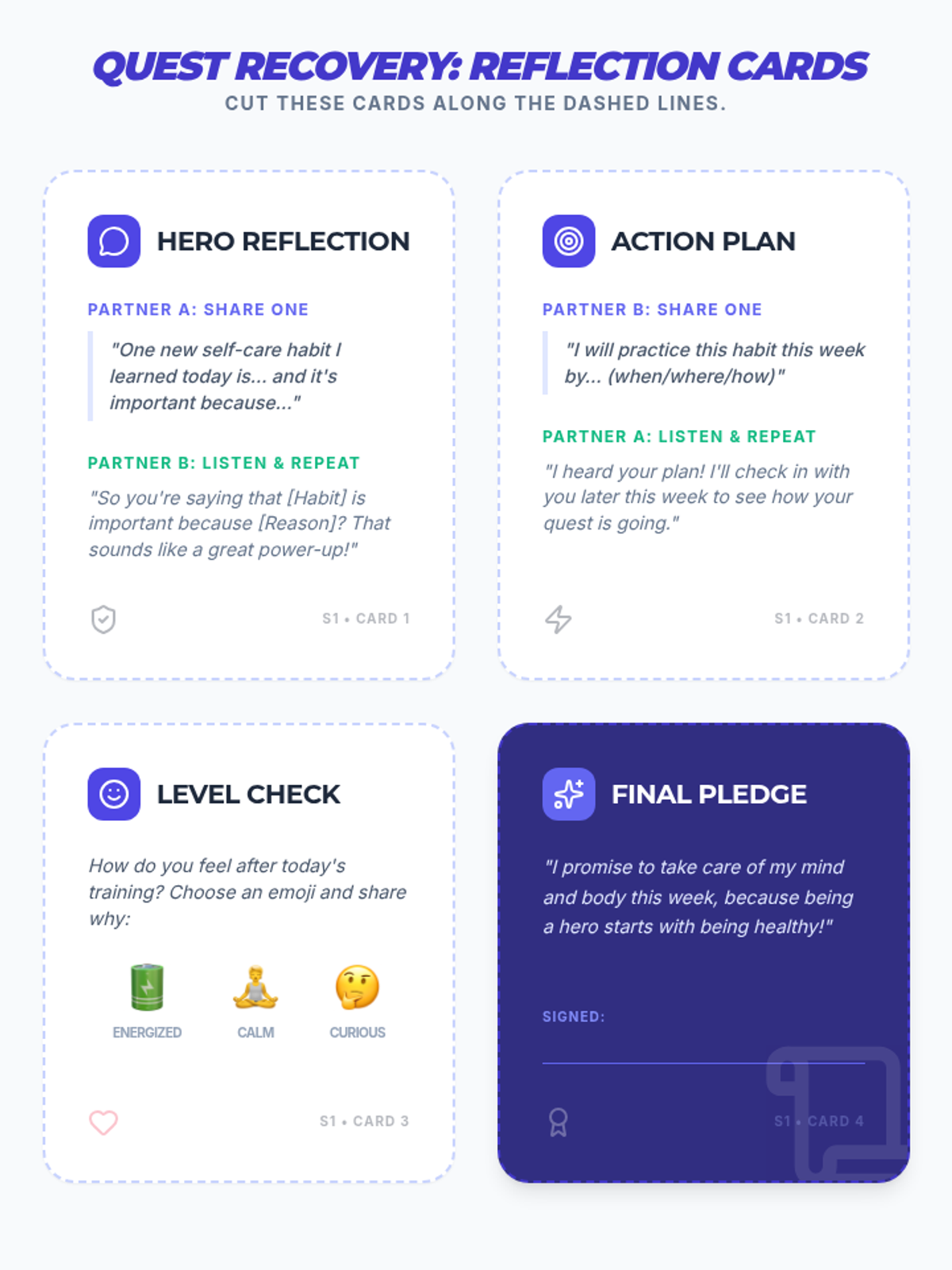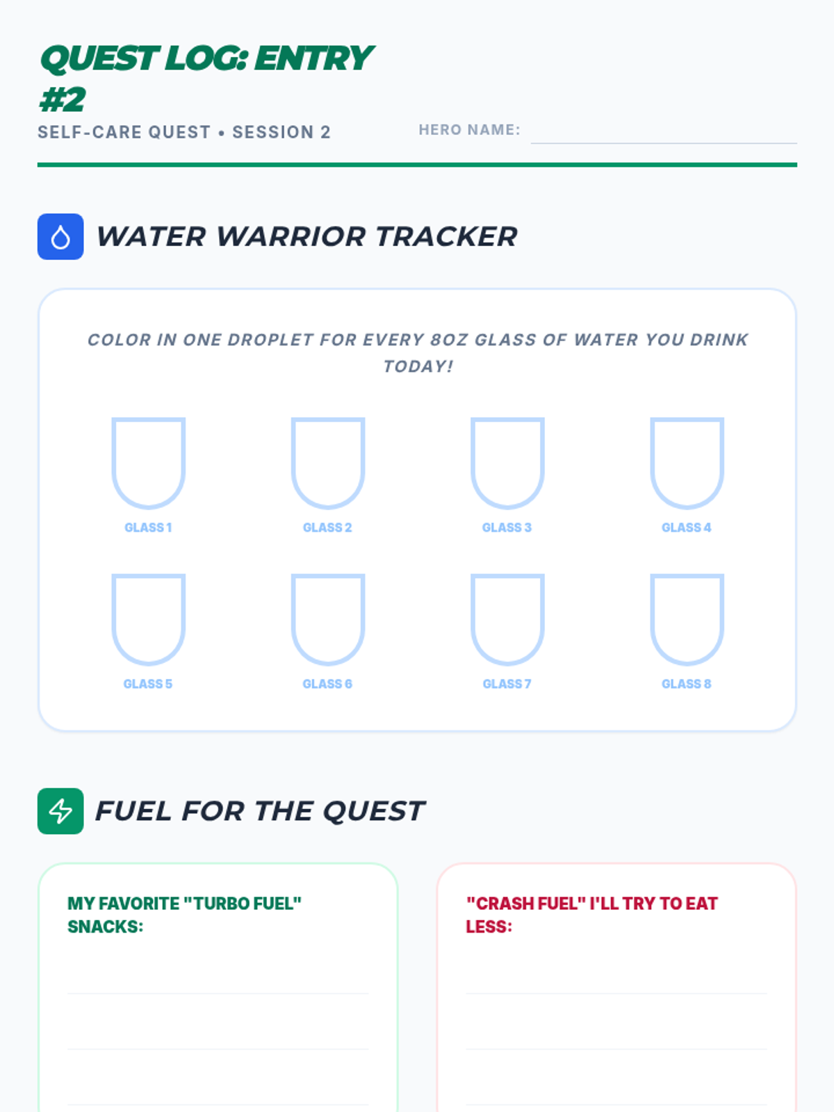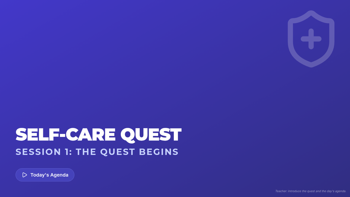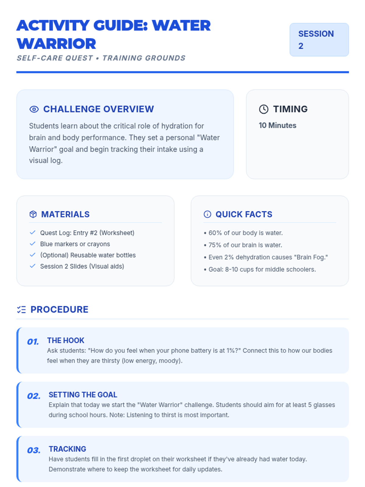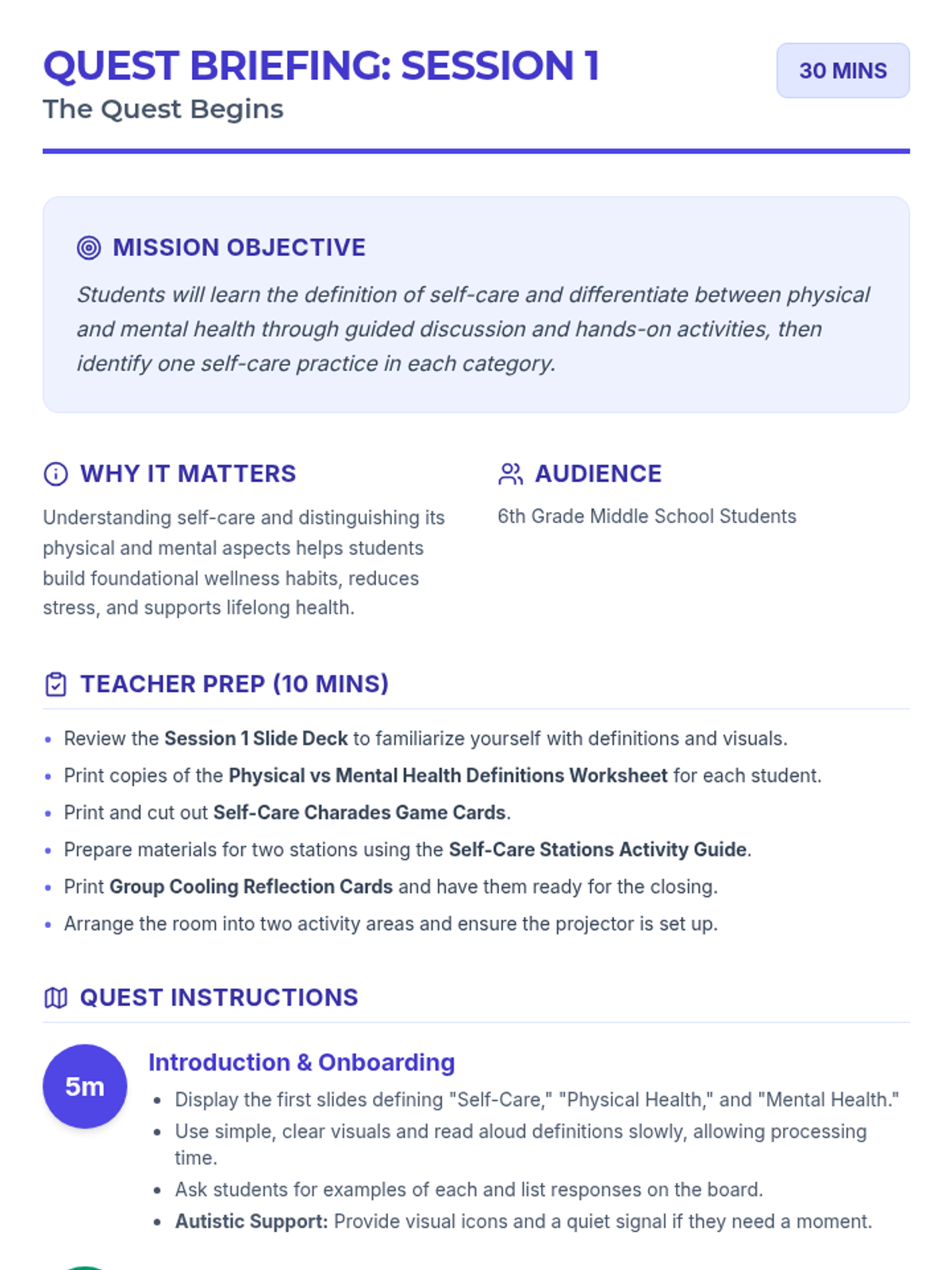 A 6-session comprehensive wellness journey for 6th graders to master physical and mental self-care through an interactive "quest" theme. Students build a personalized routine while engaging in hands-on activities, games, and reflections.