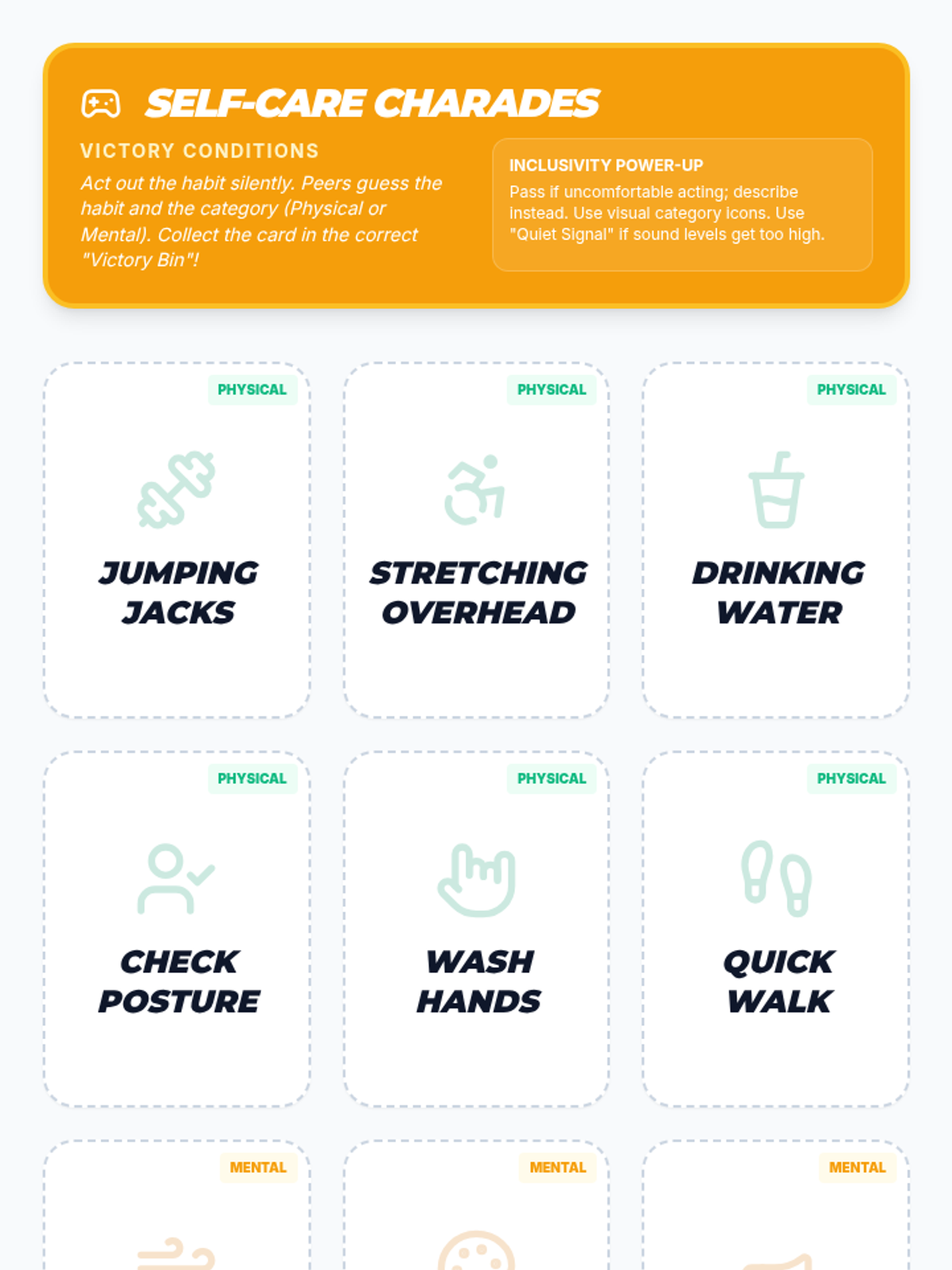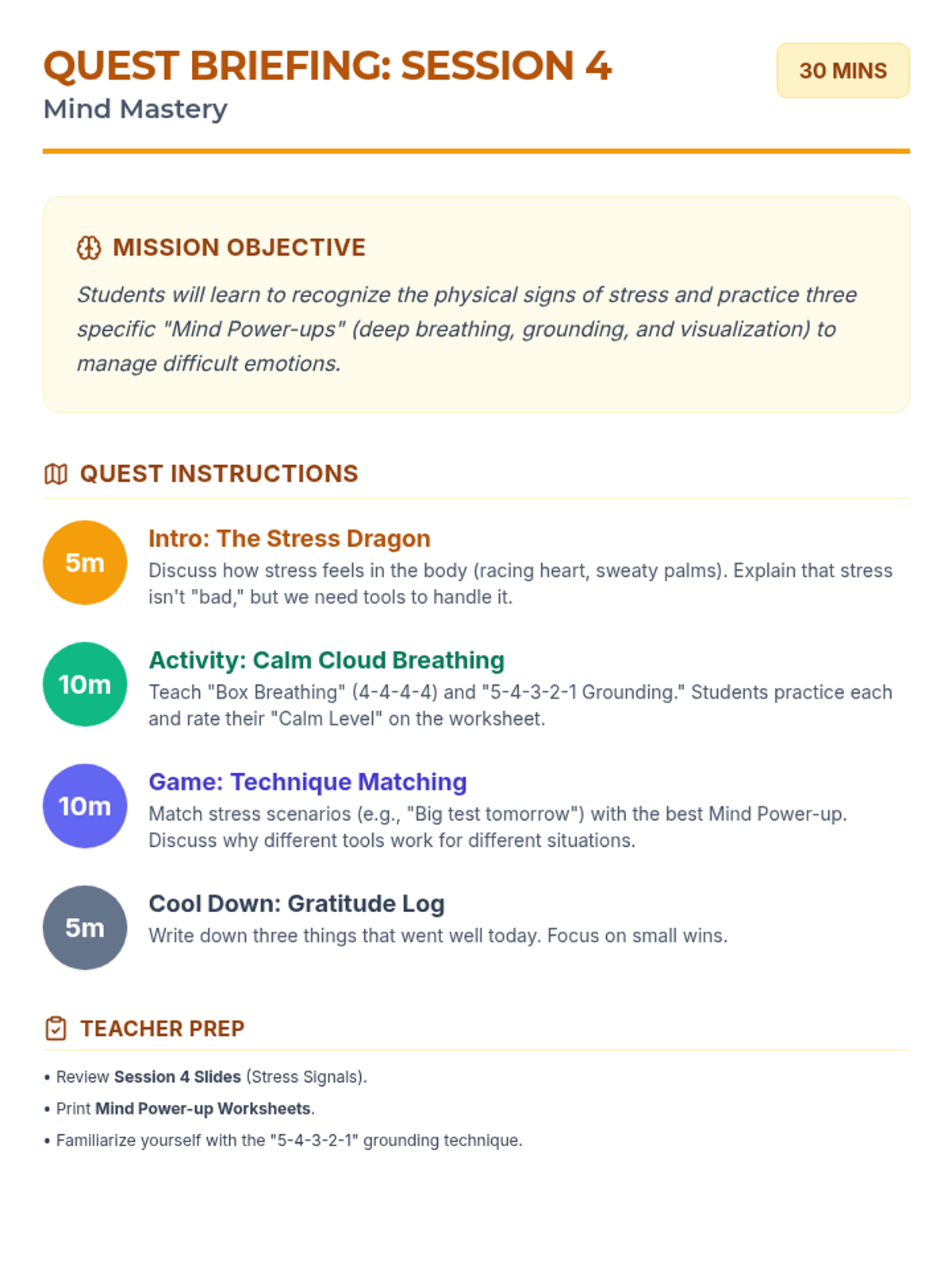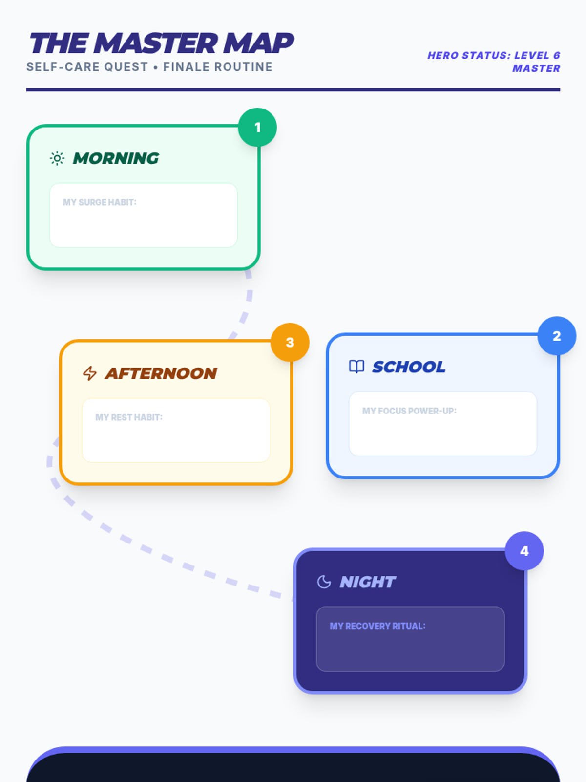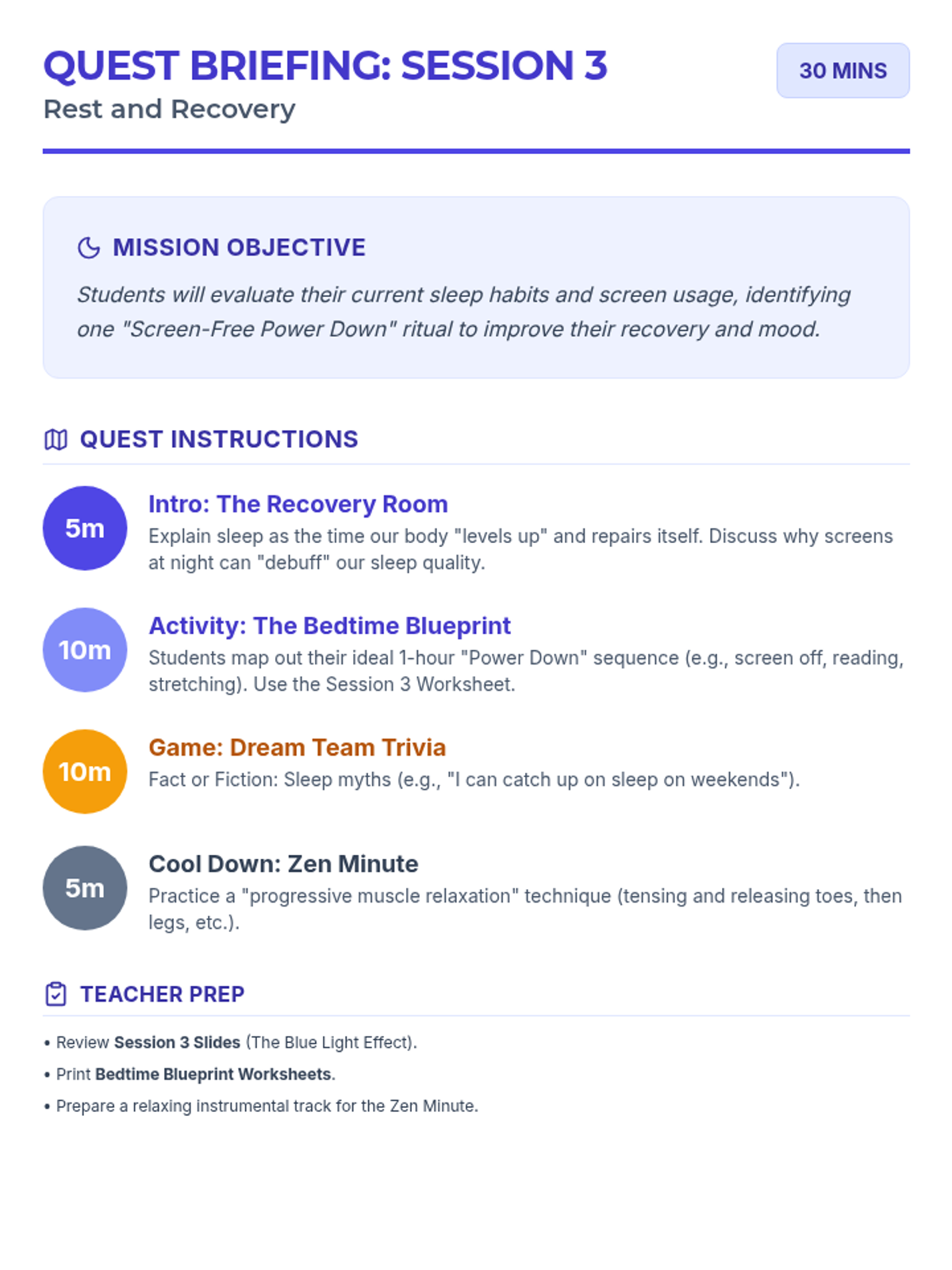 A 6-session comprehensive wellness journey for 6th graders to master physical and mental self-care through an interactive "quest" theme. Students build a personalized routine while engaging in hands-on activities, games, and reflections.