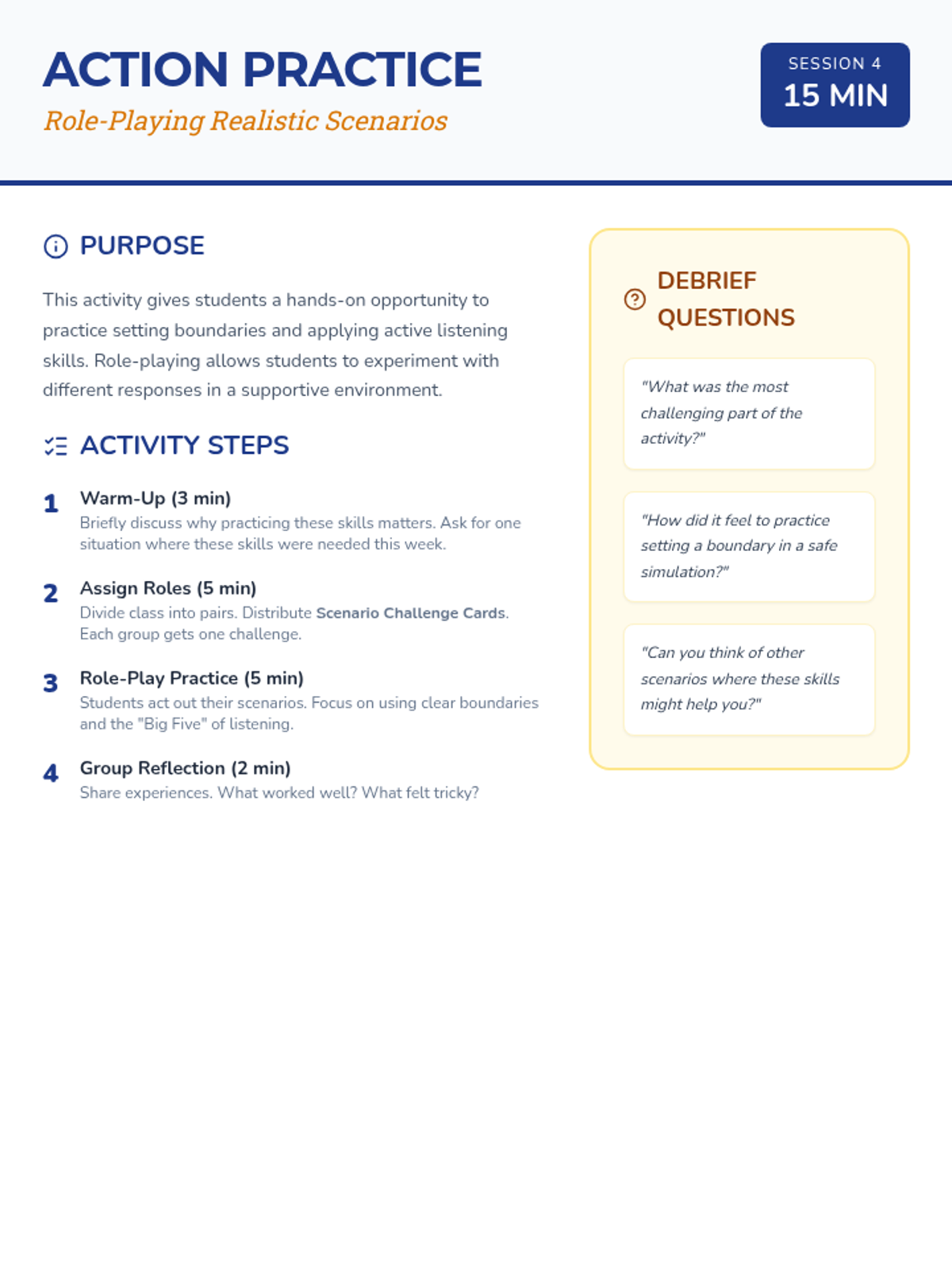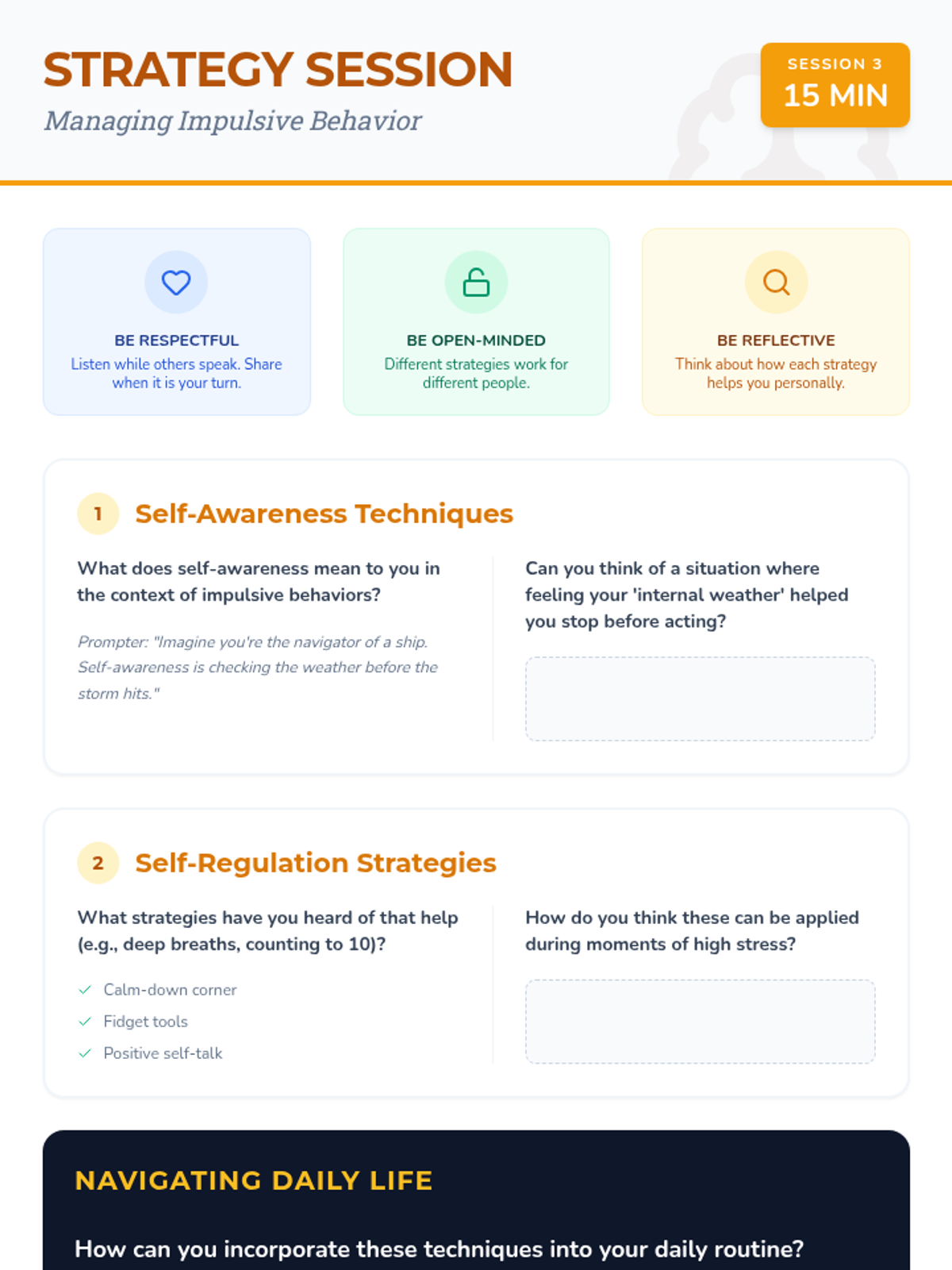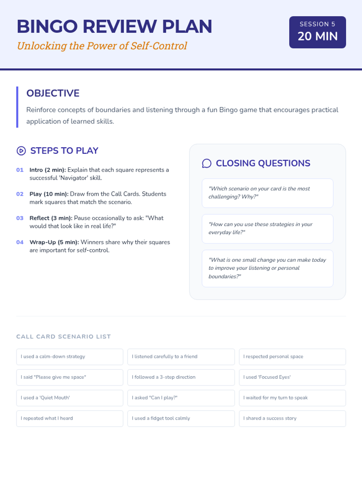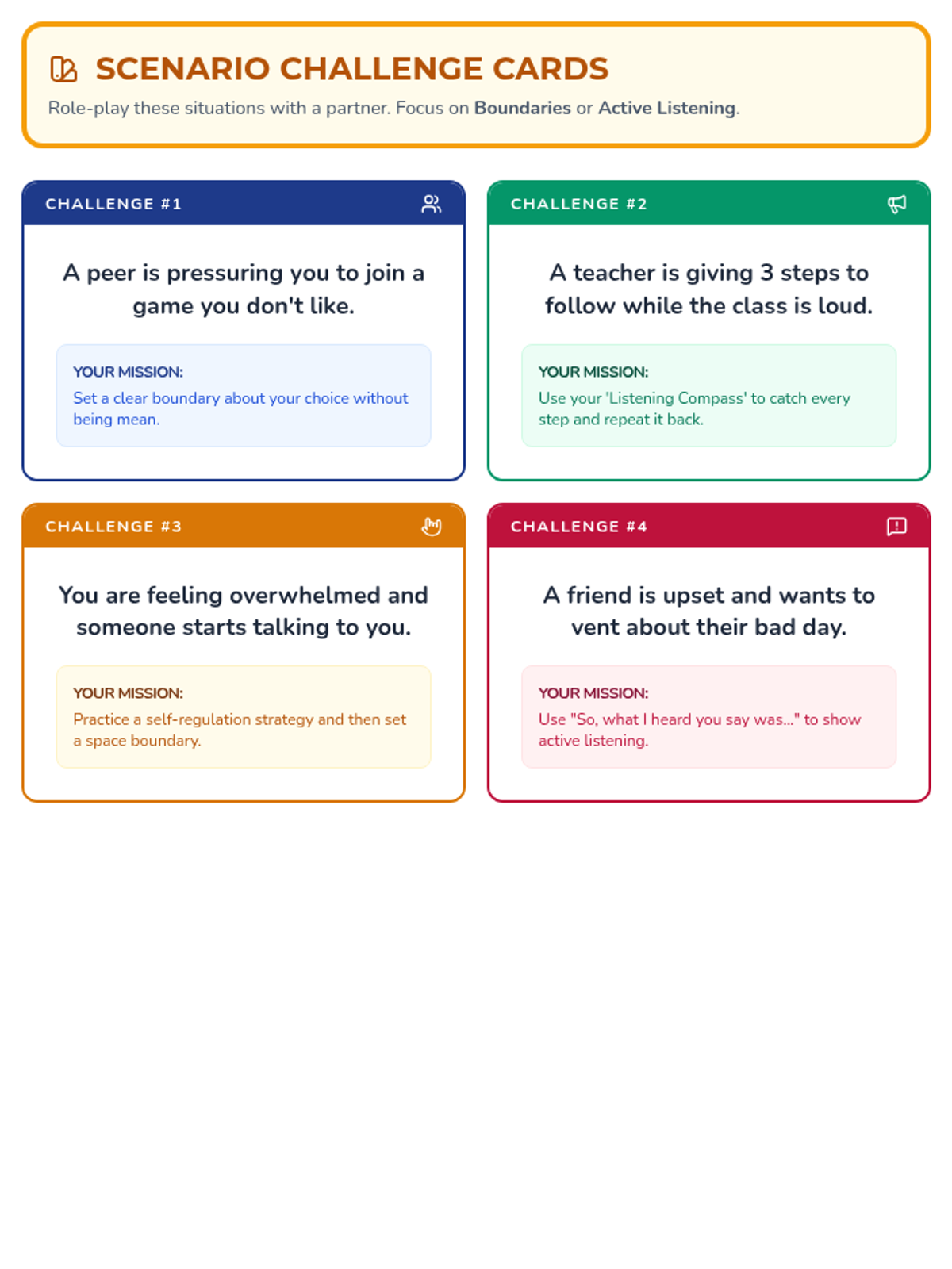 A five-part Tier 2 intervention series designed to help students master personal boundaries, active listening, and impulsive behavior management through a 'Navigators' theme. Students learn to steer their own actions and map out healthy social interactions.