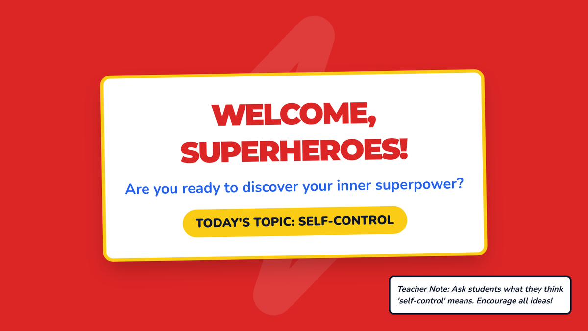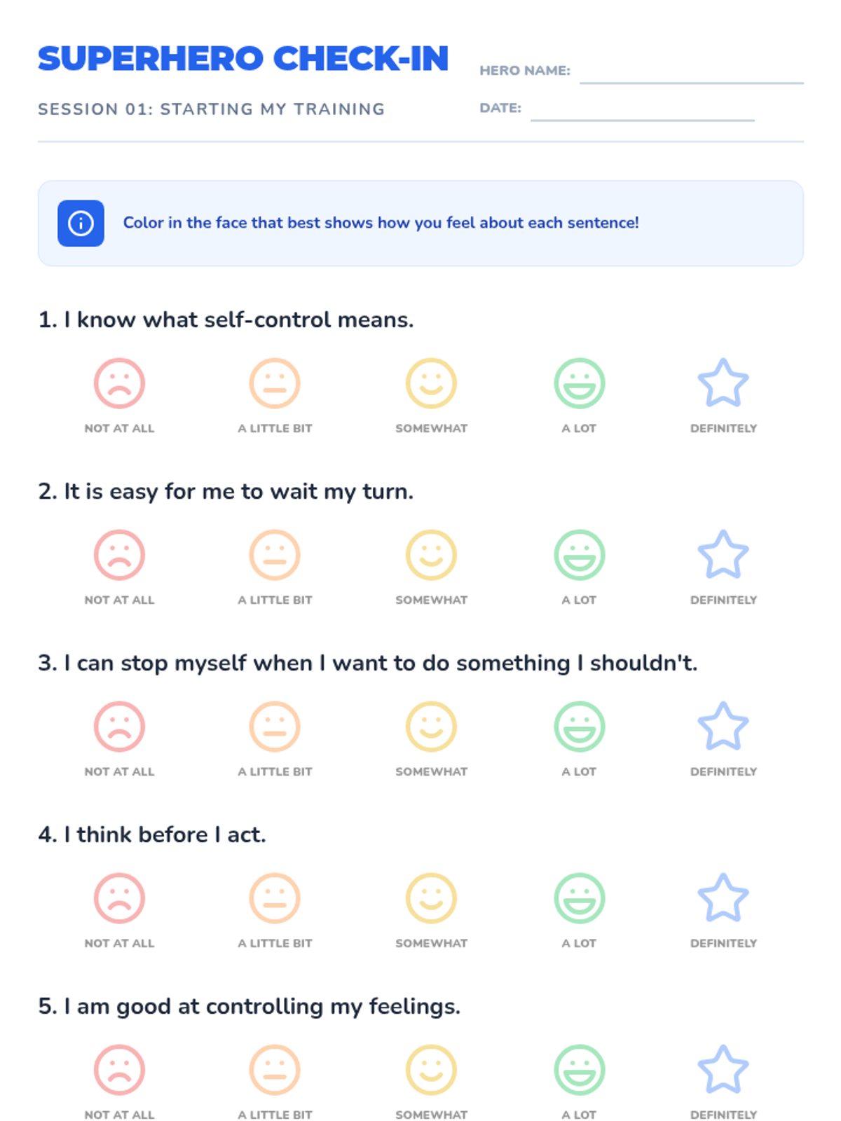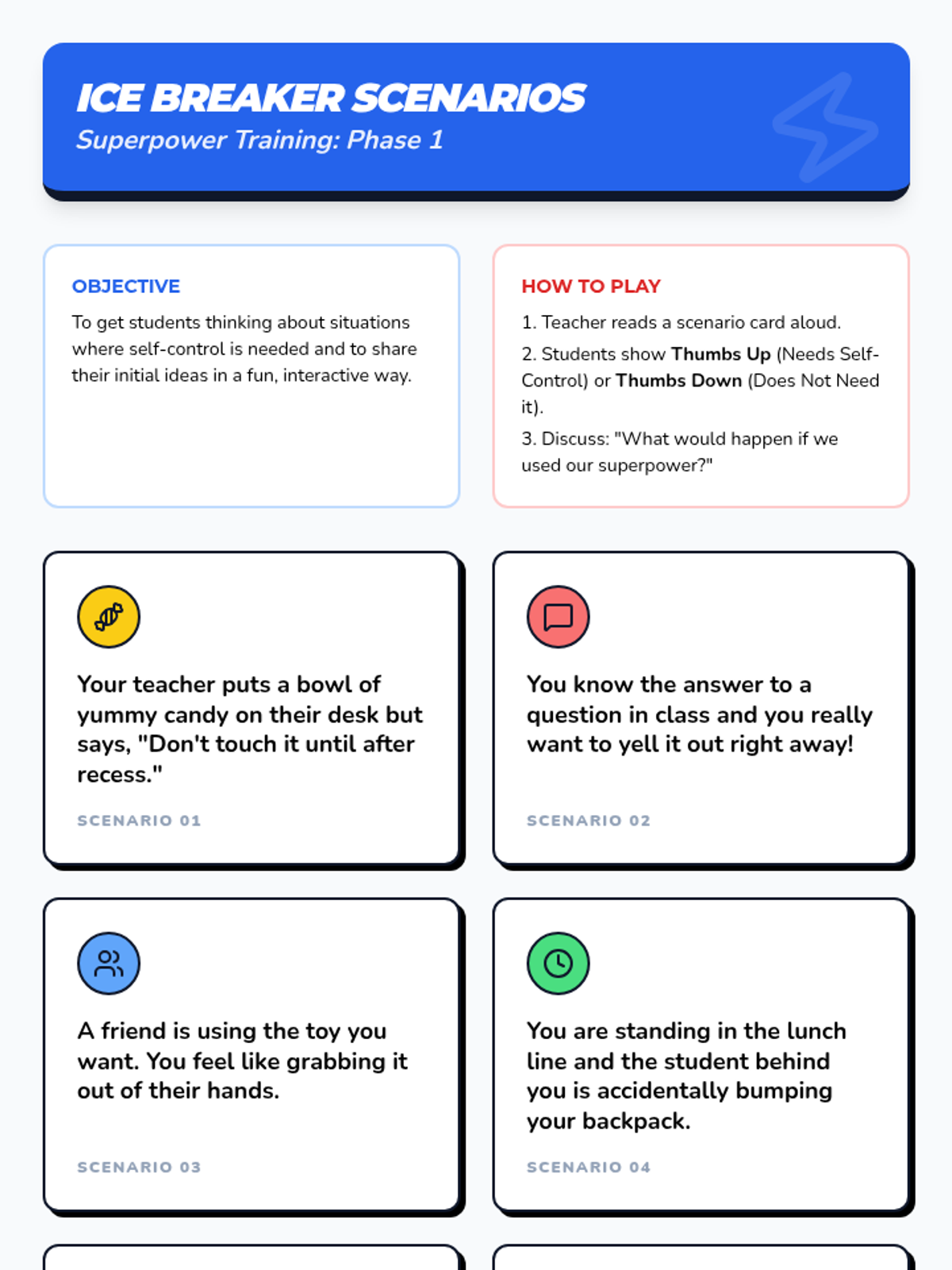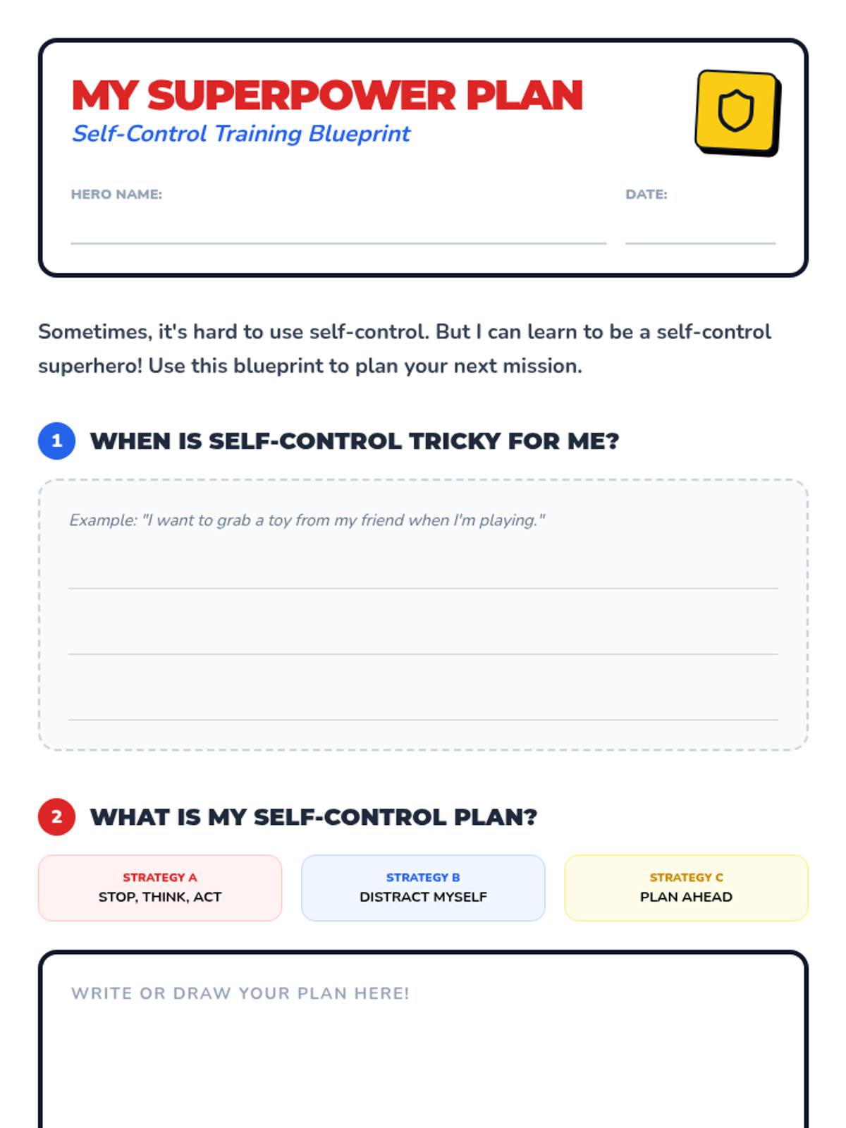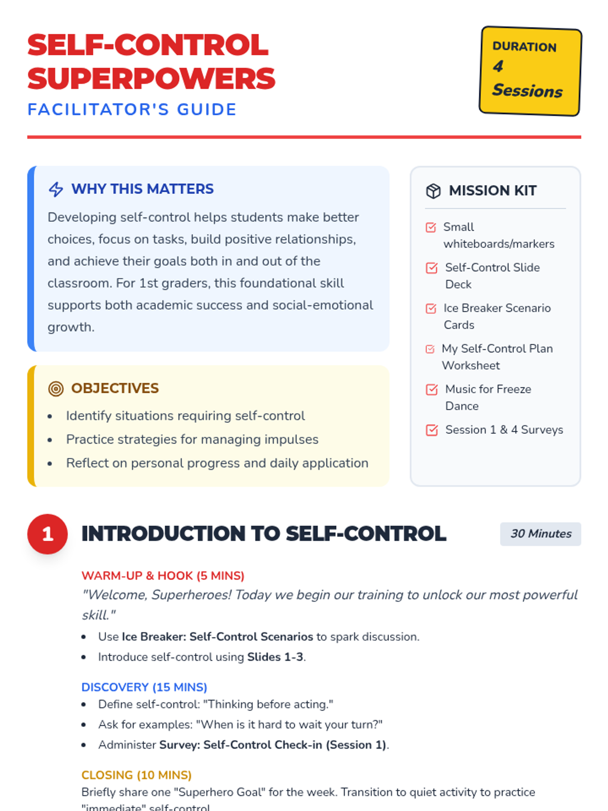 A 4-session social-emotional learning sequence for 1st-grade students to develop self-control skills using a superhero theme. Students learn to identify triggers, practice management strategies like 'Stop, Think, Act', and create personal action plans.