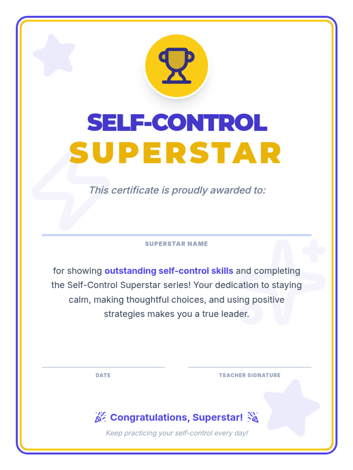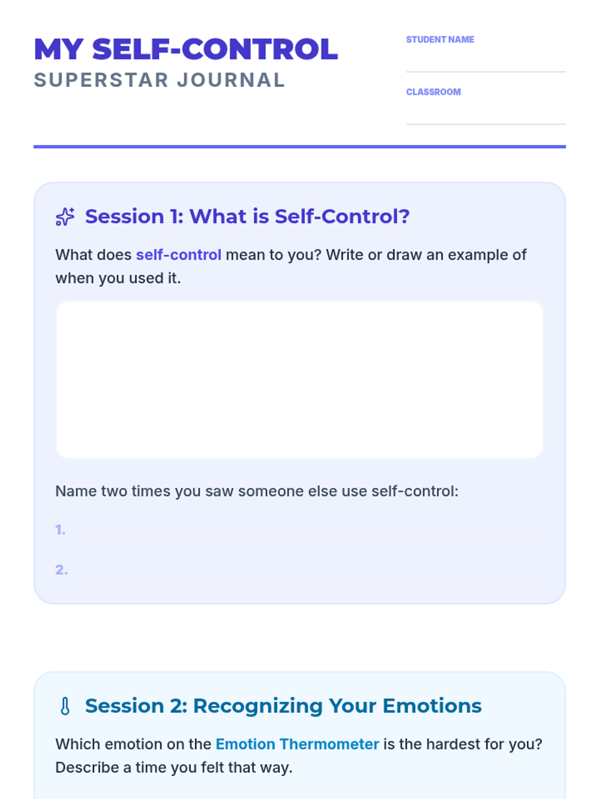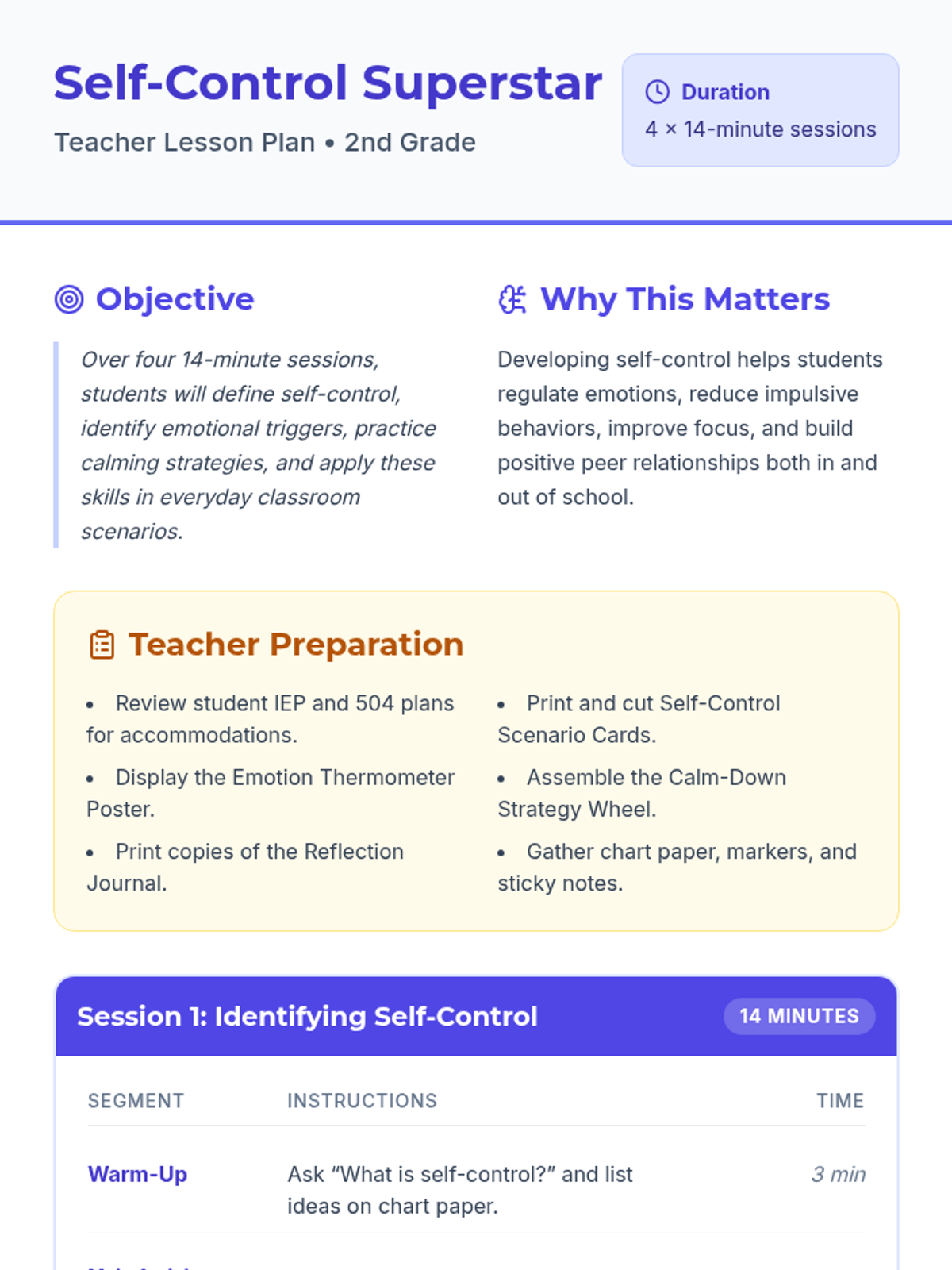 A 4-session series for 2nd graders to master self-control, emotional regulation, and calming strategies through interactive activities and reflection.