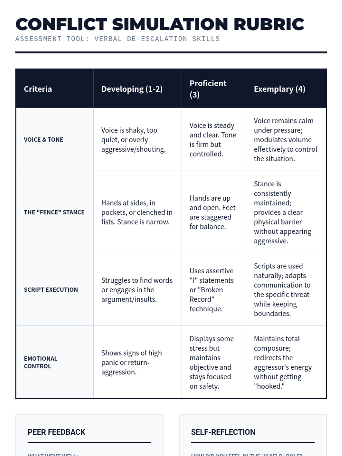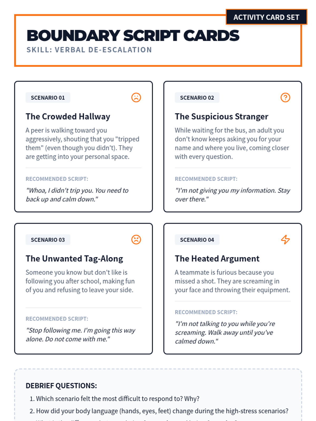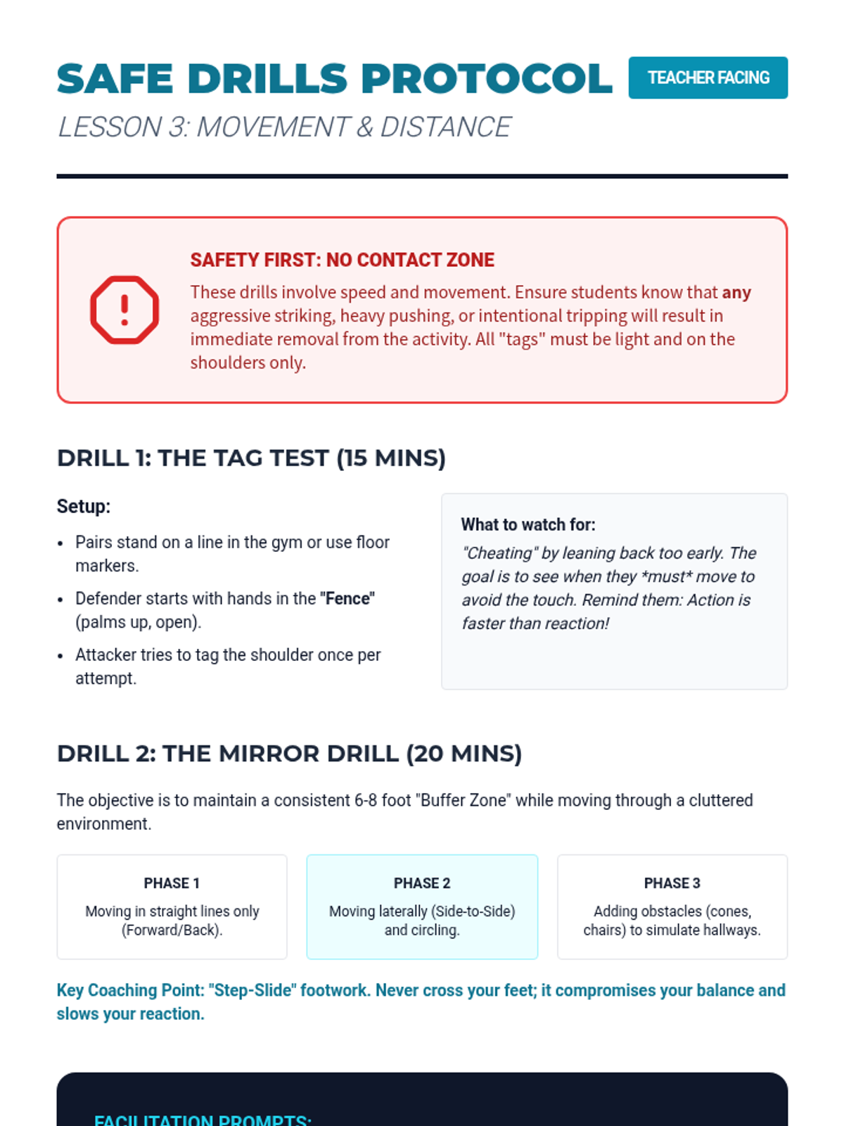 A comprehensive 8th-grade physical education sequence focusing on non-physical self-defense strategies, including situational awareness, verbal de-escalation, distance management, and injury prevention through safe falling.