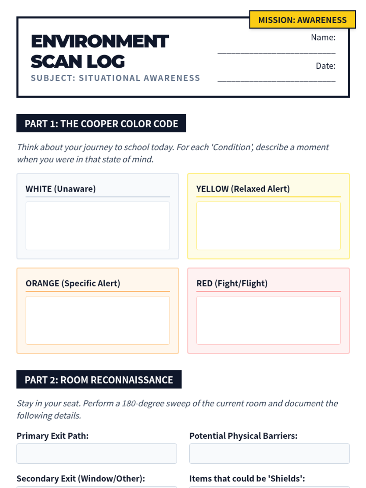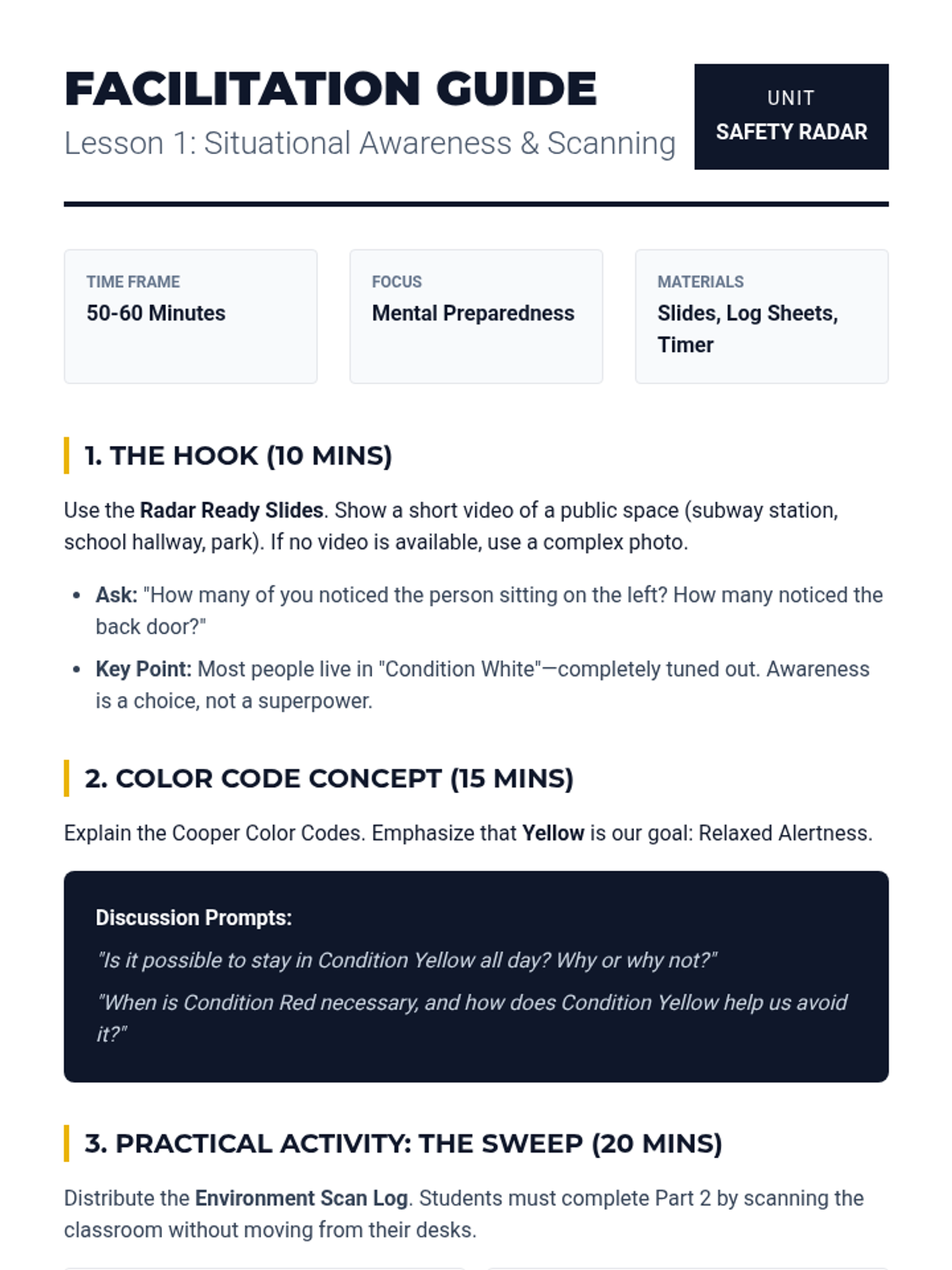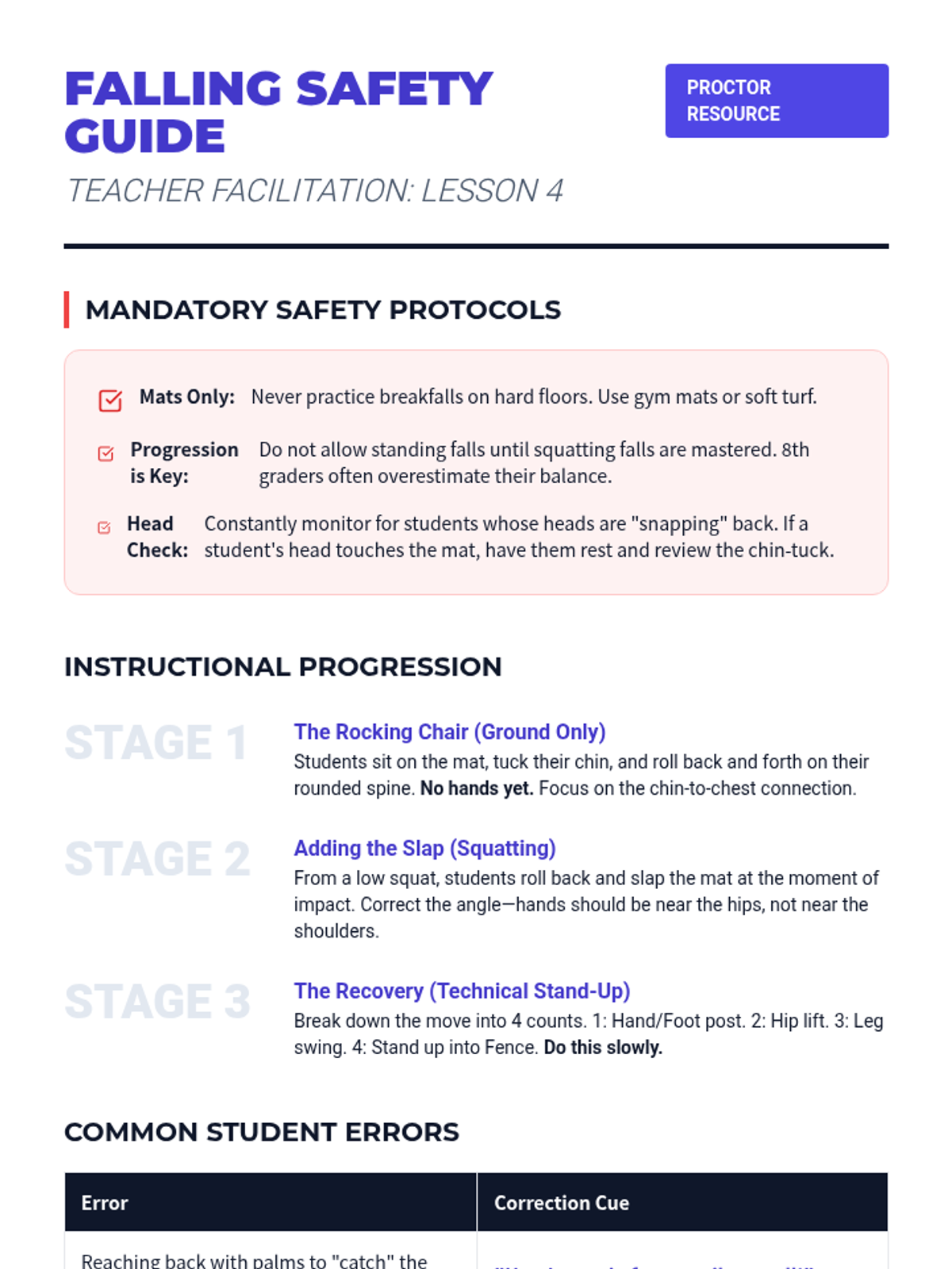 A comprehensive 8th-grade physical education sequence focusing on non-physical self-defense strategies, including situational awareness, verbal de-escalation, distance management, and injury prevention through safe falling.
