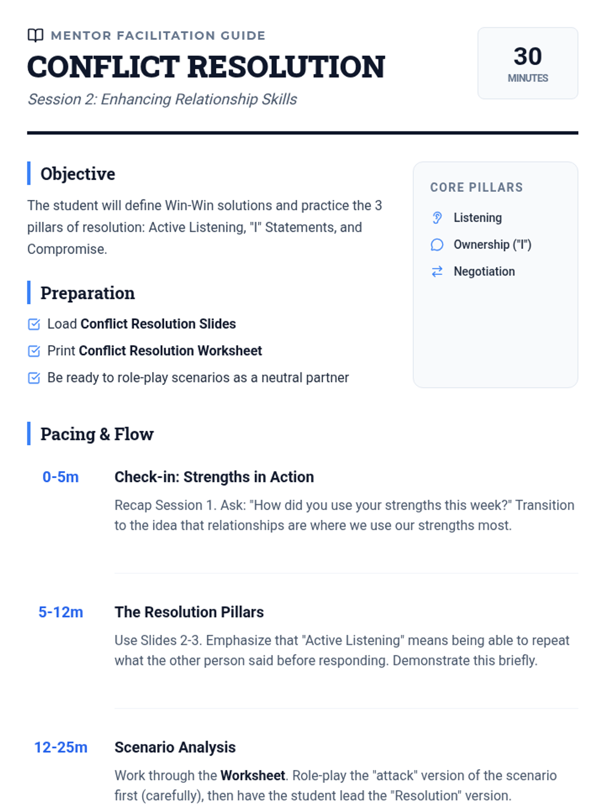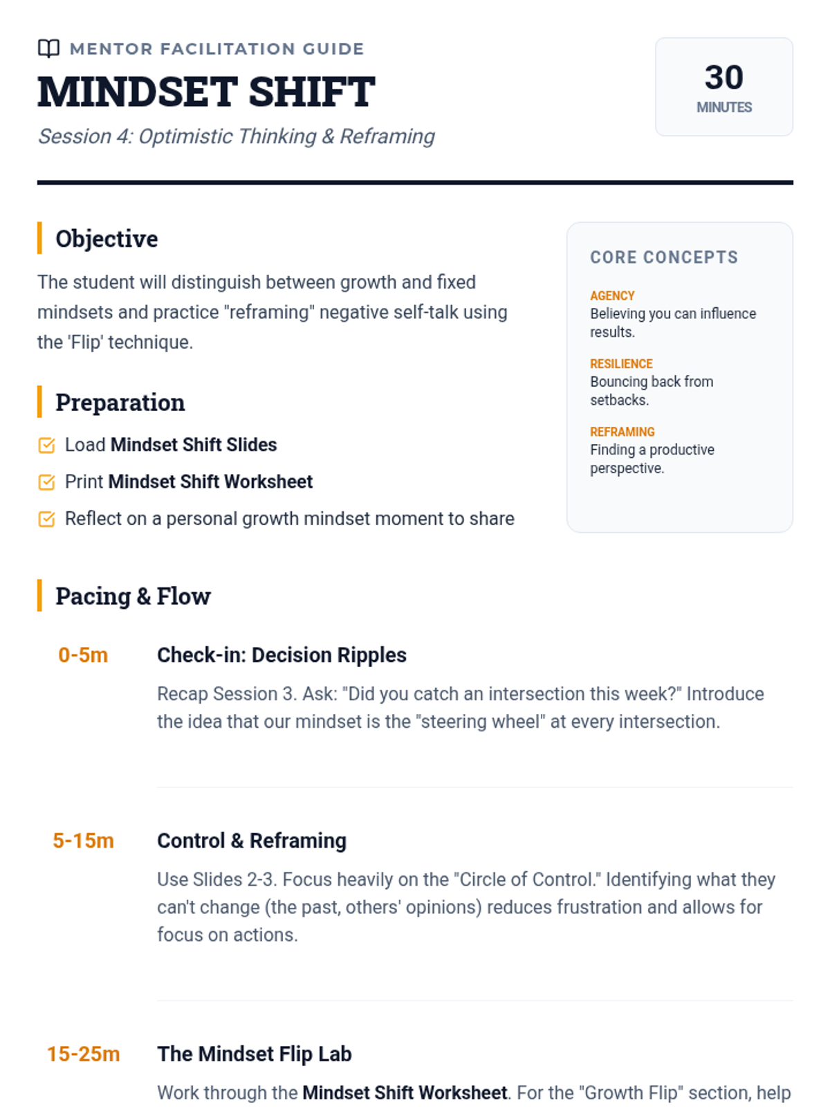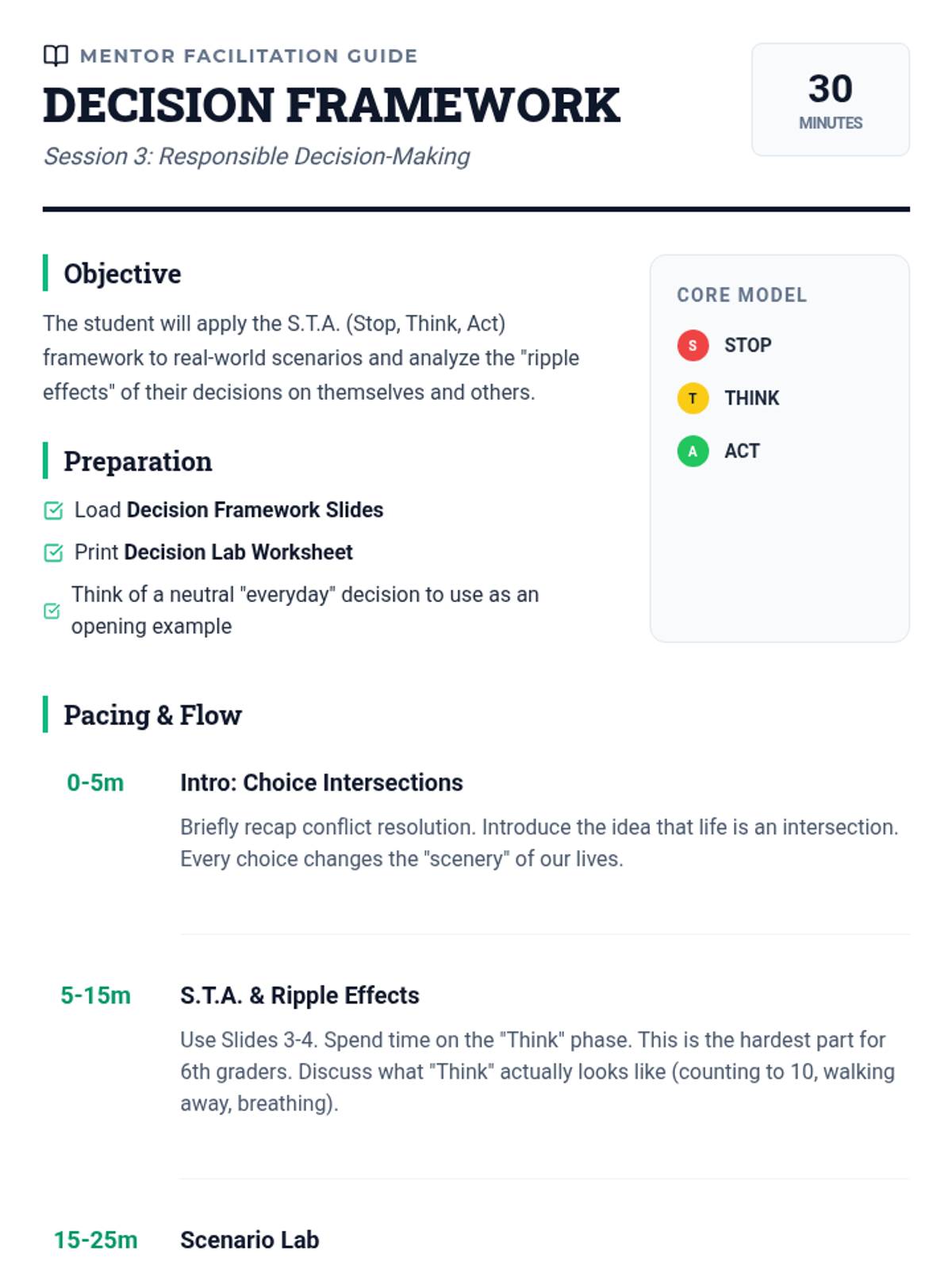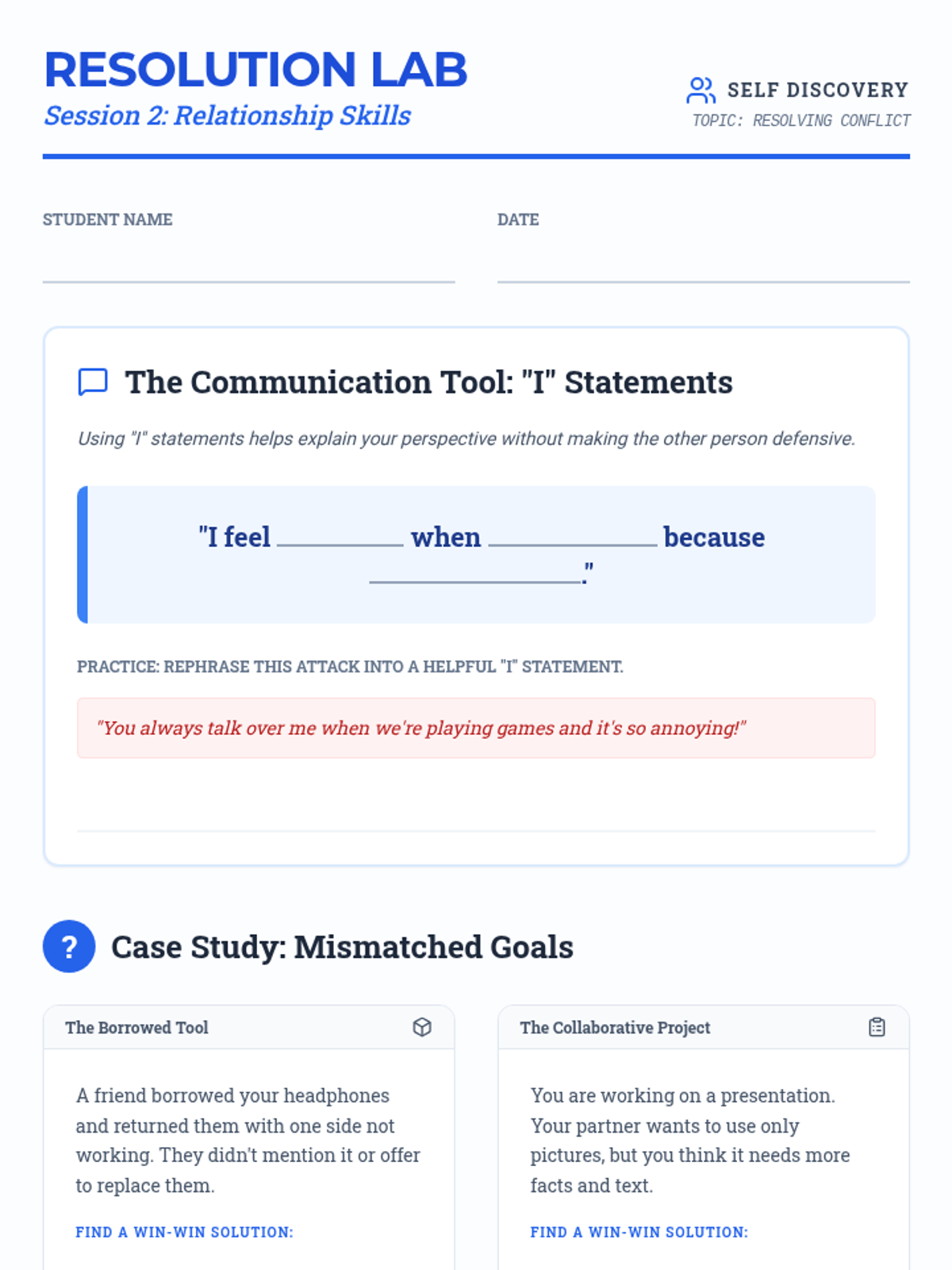 A five-session social-emotional learning sequence for 6th-grade students, focusing on self-awareness, conflict resolution, decision-making, and optimism through a modern 'Skills Lab' theme.