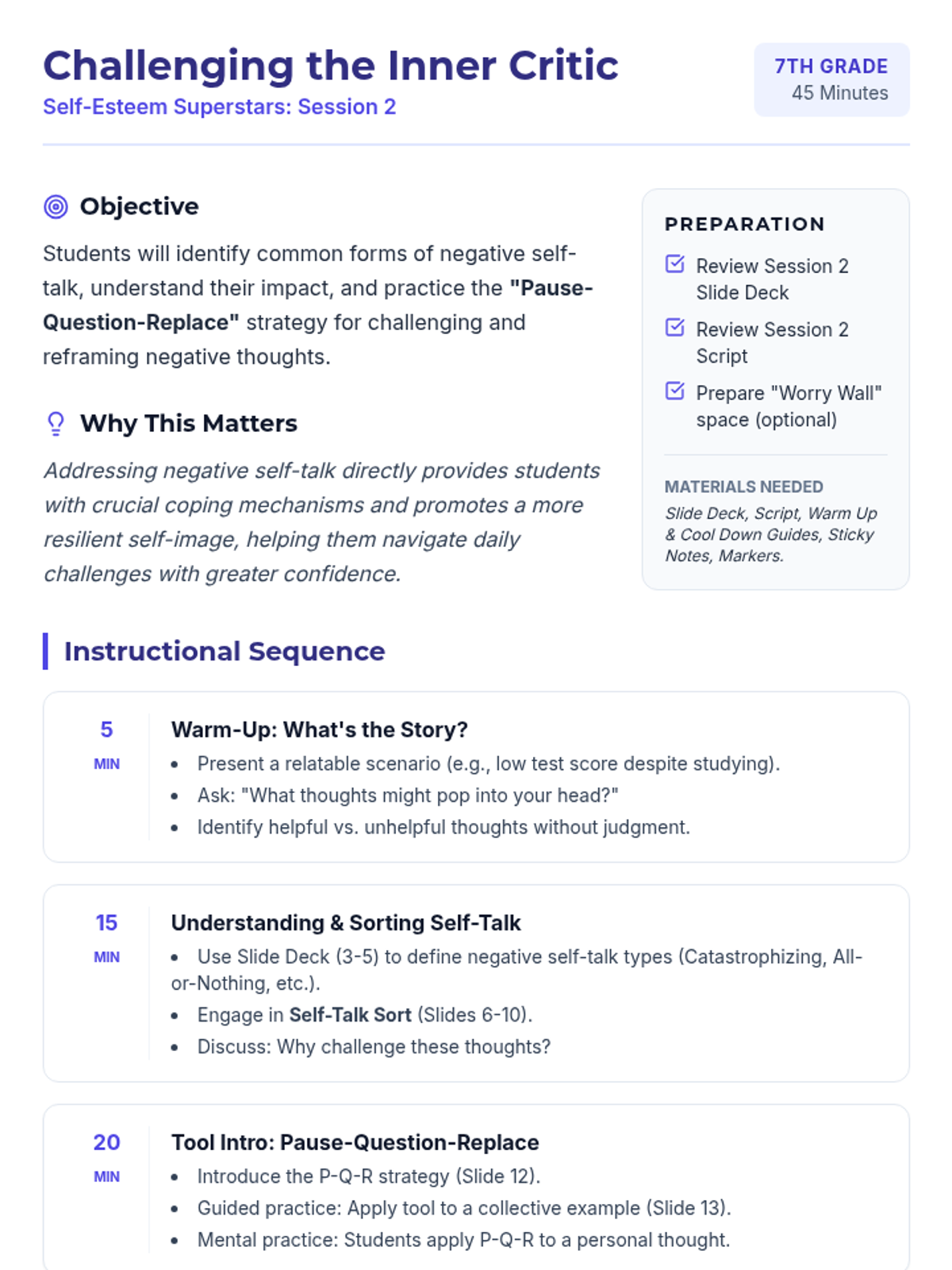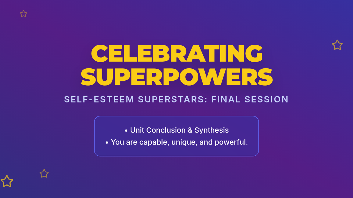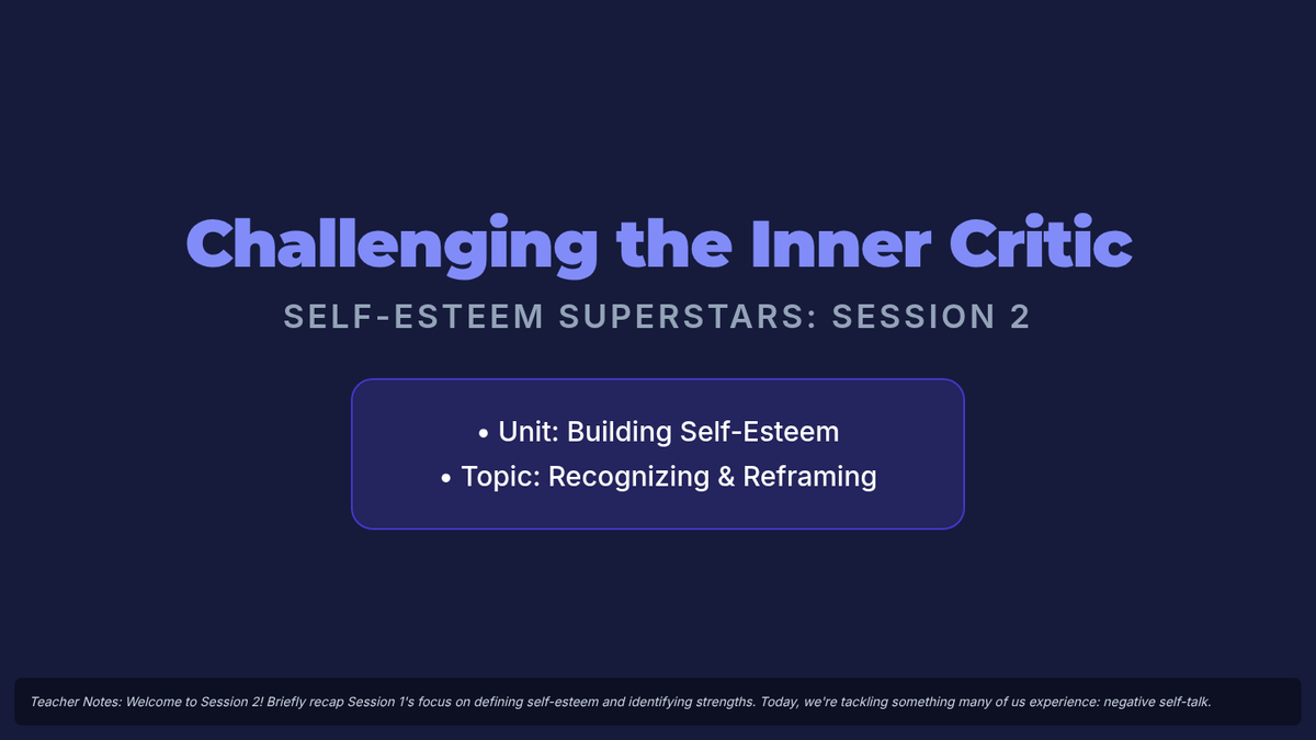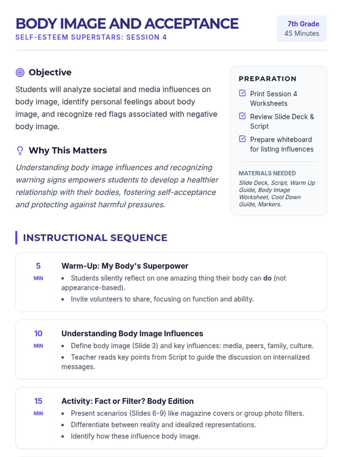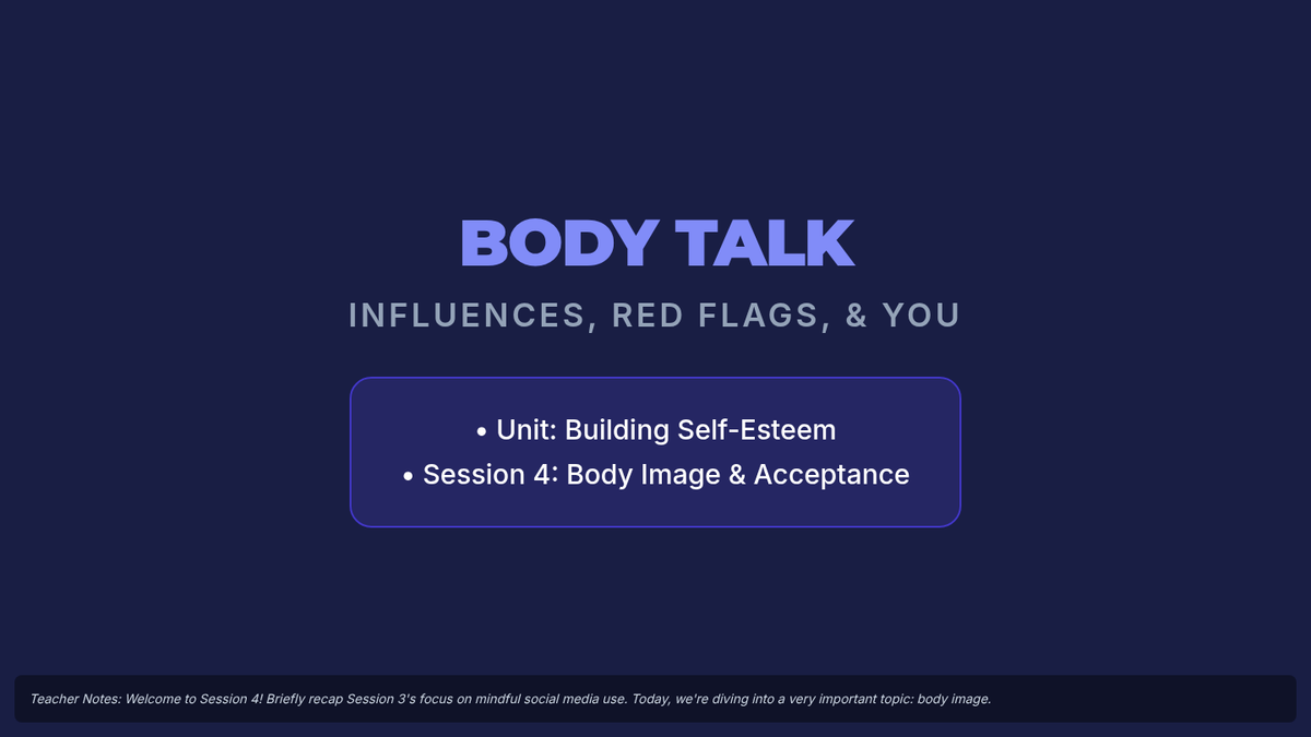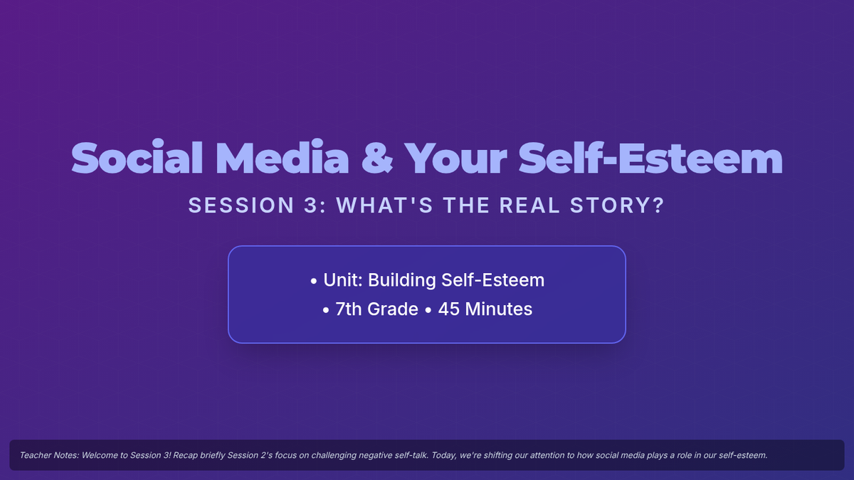 A 5-session unit for 7th graders focused on building self-esteem, challenging negative self-talk, and navigating social media and body image pressures.