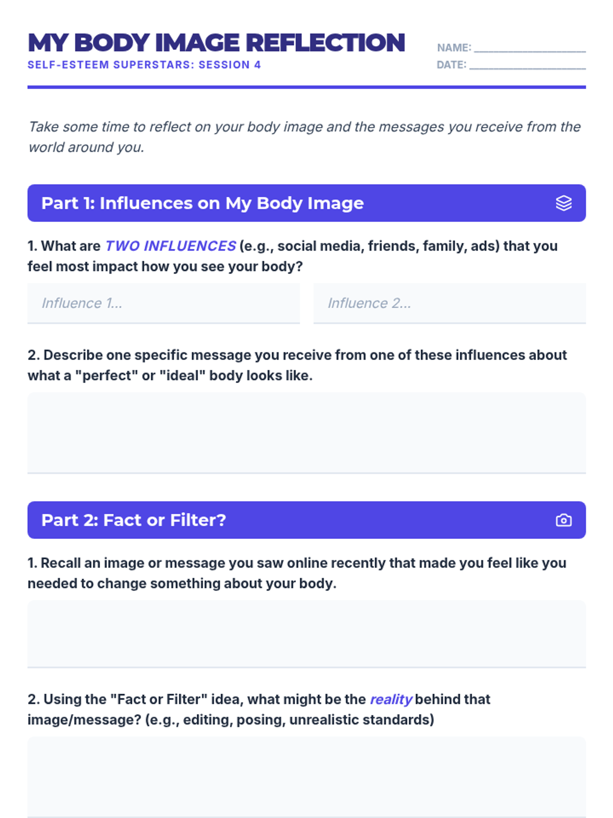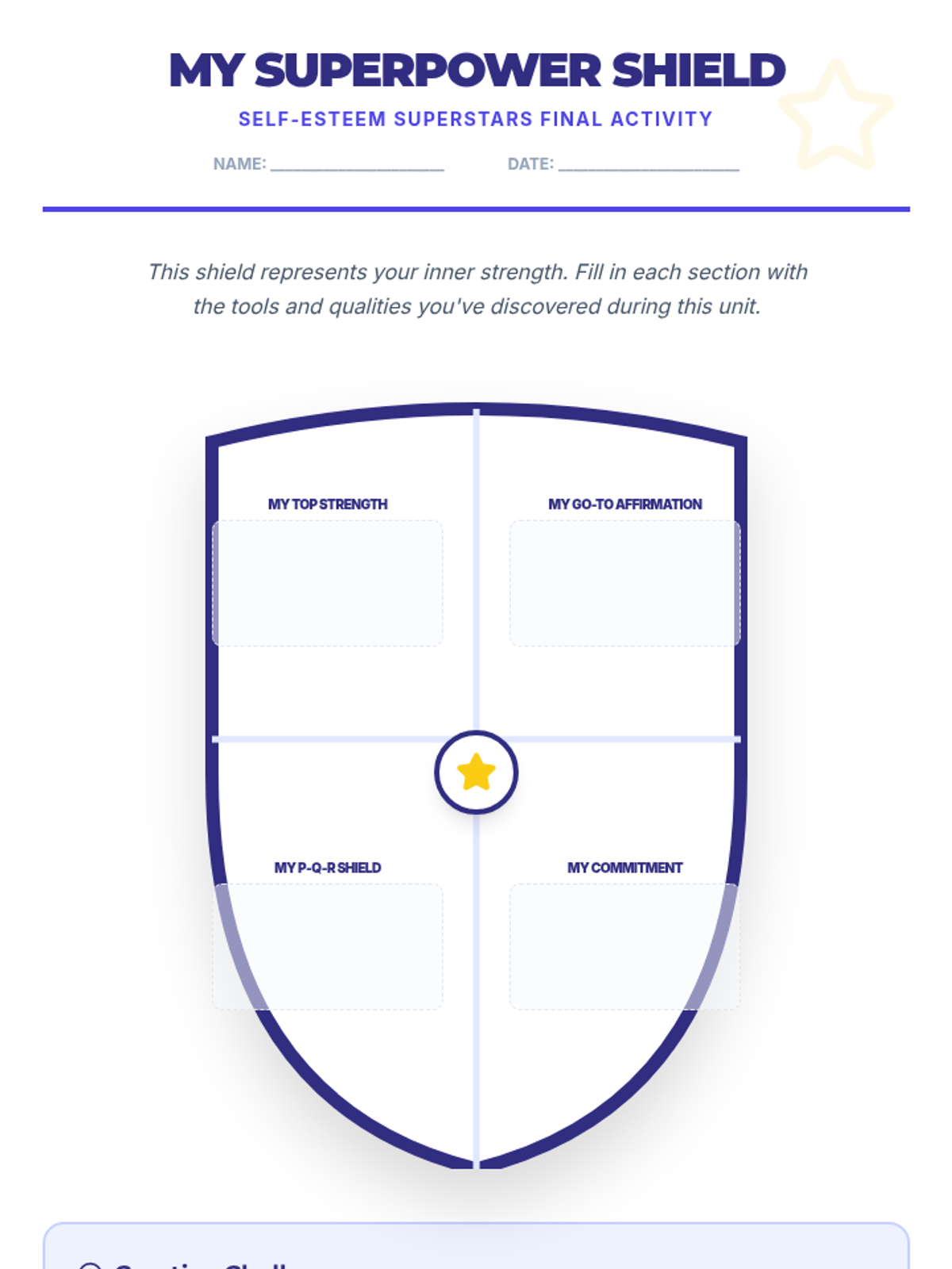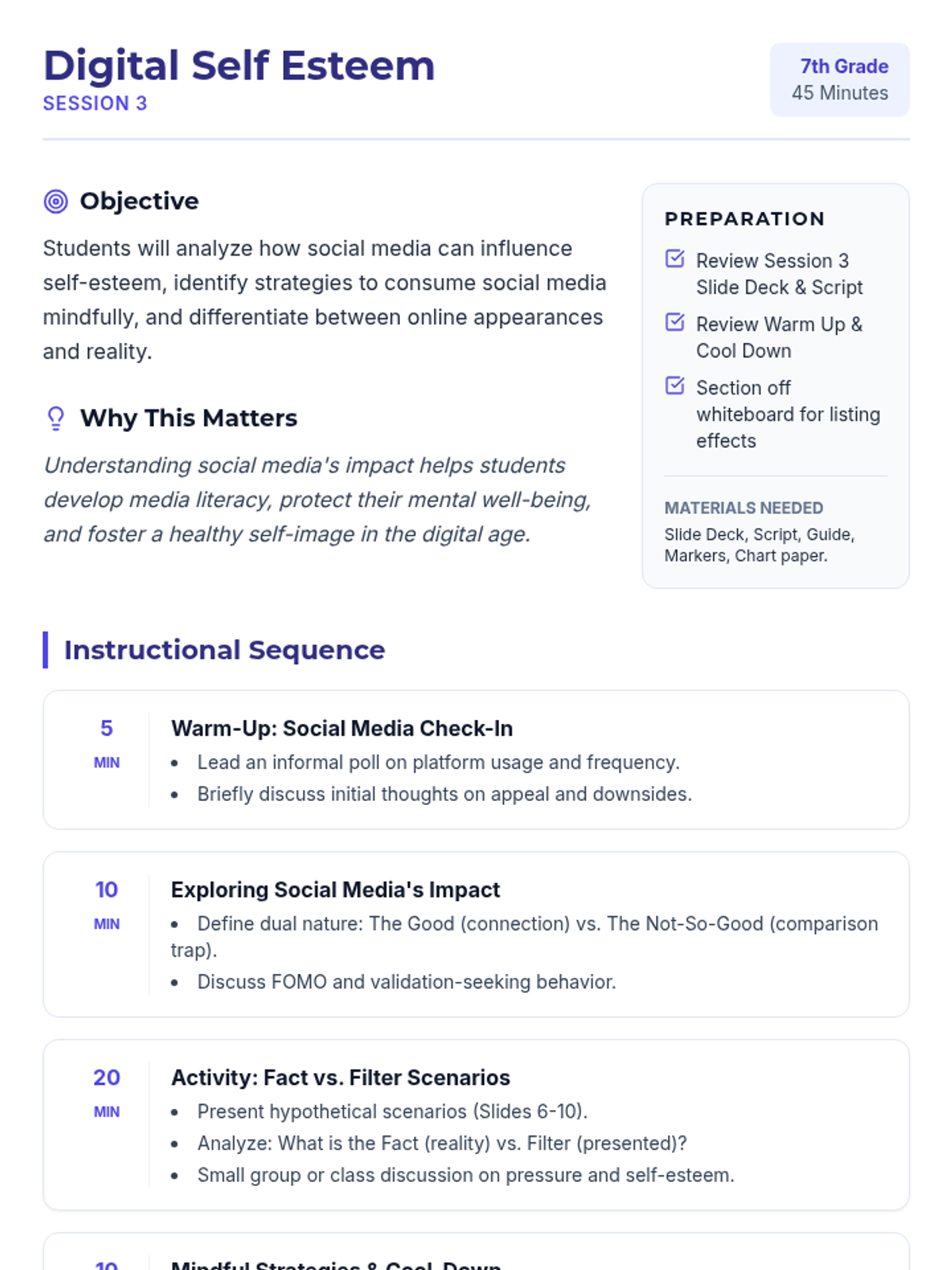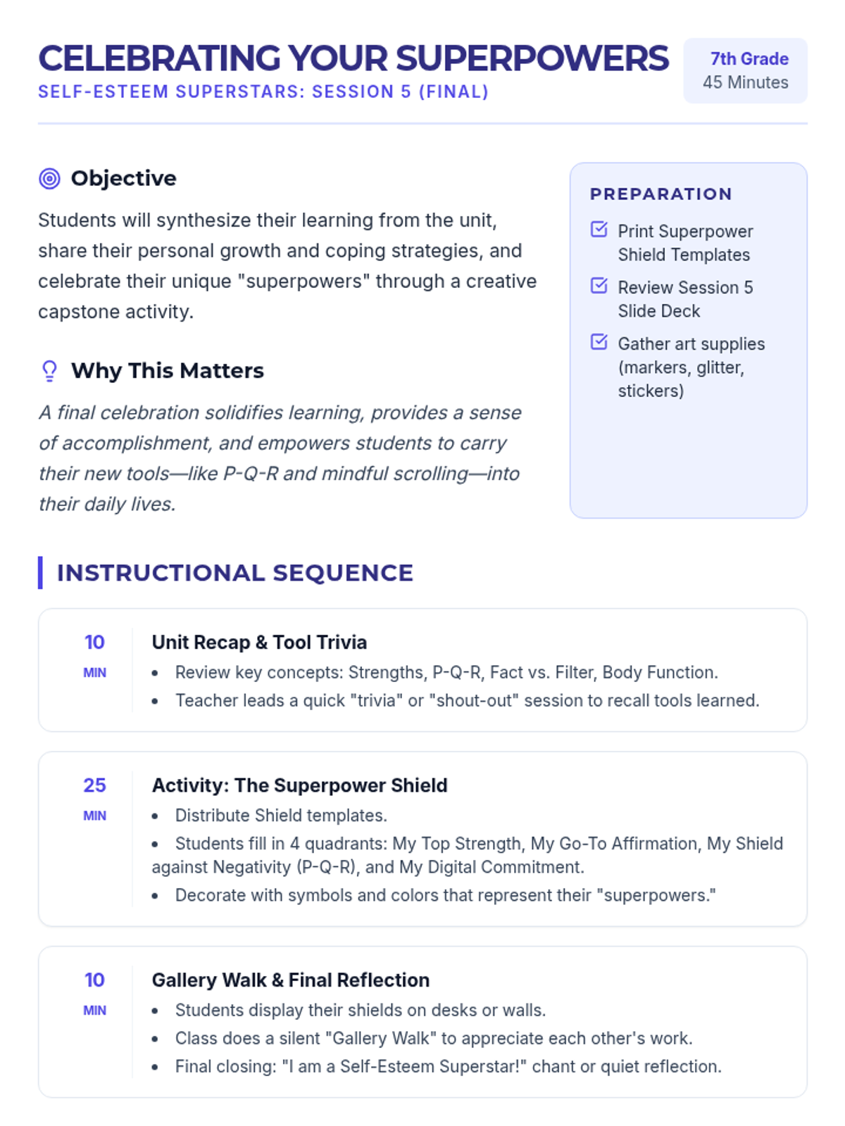 A 5-session unit for 7th graders focused on building self-esteem, challenging negative self-talk, and navigating social media and body image pressures.