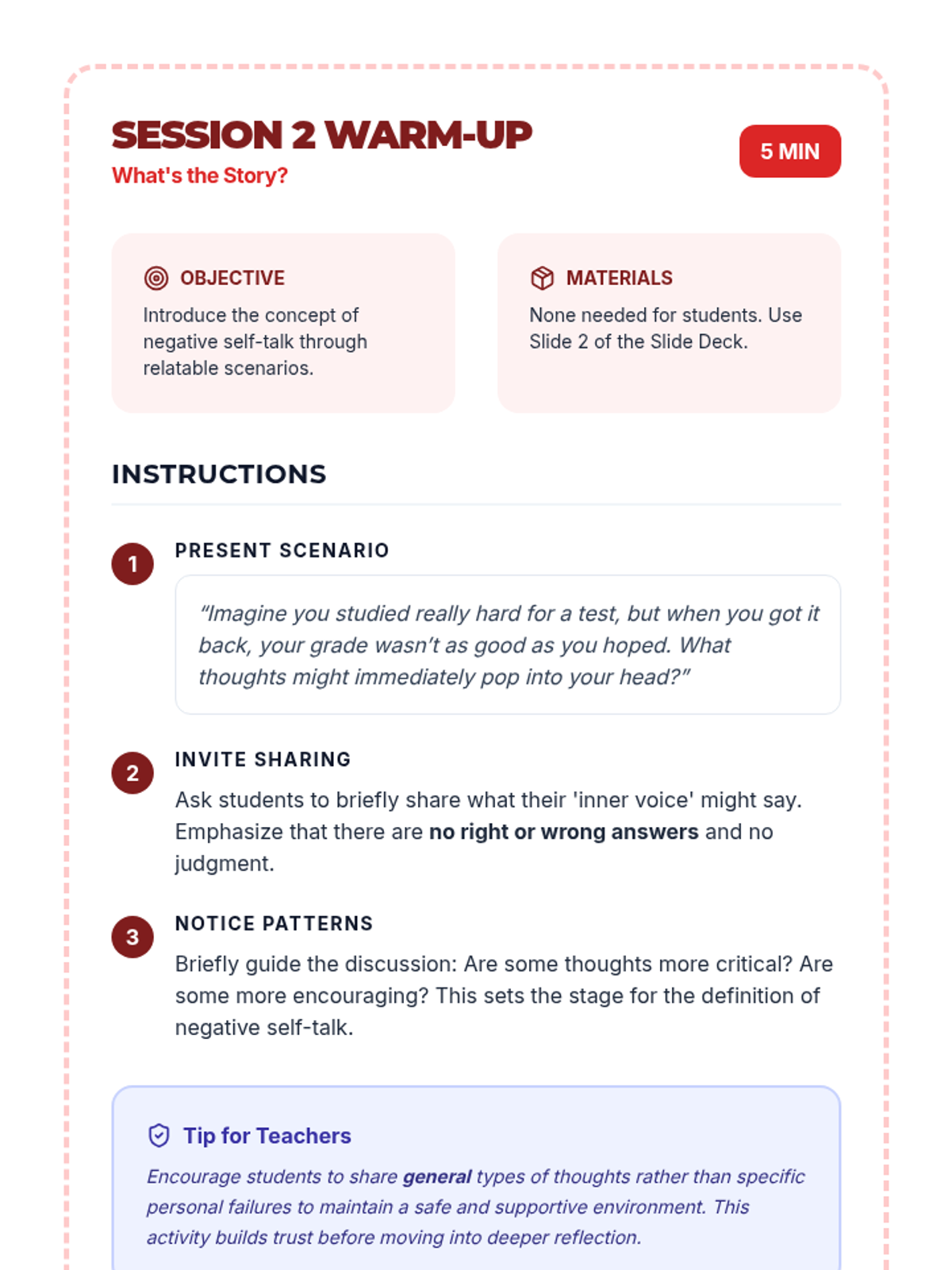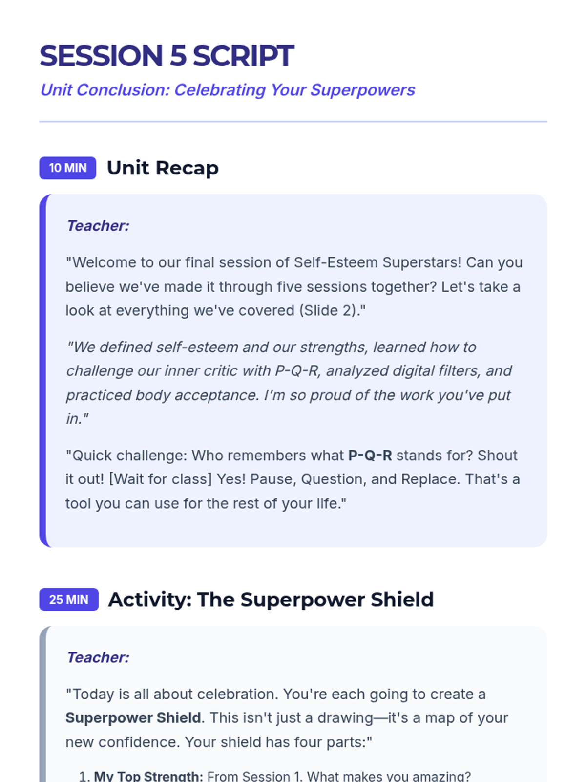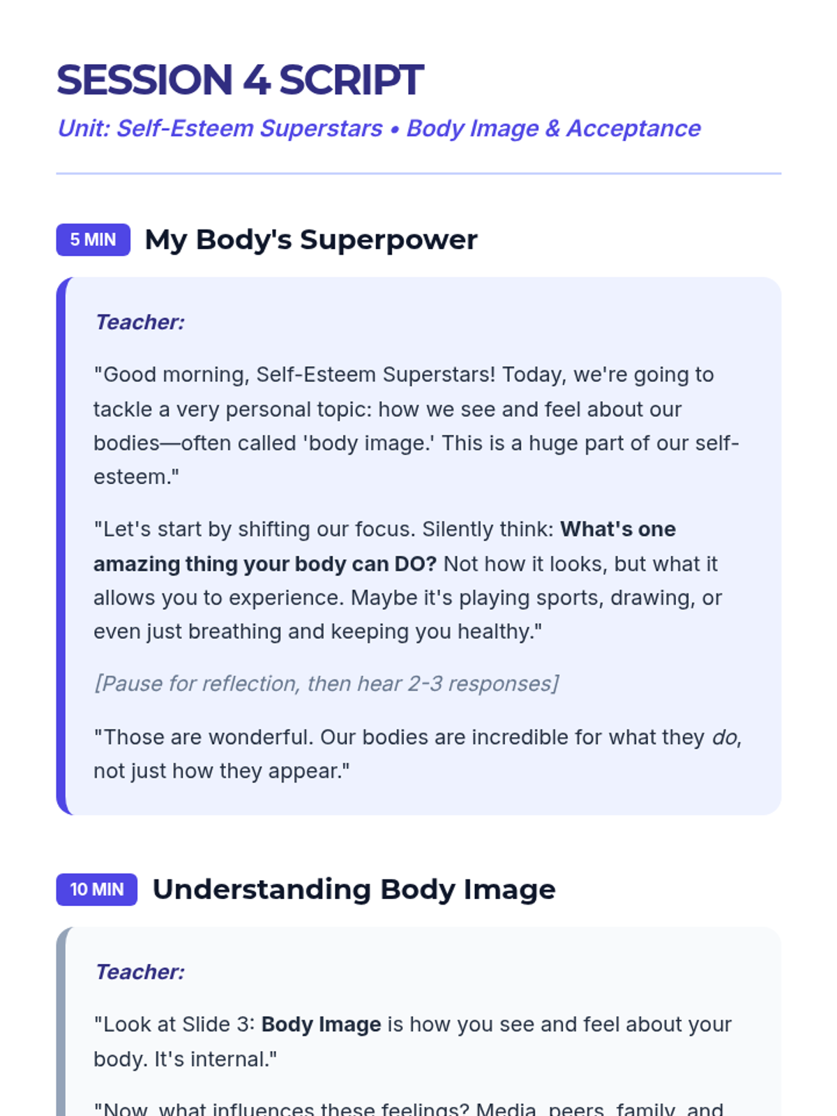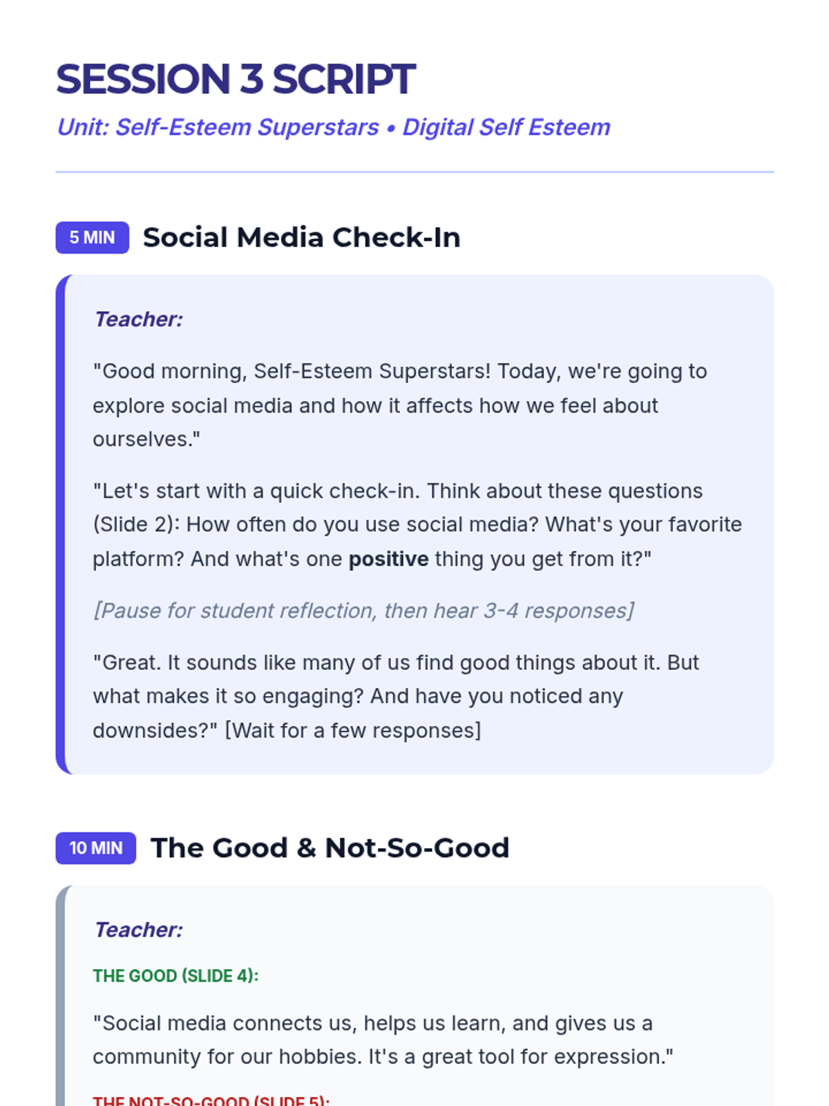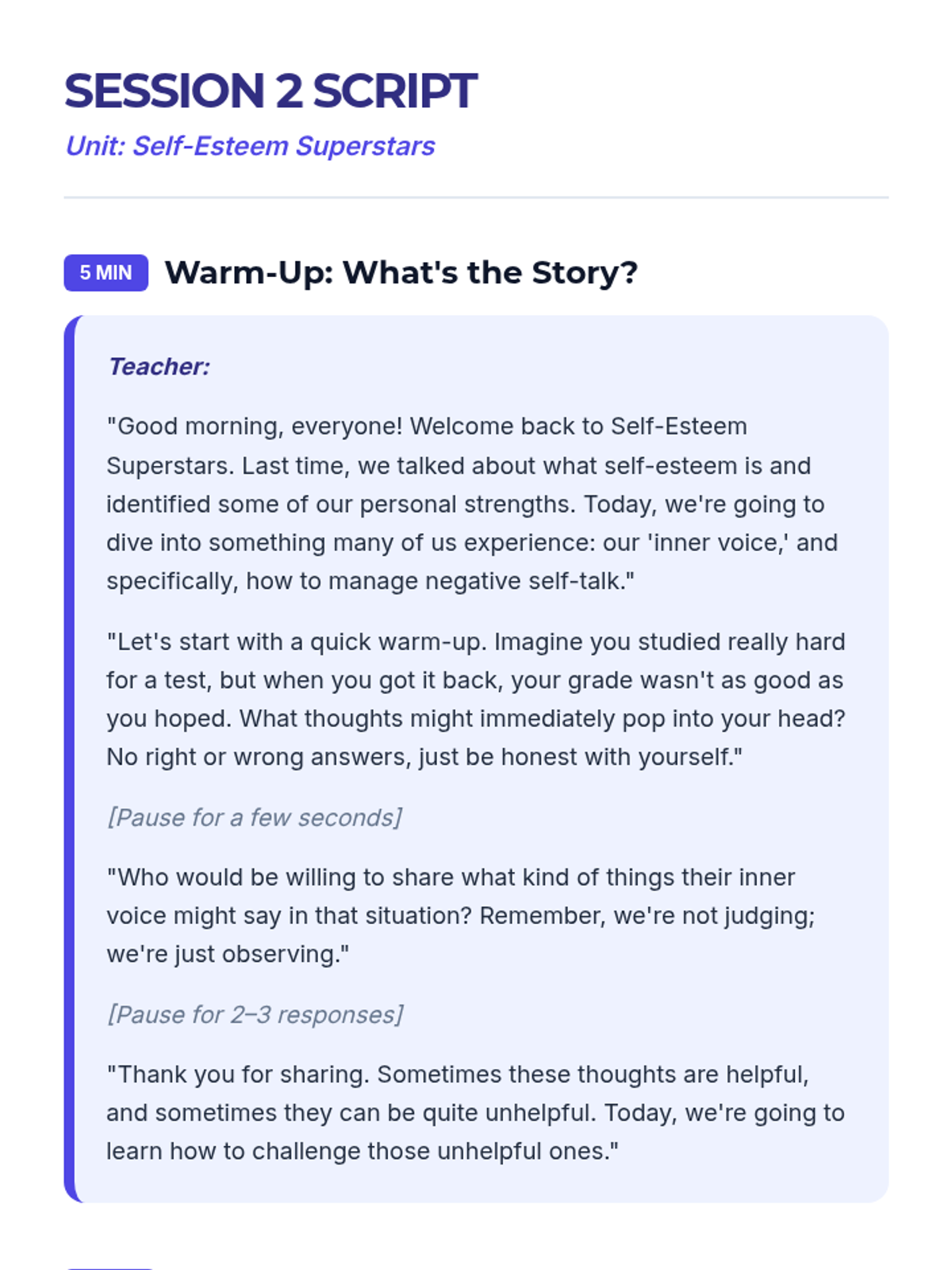 A 5-session unit for 7th graders focused on building self-esteem, challenging negative self-talk, and navigating social media and body image pressures.