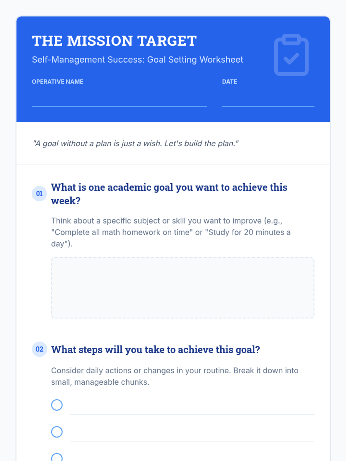 A series of three interactive counseling sessions for middle and high school students, focusing on self-discovery, emotional regulation, and future planning. Using a 'Blueprint' aesthetic, students engage in hands-on activities to map out their internal identities, manage external stressors, and construct actionable goals.