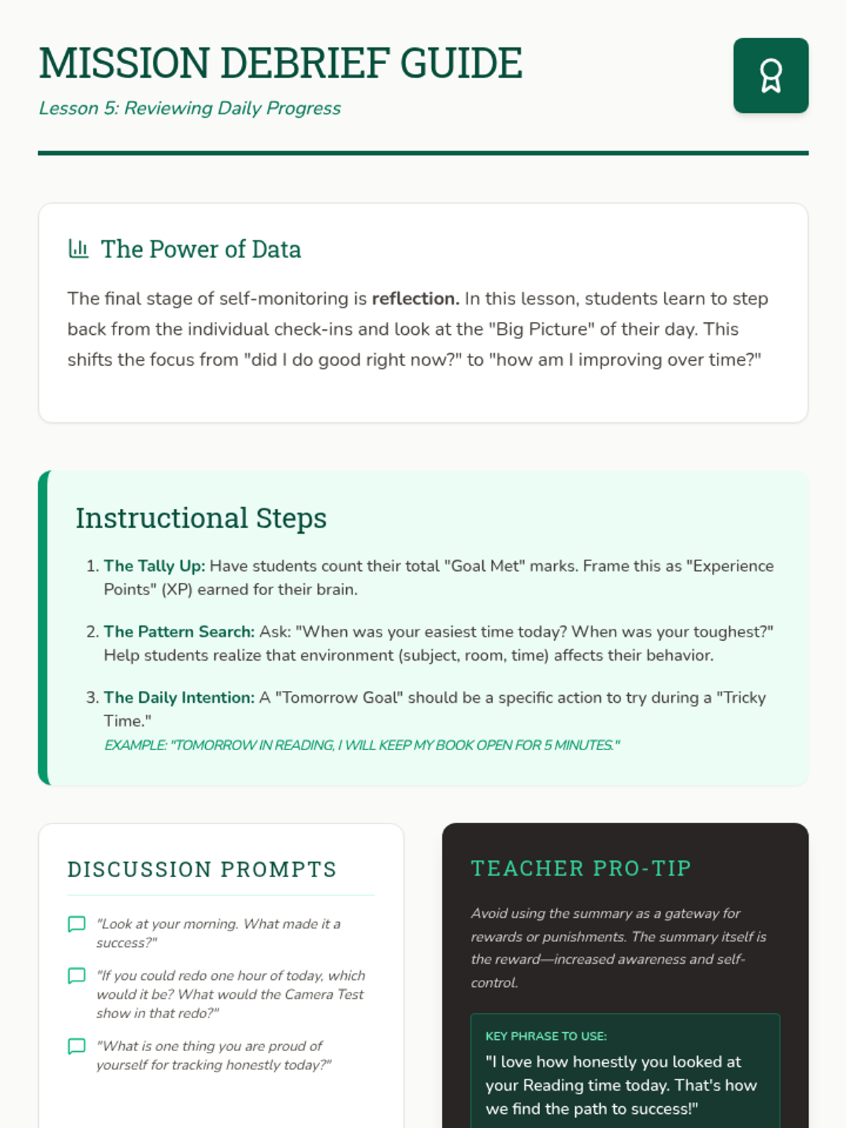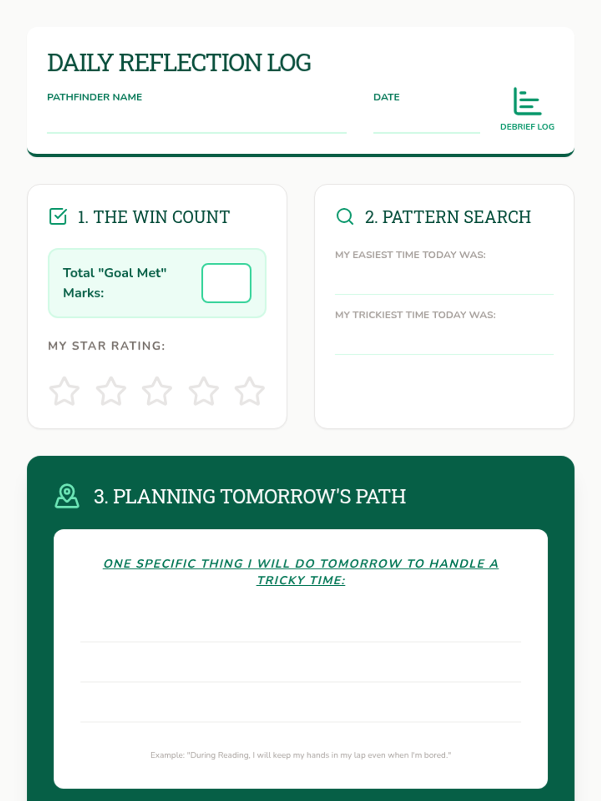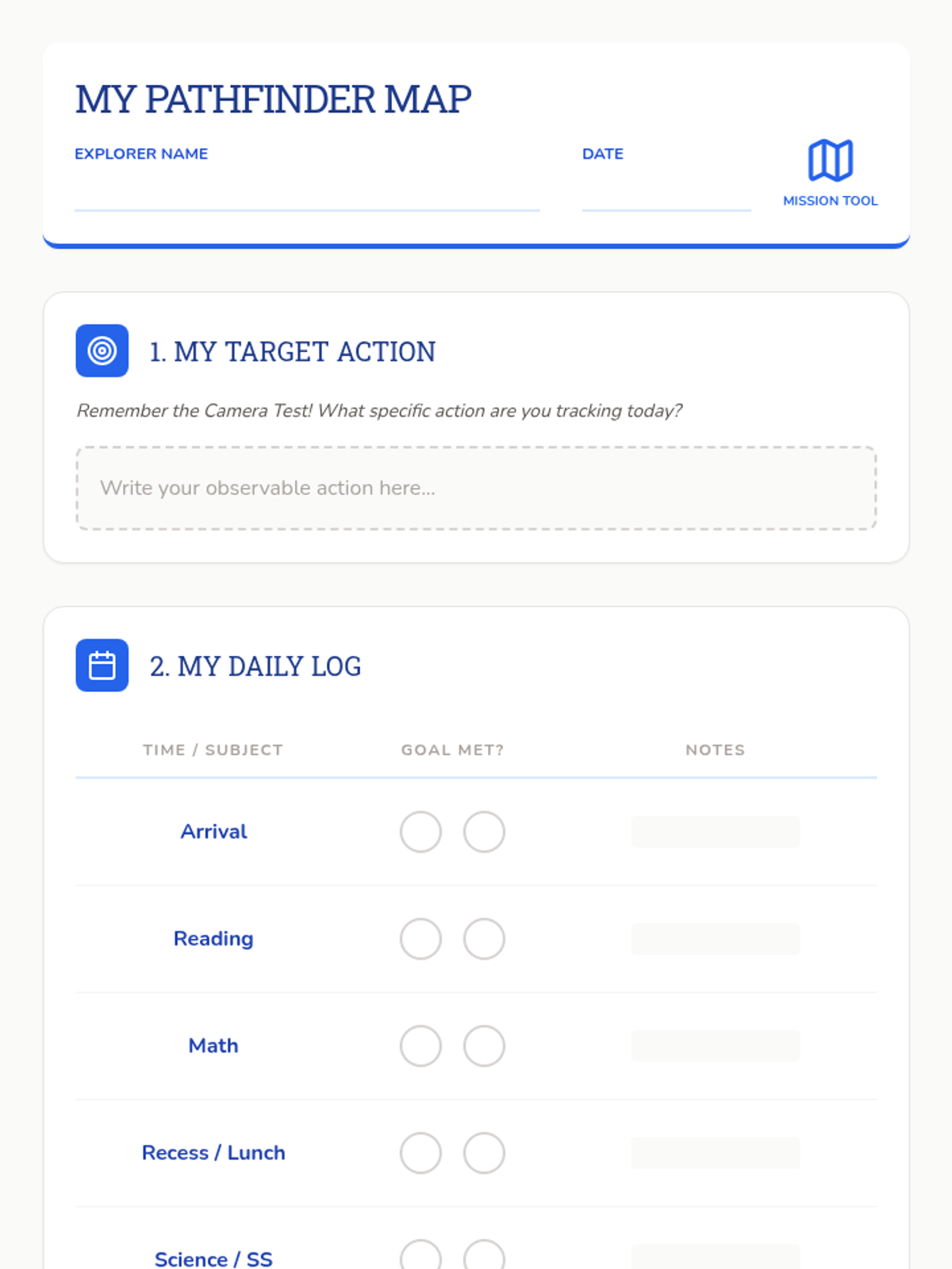 A 5-lesson sequence for 3rd graders on self-monitoring and behavior tracking. Students transition from identifying specific behaviors to using trackers honestly and reflecting on their progress using a 'Pathfinder' theme.