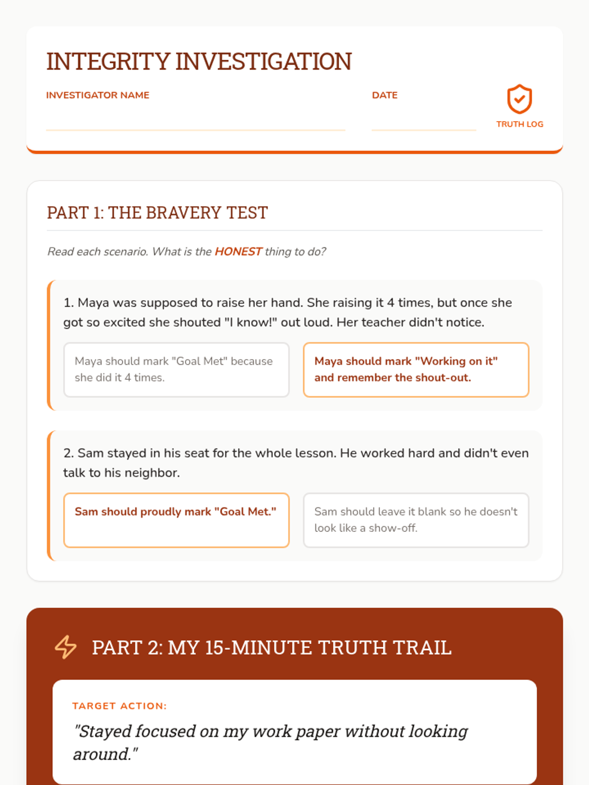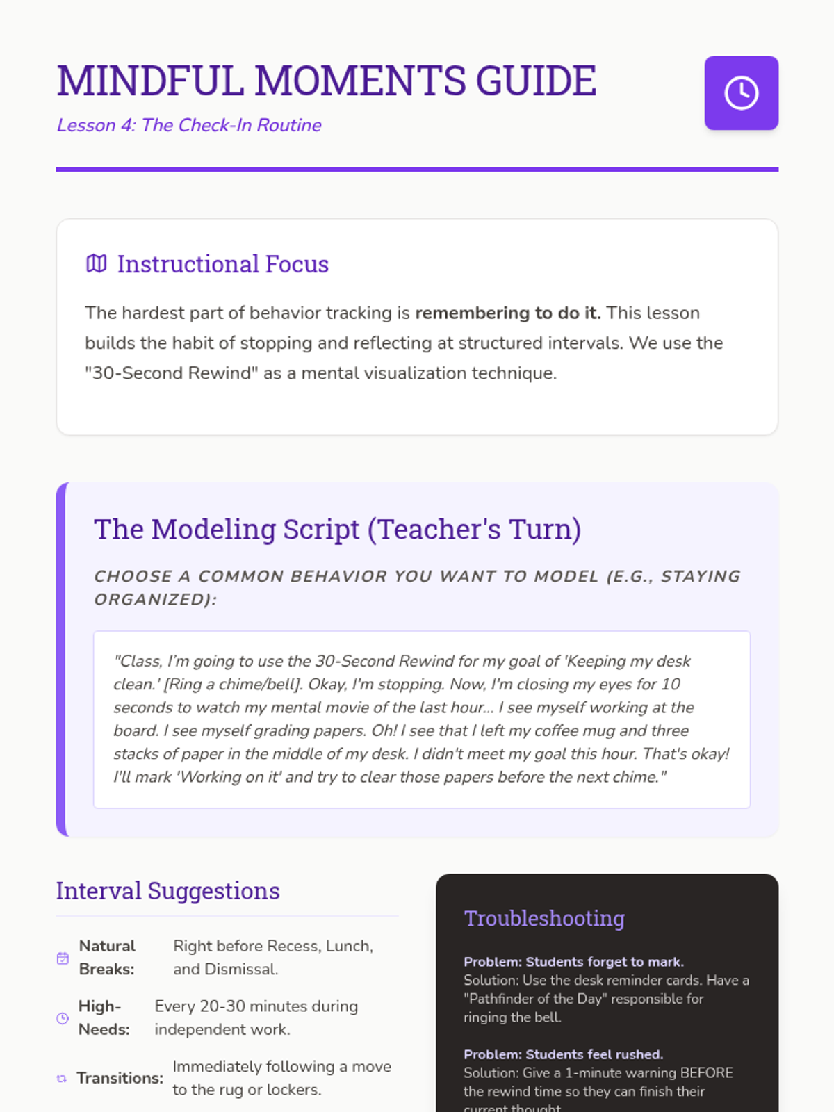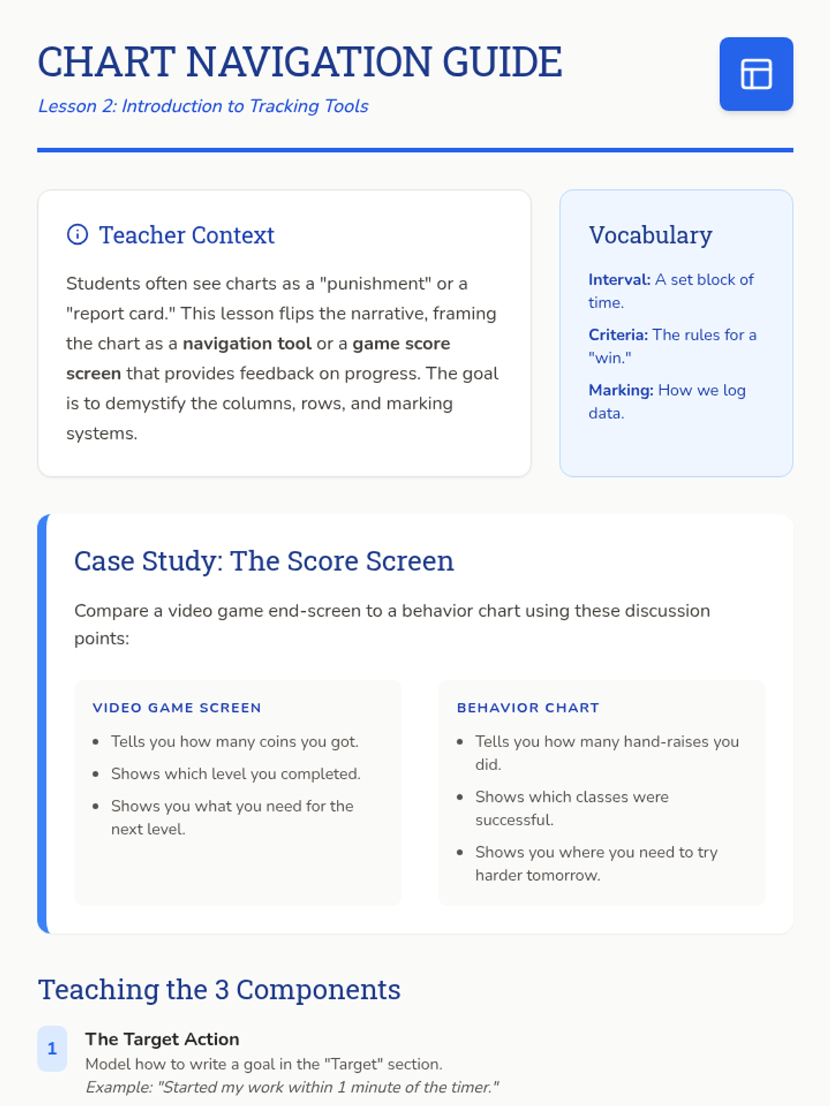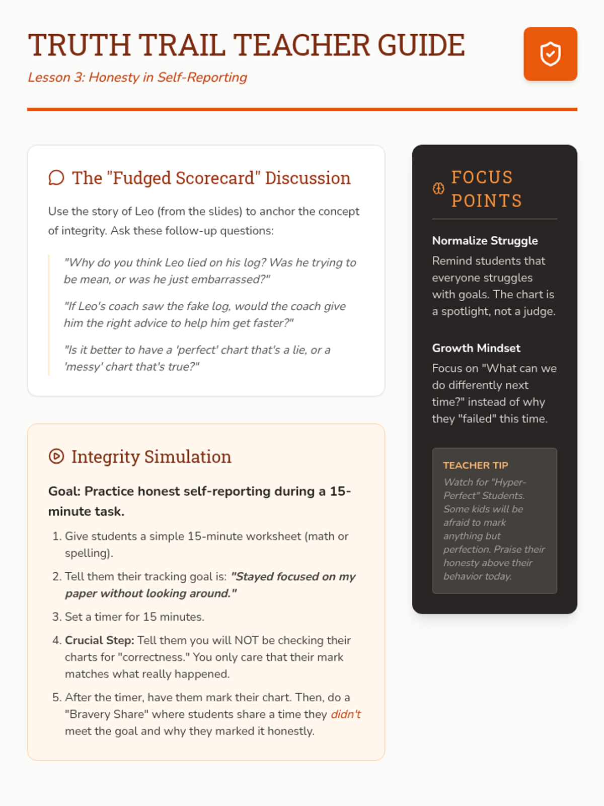 A 5-lesson sequence for 3rd graders on self-monitoring and behavior tracking. Students transition from identifying specific behaviors to using trackers honestly and reflecting on their progress using a 'Pathfinder' theme.