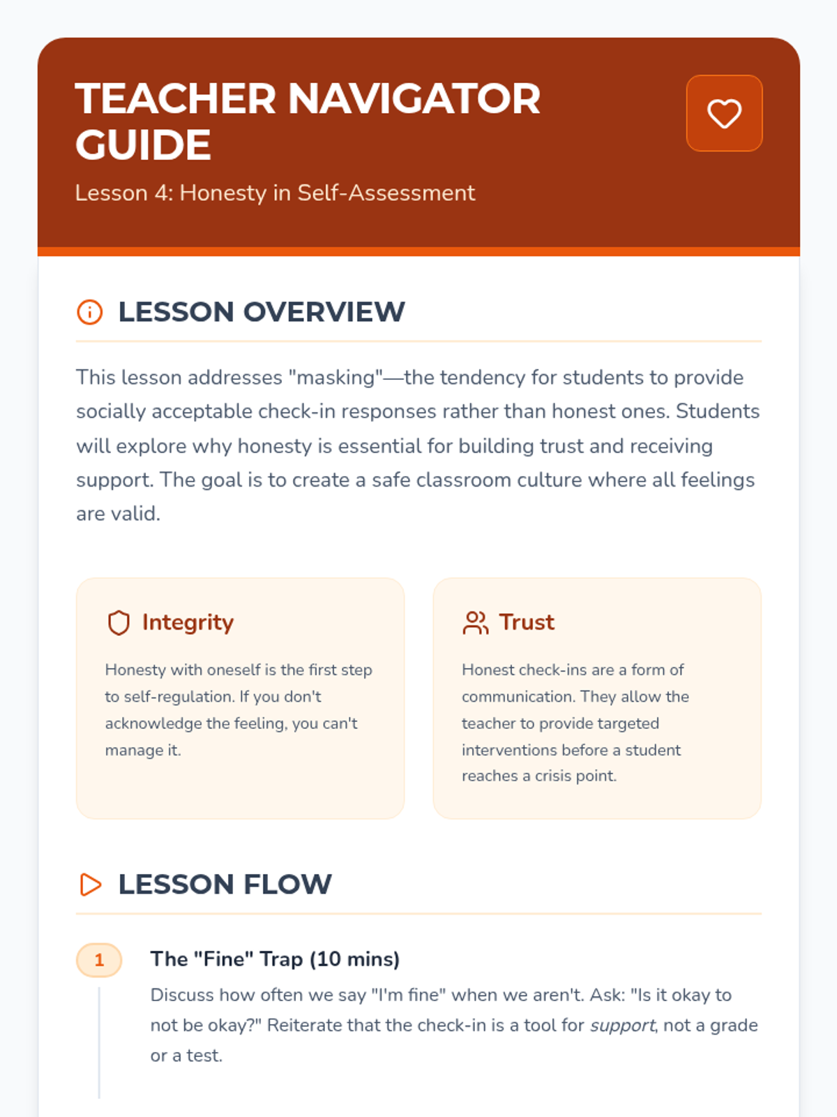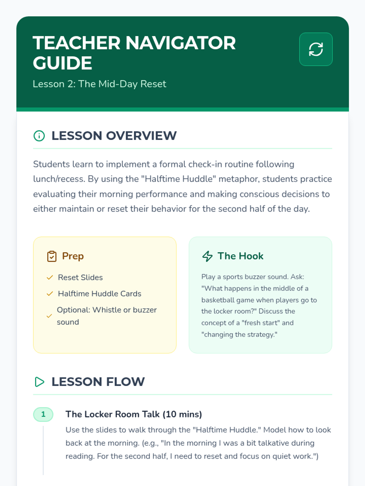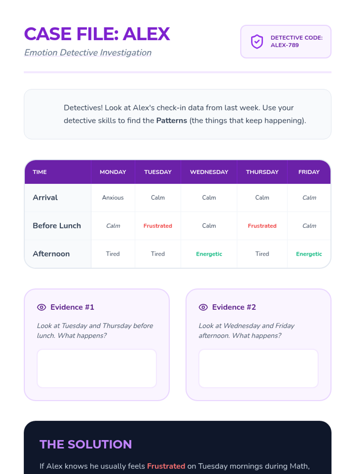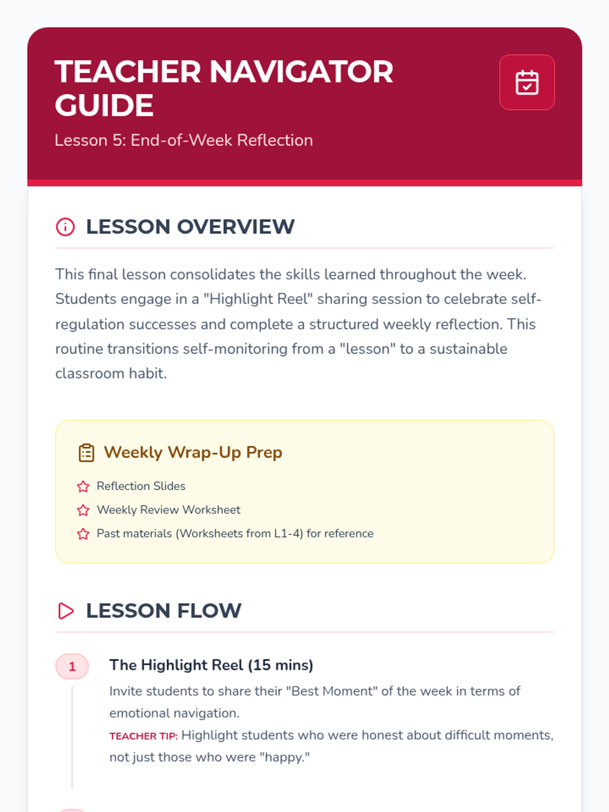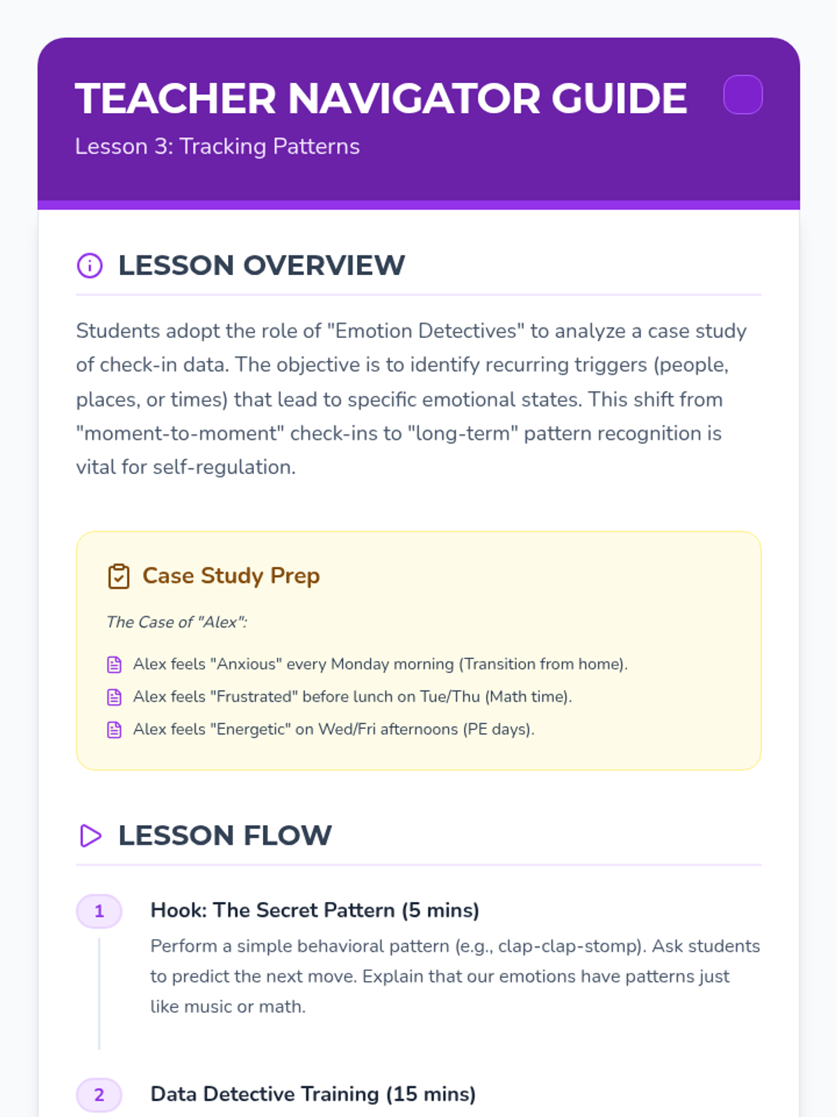 This mastery-based sequence teaches students to view check-ins not just as a morning event, but as a continuous cycle of self-monitoring and reflection. Students learn to track their emotional patterns over time, identifying triggers and successful interventions to develop long-term metacognitive habits.
