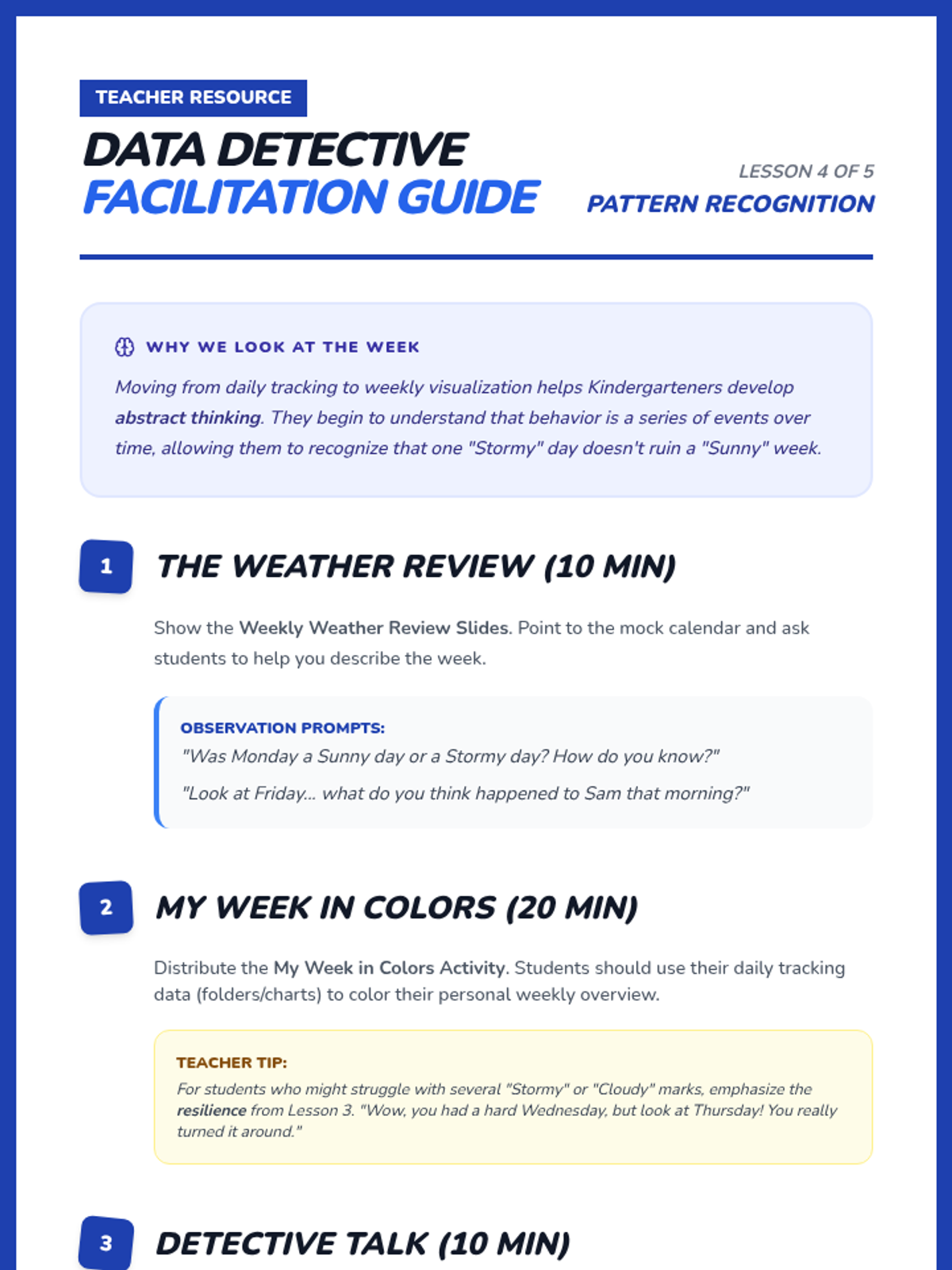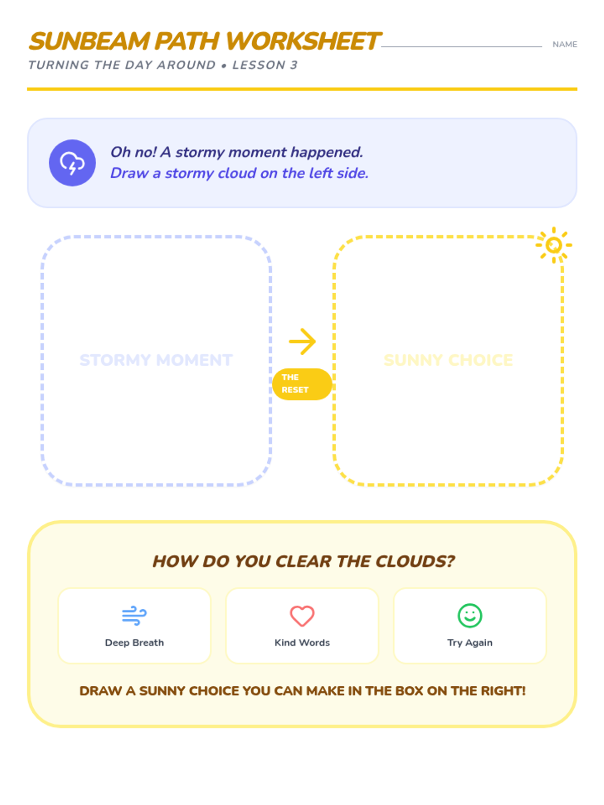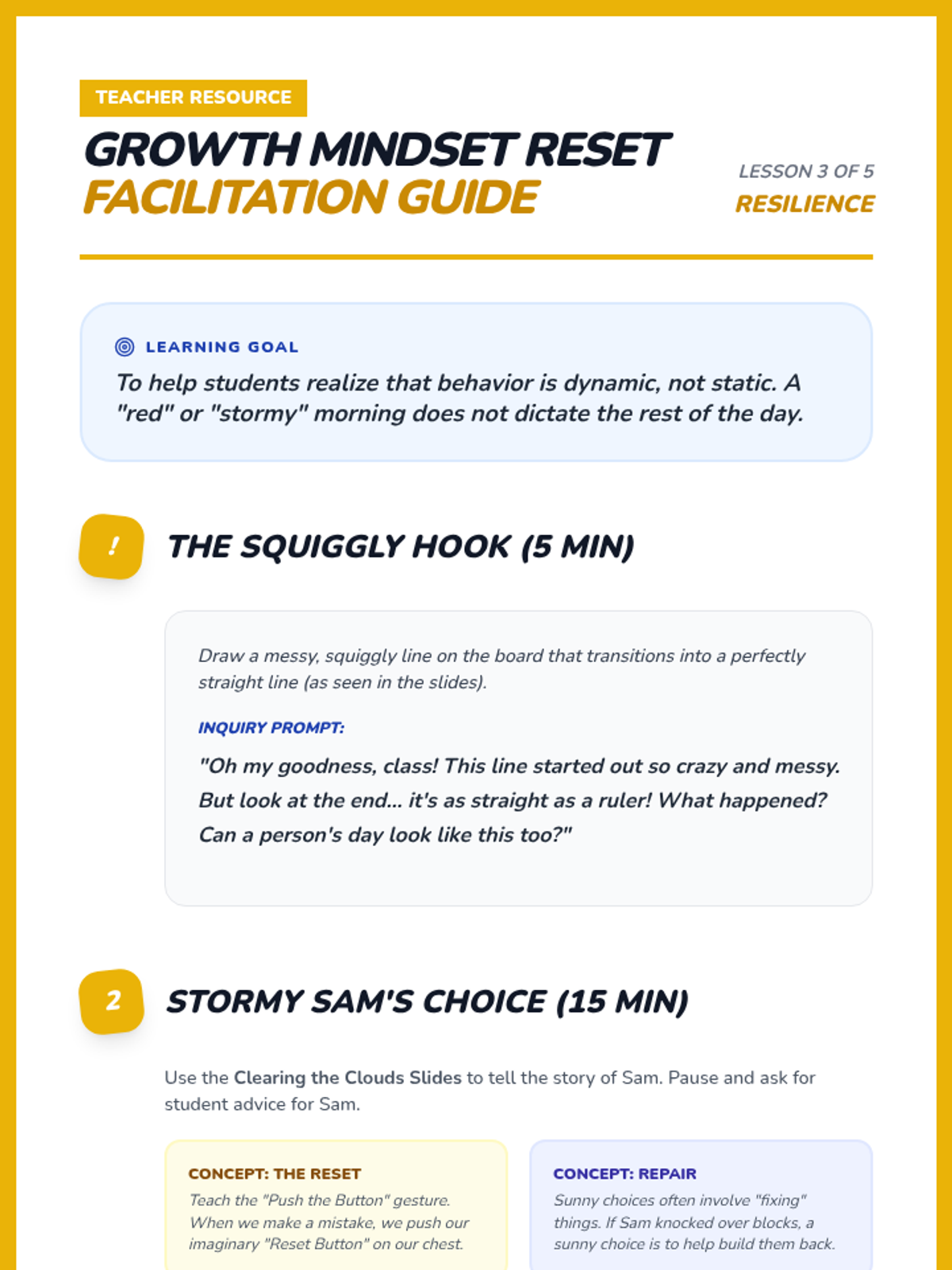A sequence for Kindergarteners to develop self-reflection skills through weather-based behavior metaphors. Students learn to identify their internal states, practice mid-day self-assessment, and understand how to turn their day around.