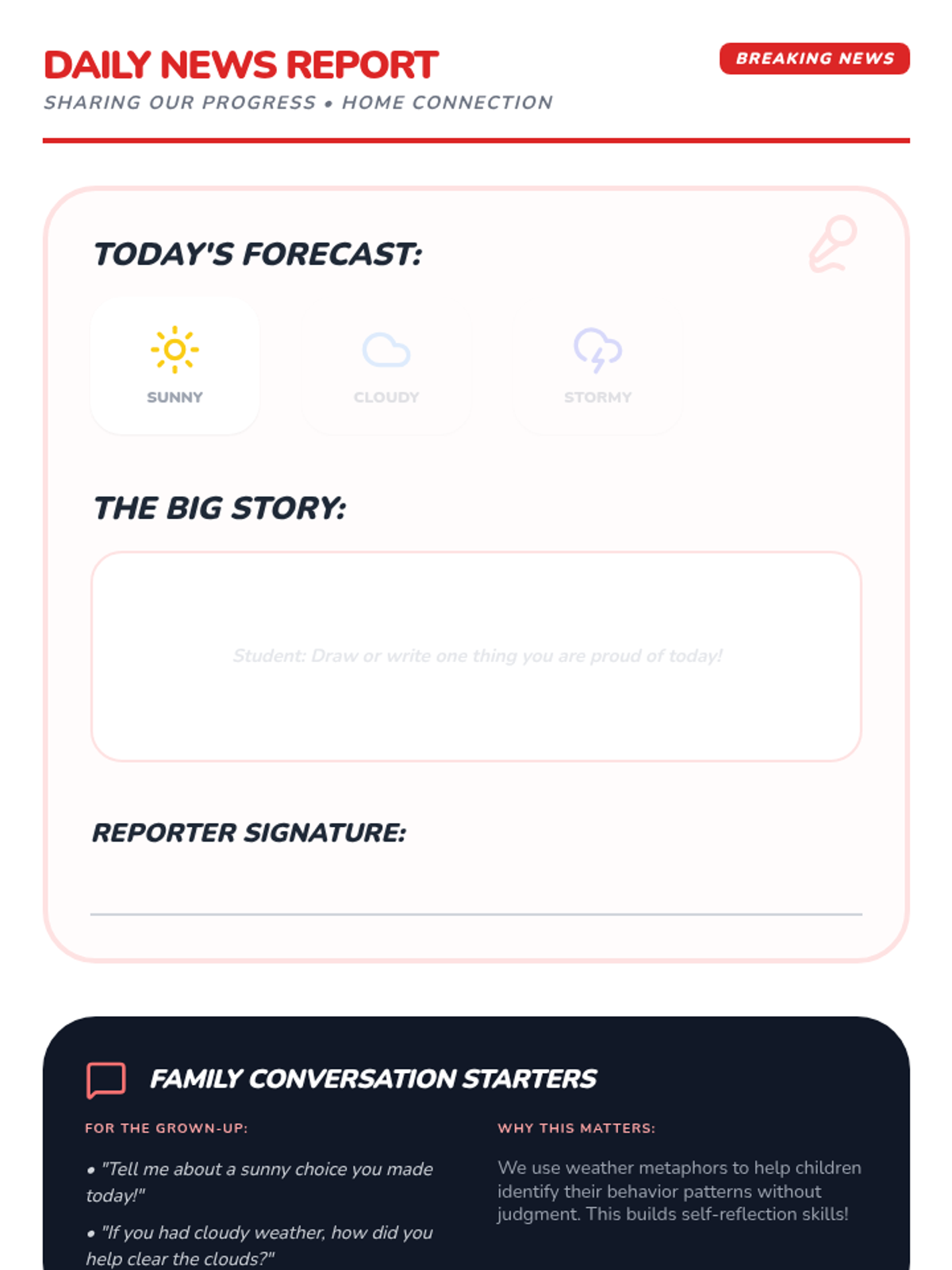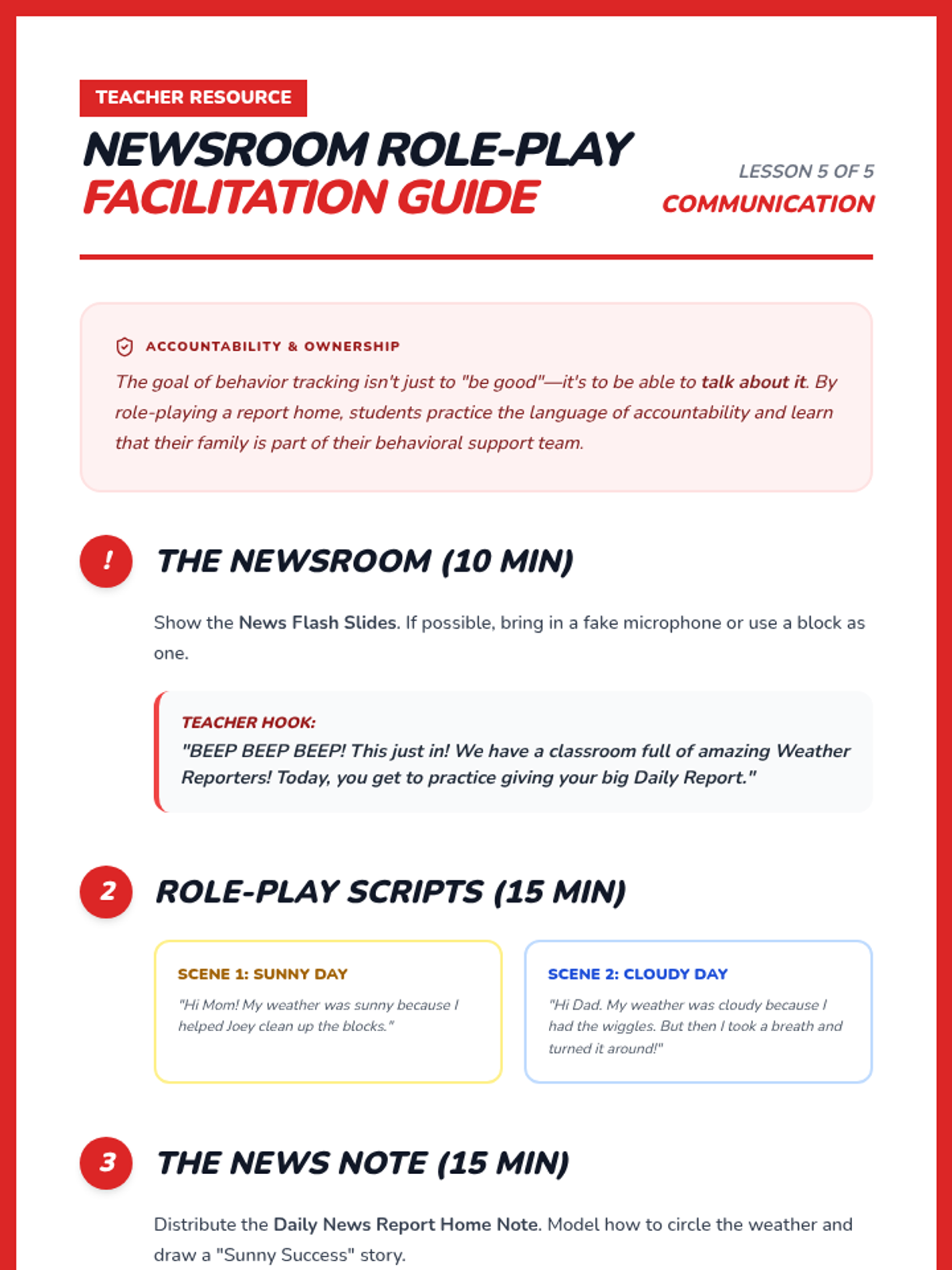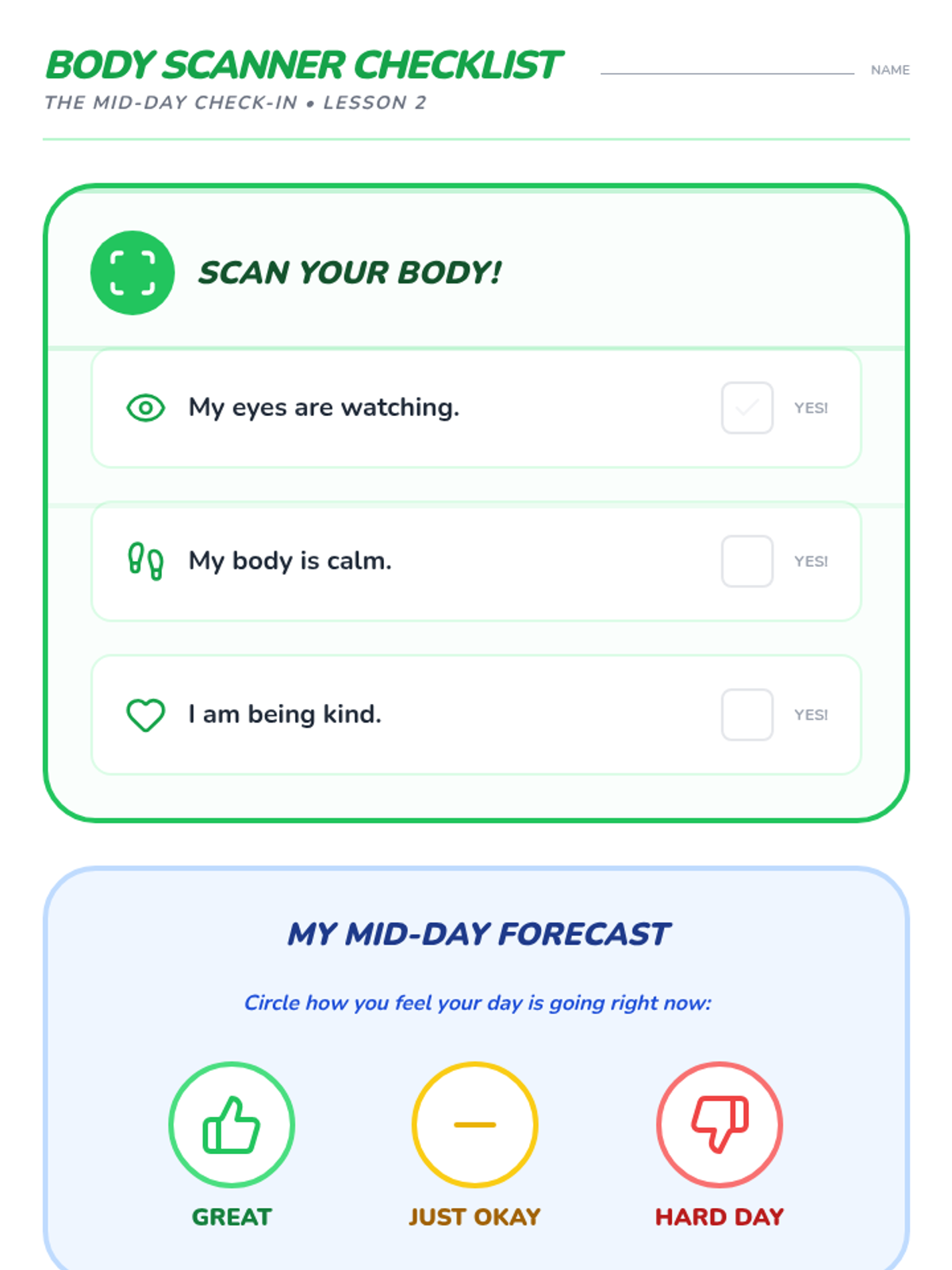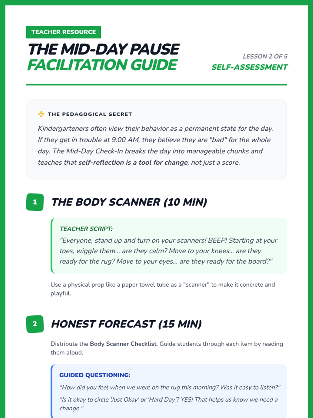 A sequence for Kindergarteners to develop self-reflection skills through weather-based behavior metaphors. Students learn to identify their internal states, practice mid-day self-assessment, and understand how to turn their day around.