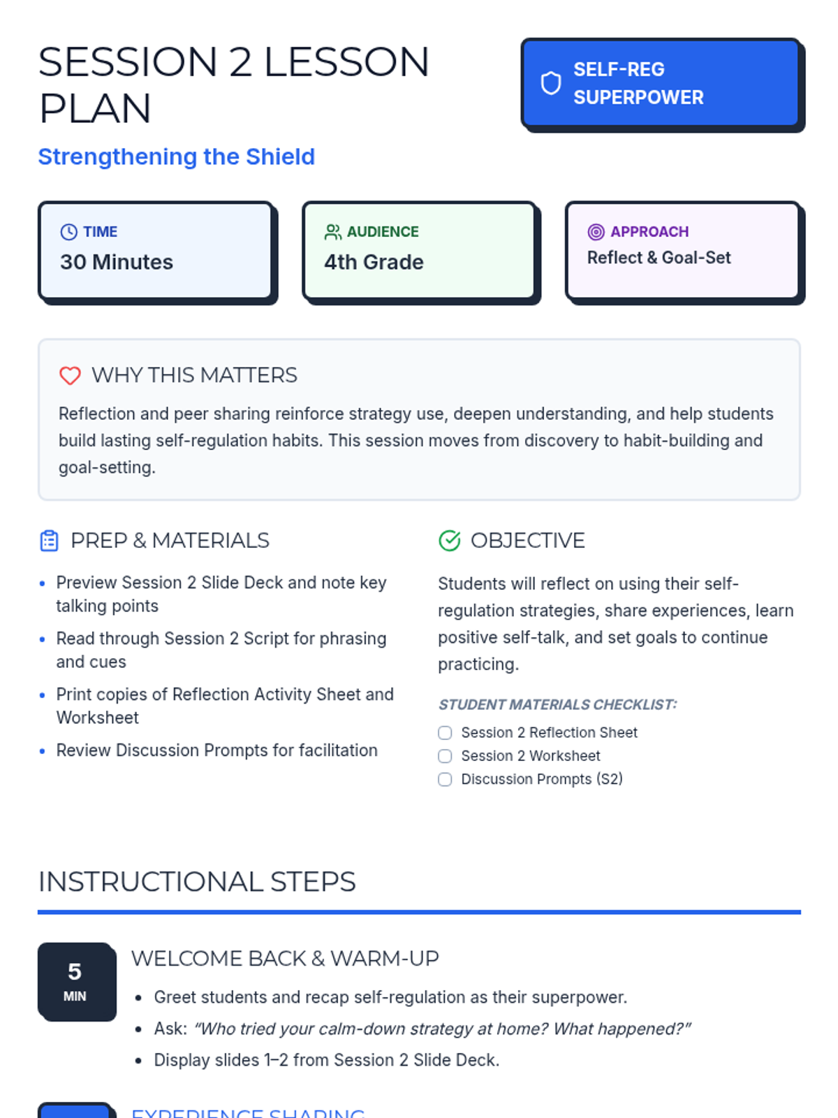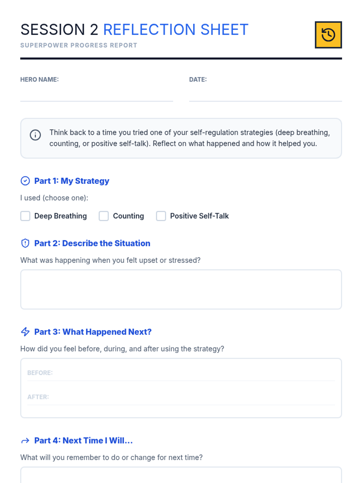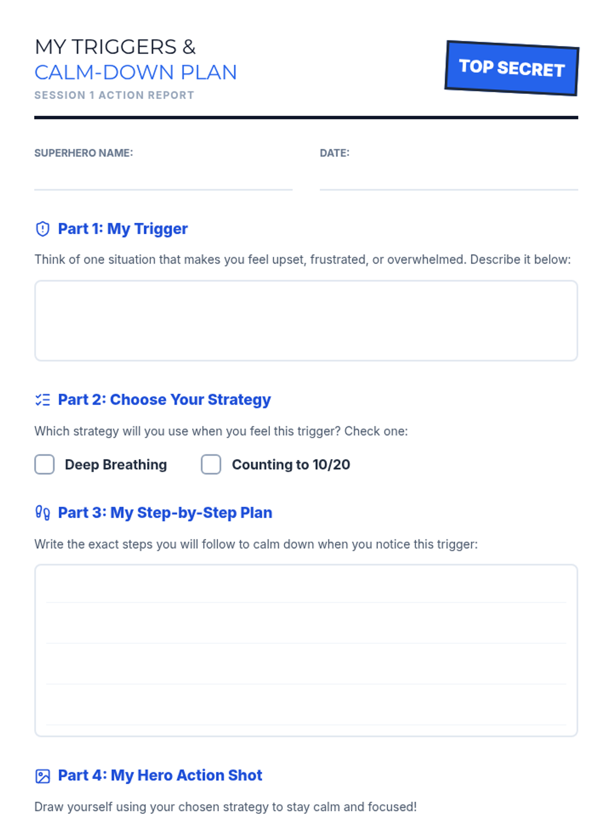 A two-part group lesson series for fourth graders designed to teach self-regulation as a "superpower." Students identify emotional triggers, learn calming strategies like deep breathing and counting, and develop personalized action plans.