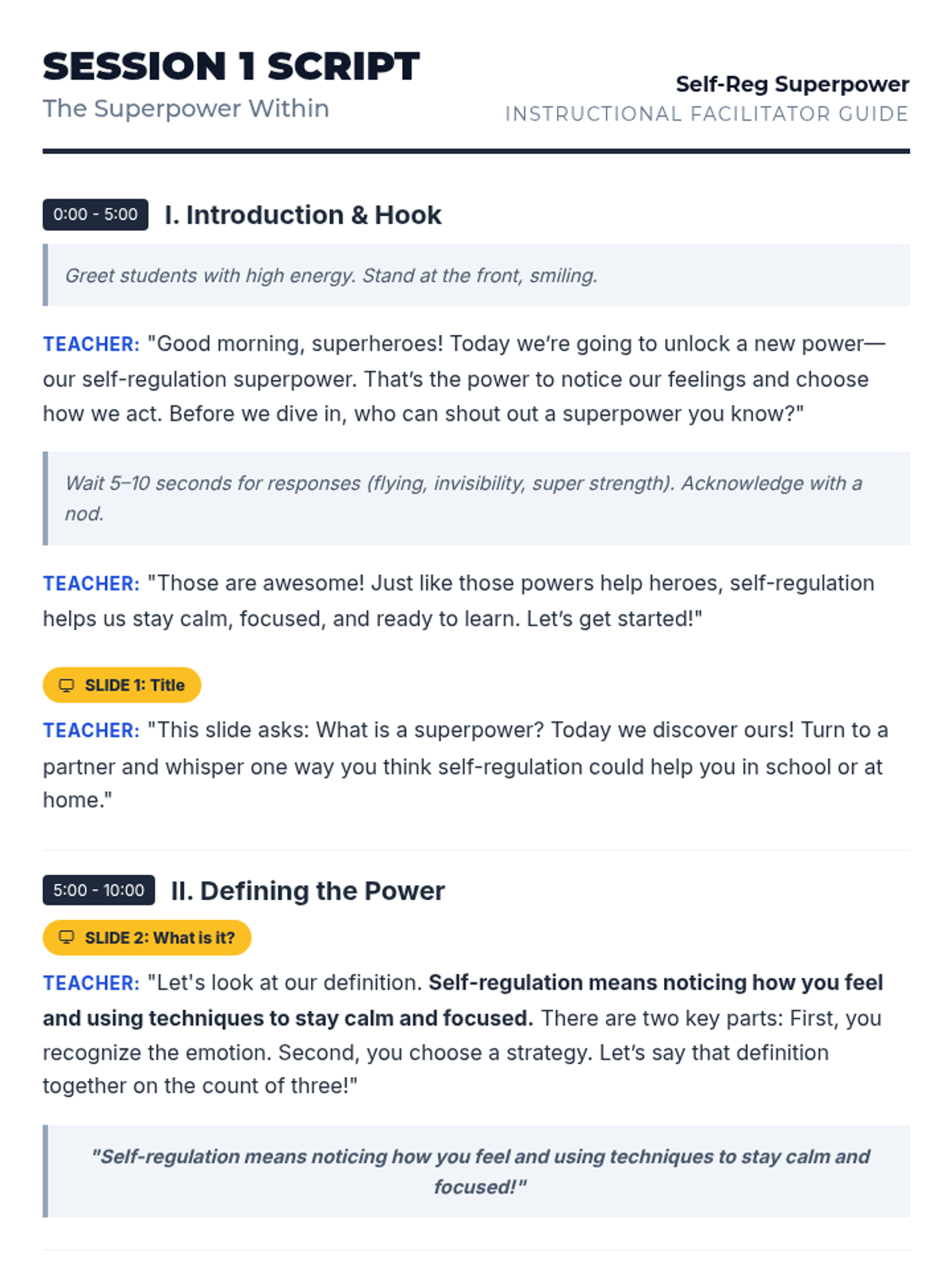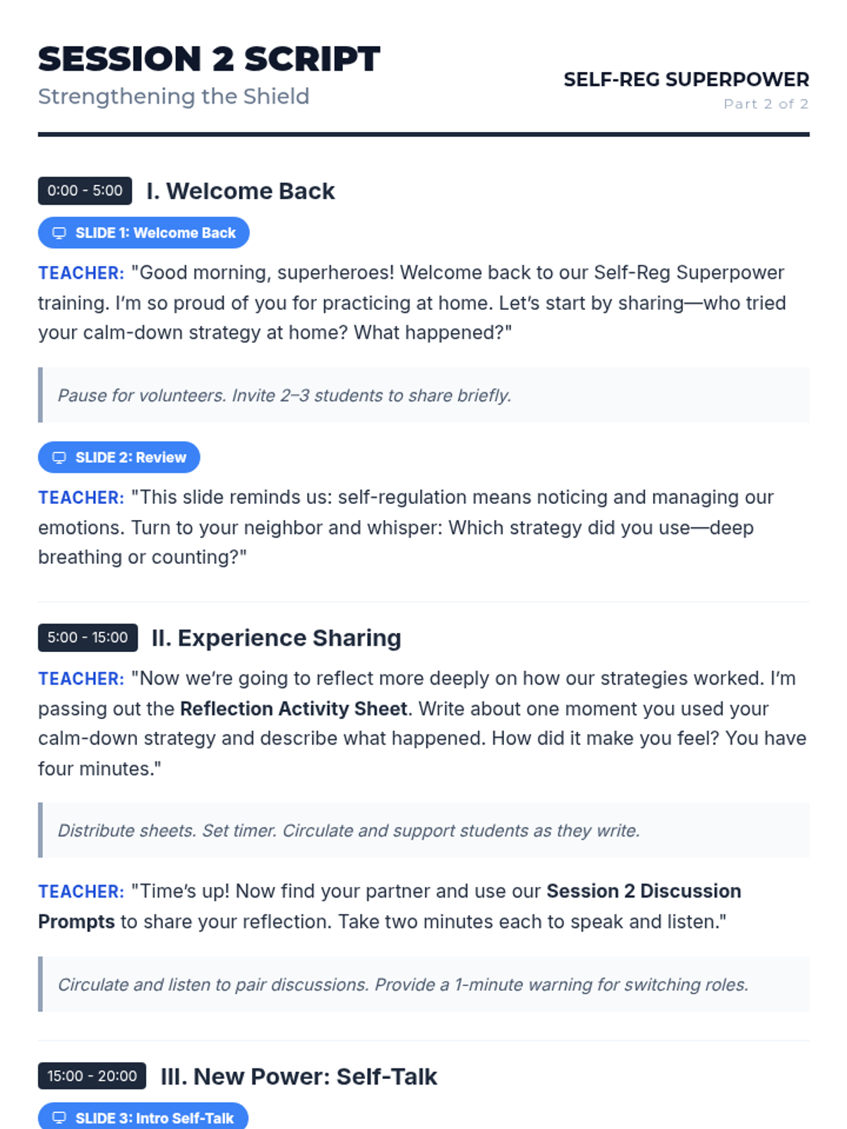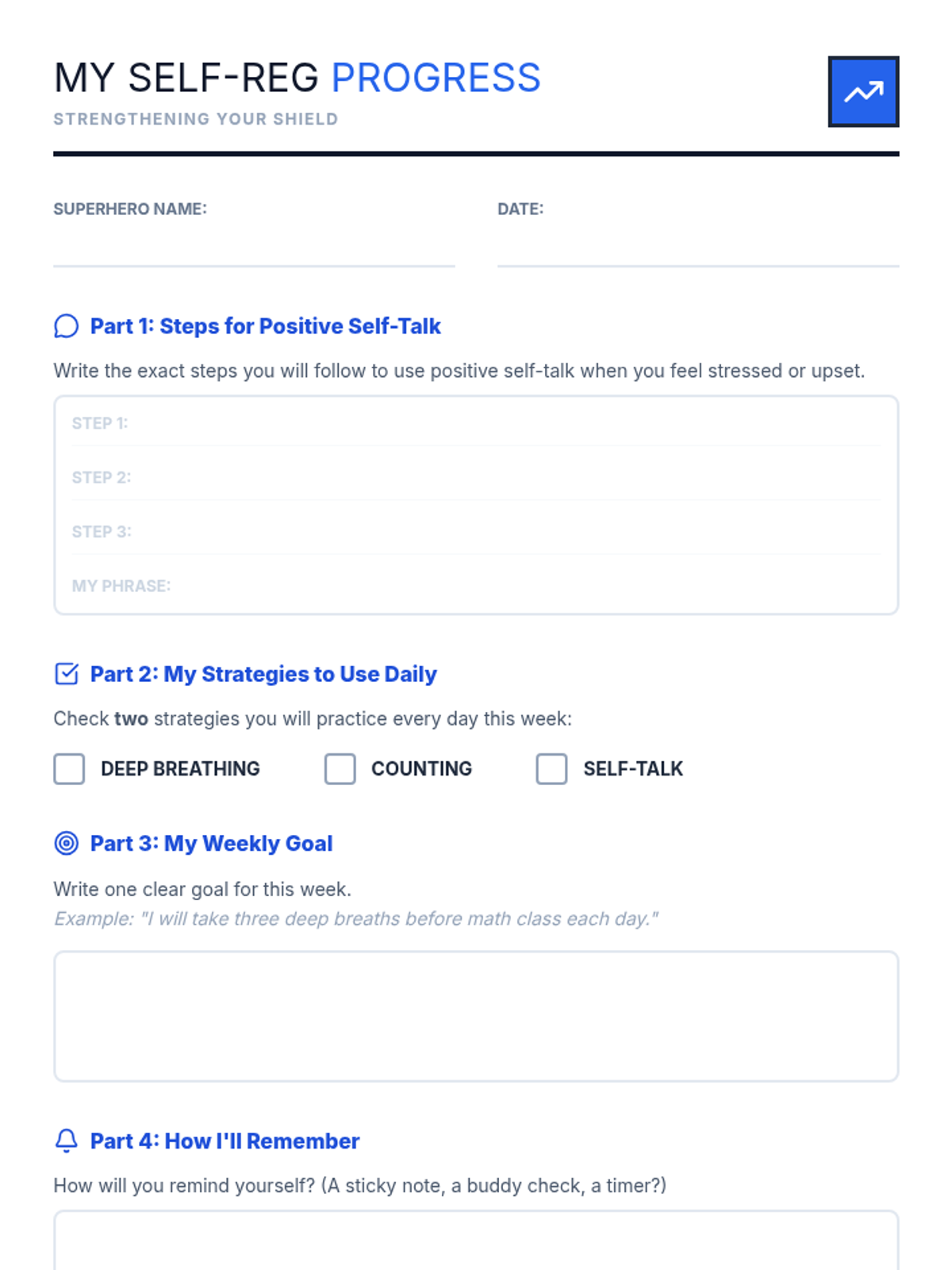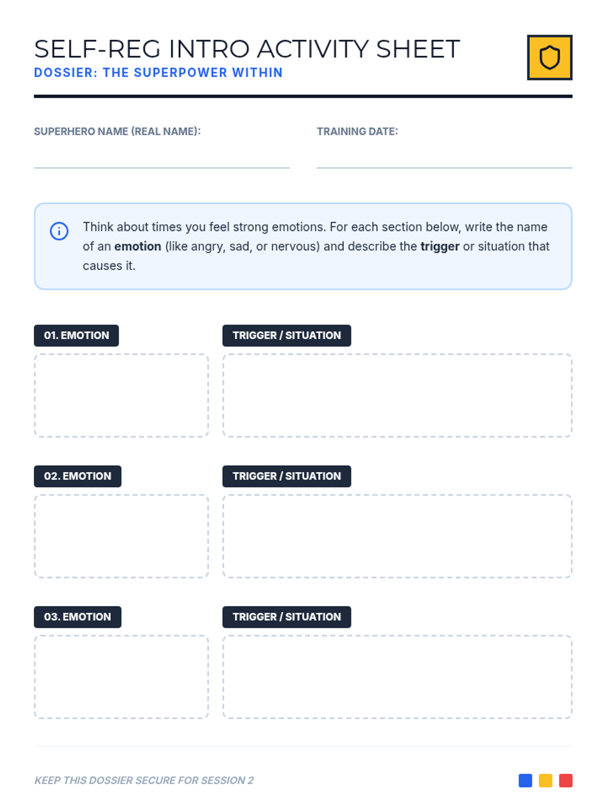 A two-part group lesson series for fourth graders designed to teach self-regulation as a "superpower." Students identify emotional triggers, learn calming strategies like deep breathing and counting, and develop personalized action plans.