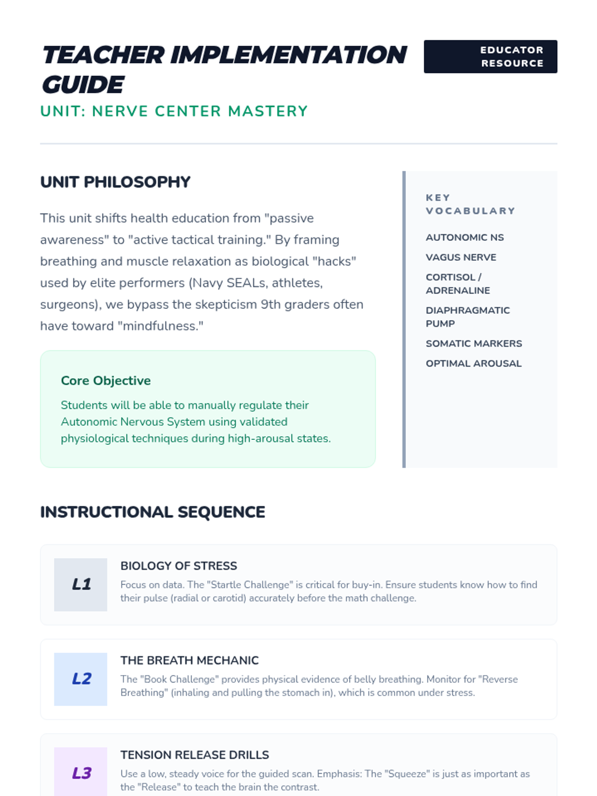 A comprehensive 9th-grade health unit where students investigate the biological mechanisms of stress and master practical breathing and relaxation techniques to build a personalized self-regulation protocol.