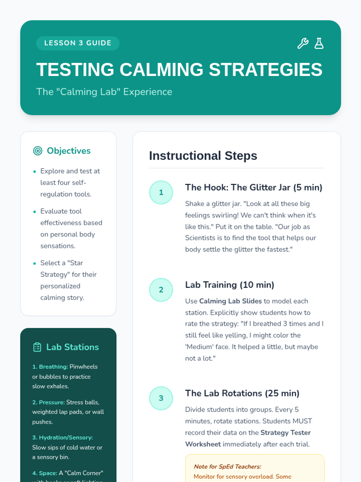 A 4-lesson sequence designed for preschool students to learn and practice emotional regulation through breathing, movement, and sensory exploration. The lessons use a 'Peaceful Pond' theme with friendly animal motifs.