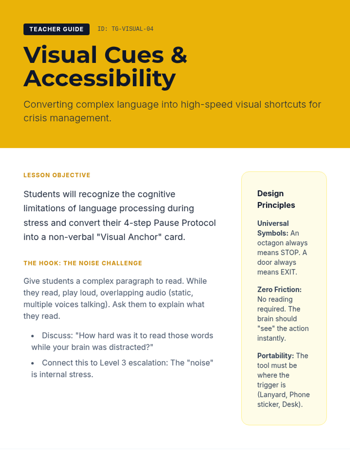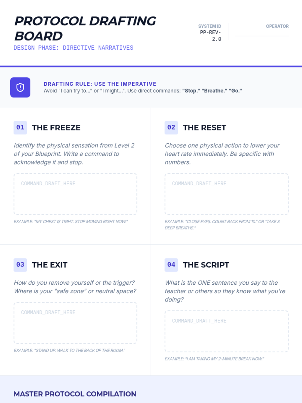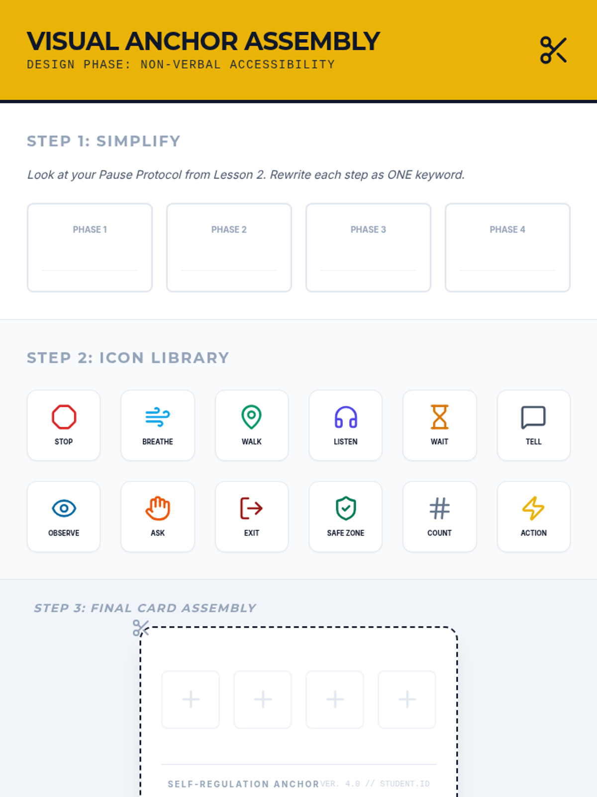 A comprehensive sequence for 12th-grade students to master emotional self-regulation through the creation of personalized social stories and 'if/then' narratives. Students progress from identifying physiological triggers to designing and simulating visual regulation protocols.